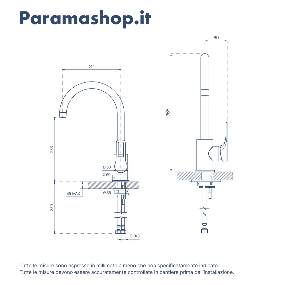 La base ha un diametro di 6 cm, assicurando stabilità e compatibilità con i fori standard. L’azionamento avviene tramite una leva monocomando laterale, per la regolazione precisa di temperatura e flusso dell’acqua. All’interno è integrata una cartuccia da 35 mm, elemento standard per impianti domestici.