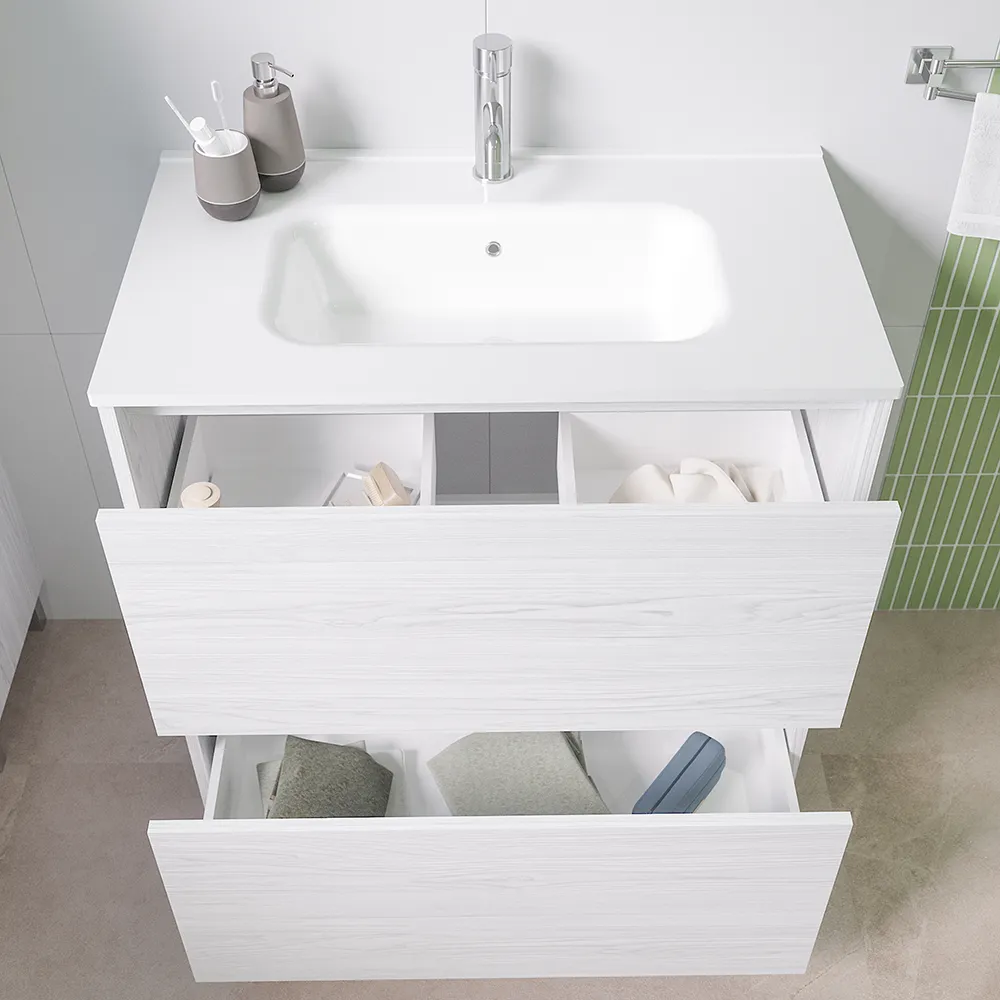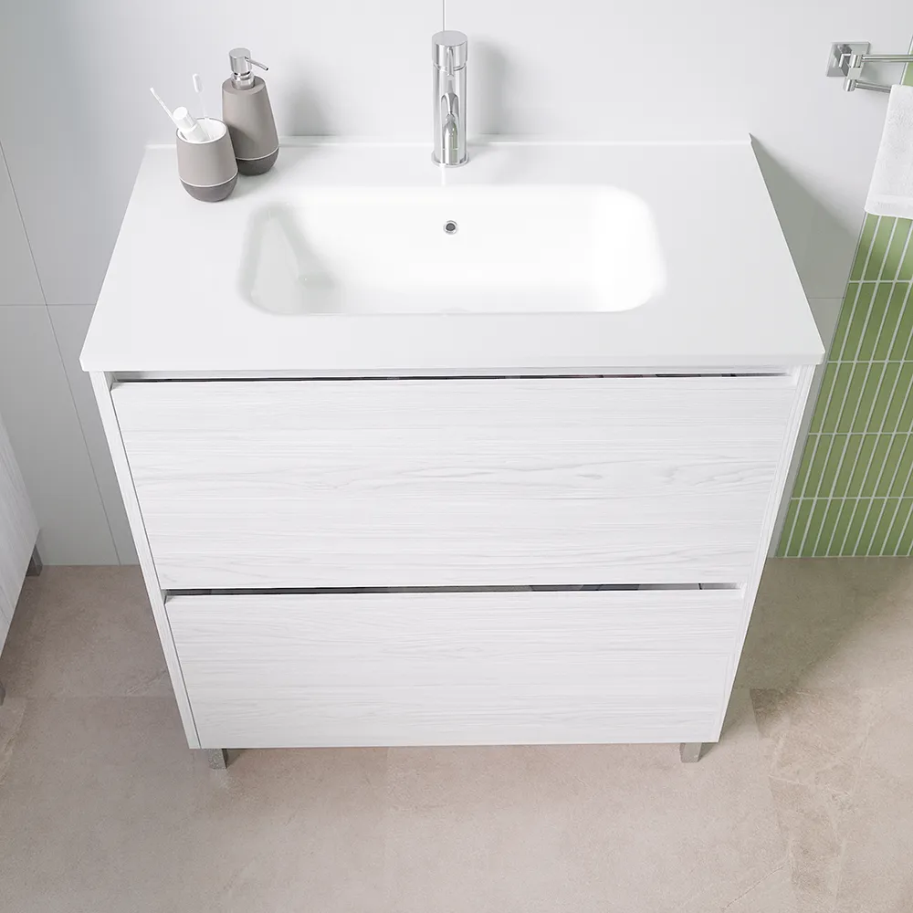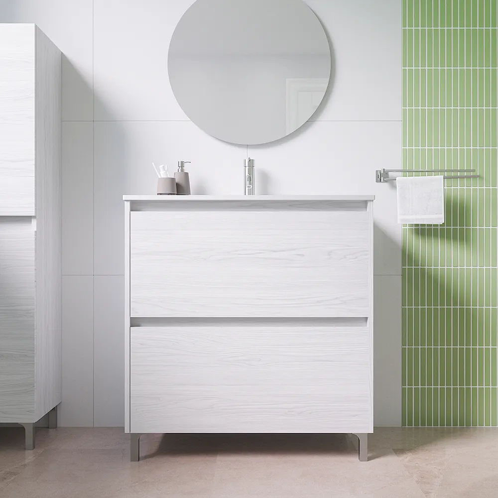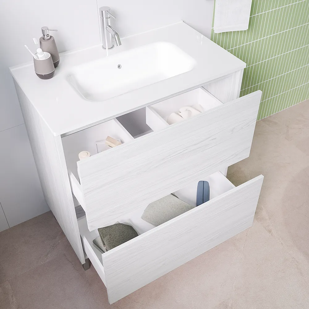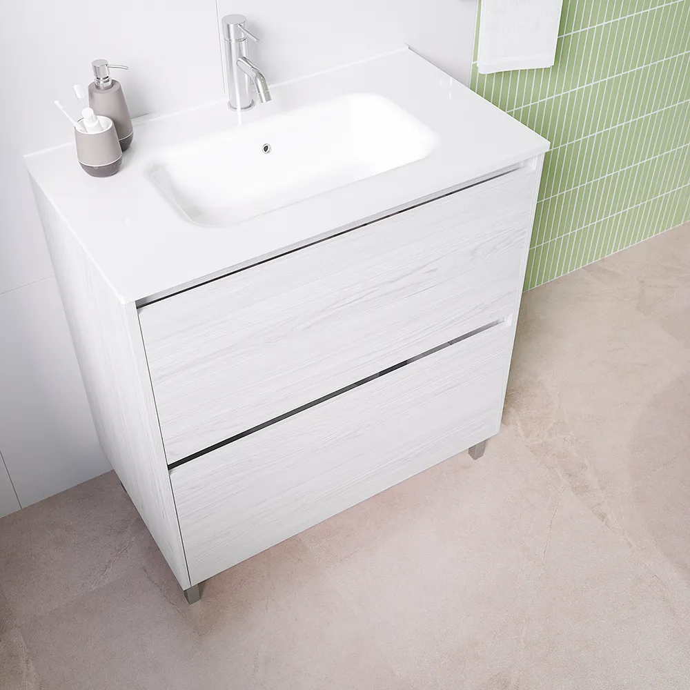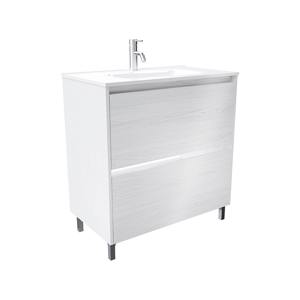 Mobile a terra 100 cm bianco effetto legno con due cassetti e lavabo | Sila