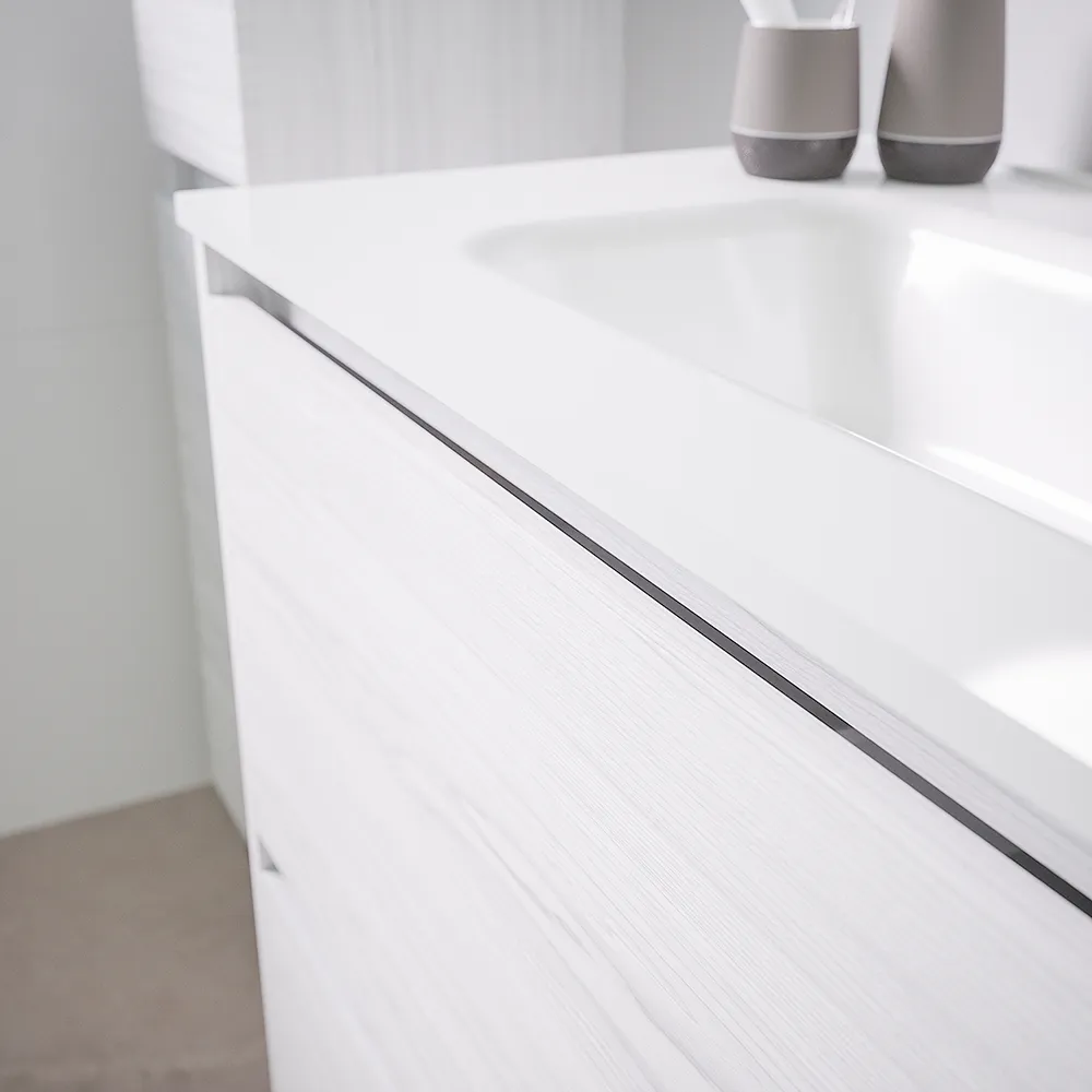 Realizzata con finitura bianco effetto legno, il mobile della serie Sila vanta una resistenza all'acqua e all'umidità, garantendoti una bellezza duratura nel tempo. Le sue linee curve si adattano con eleganza a qualsiasi stile di arredamento, donando un tocco di estrema eleganza al tuo bagno. In più, l'installazione a terra grazie ai piedini regolabili con bordatura ABS garantisce una soluzione solida e stabile per il tuo bagno.