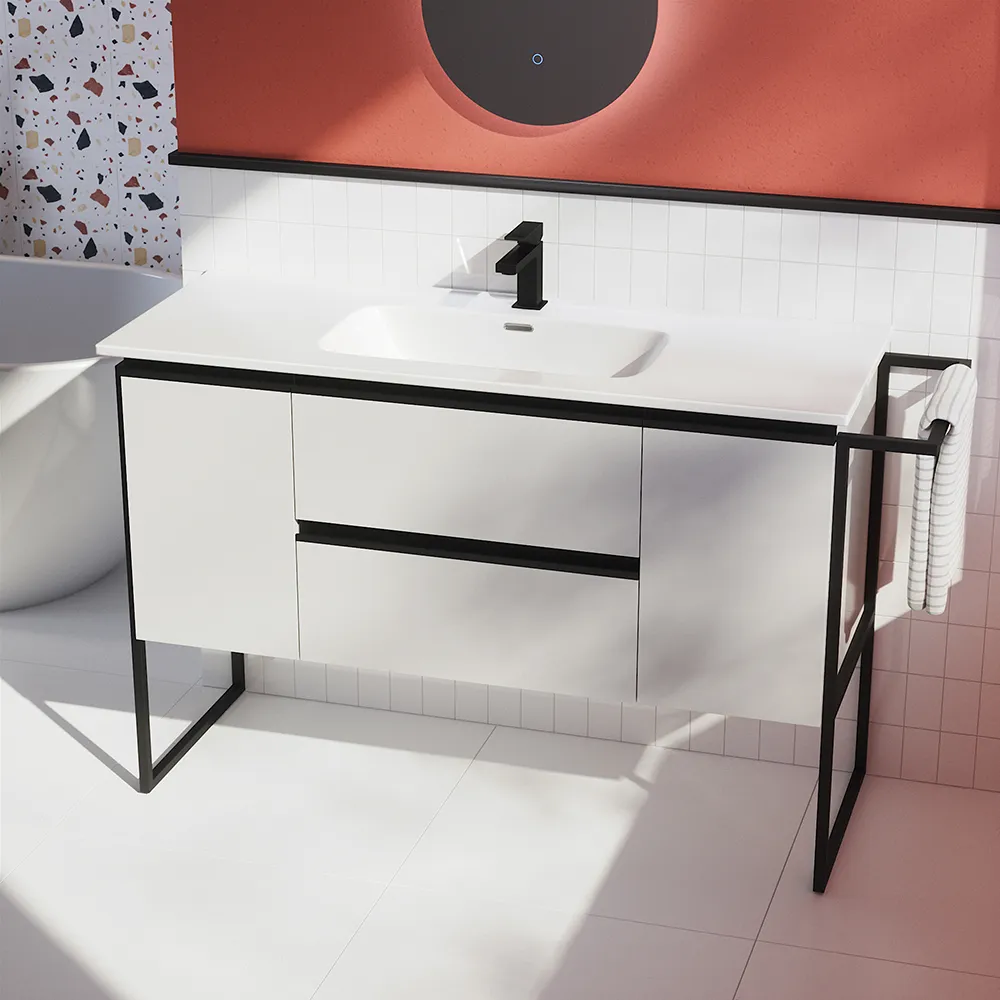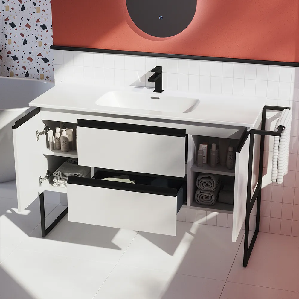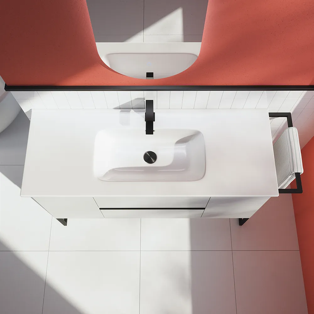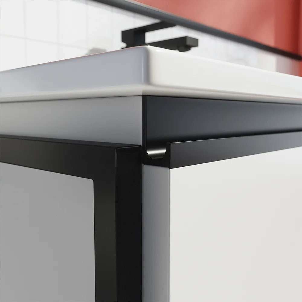 L'inclusione, poi, delle peculiari maniglie (preinserite sui cassetti) in alluminio nero opaco, che richiamano la struttura del mobile, rende Sapo un irresistibile elemento di arredo contemporaneo per il tuo bagno