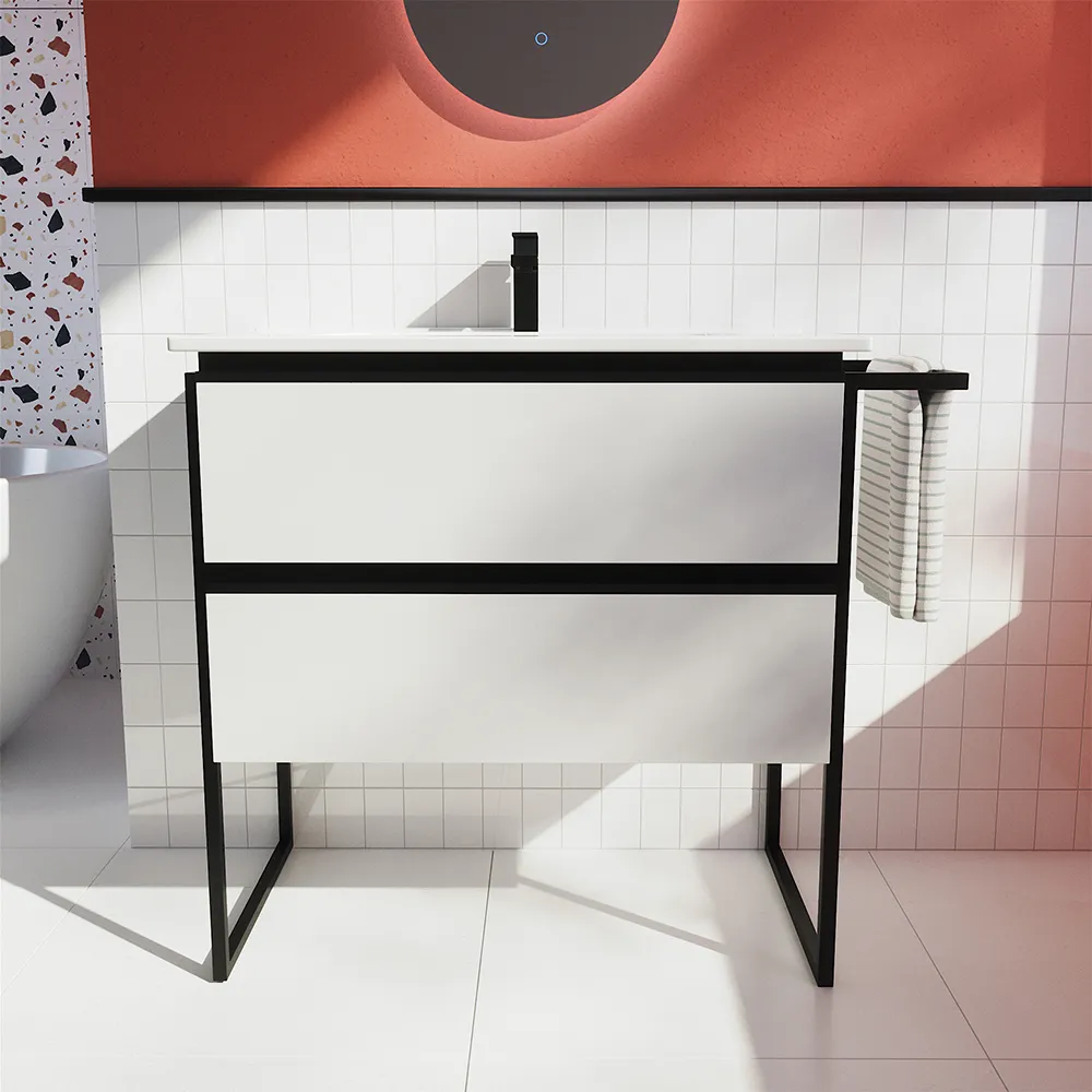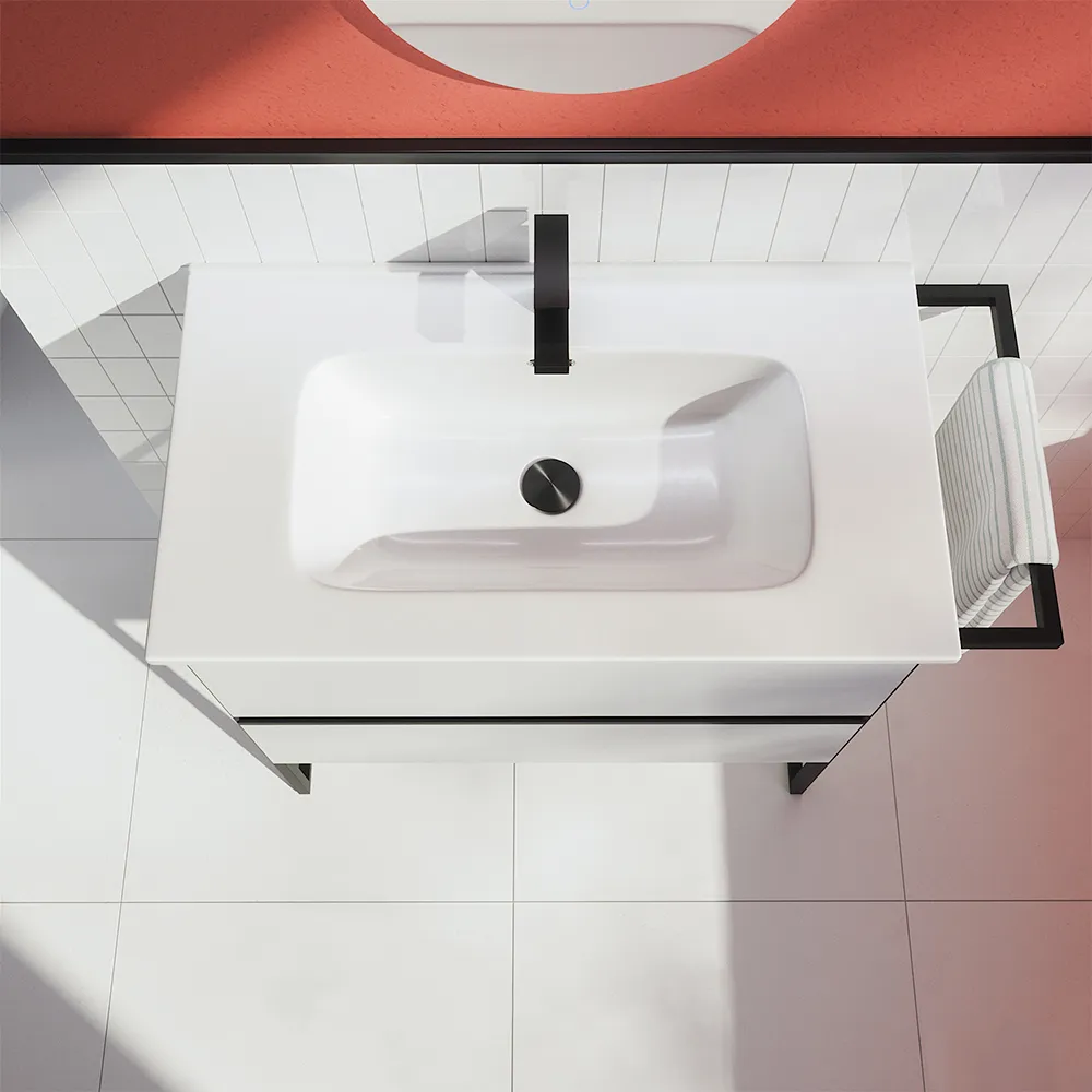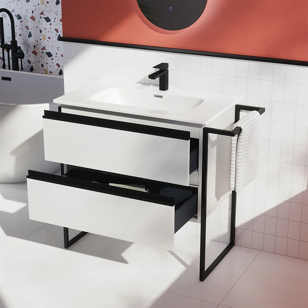 Mobile bagno a terra 80 cm bianco lucido con 2 cassetti soft-close, portasciugamani e lavabo in ceramica mod. Sapo