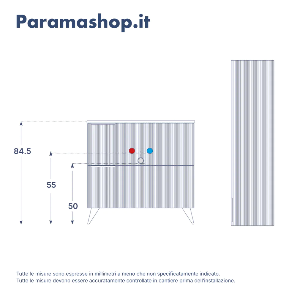 La struttura poggia su piedini in alluminio verniciato da 13,5 cm, studiati per garantire stabilità e al contempo conferire leggerezza visiva all’insieme. Questa altezza permette anche una pulizia agevole sotto il mobile, mantenendo il bagno sempre ordinato e igienico.