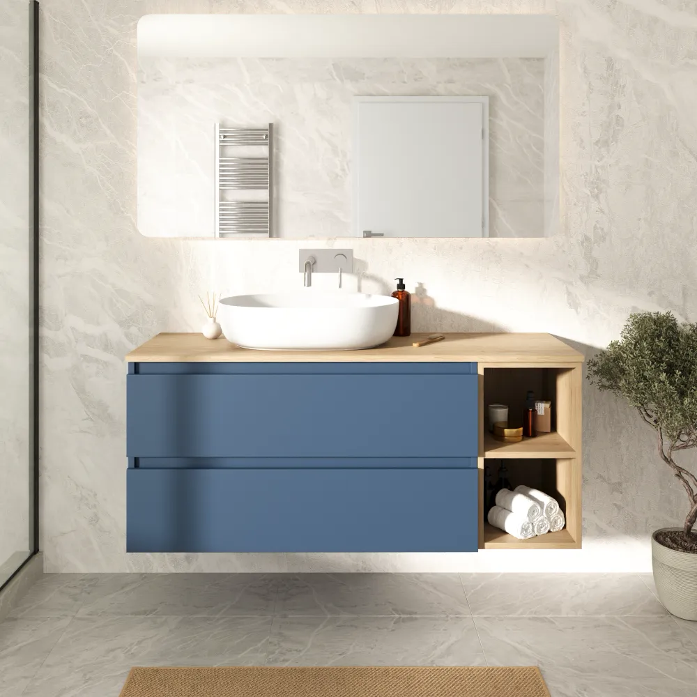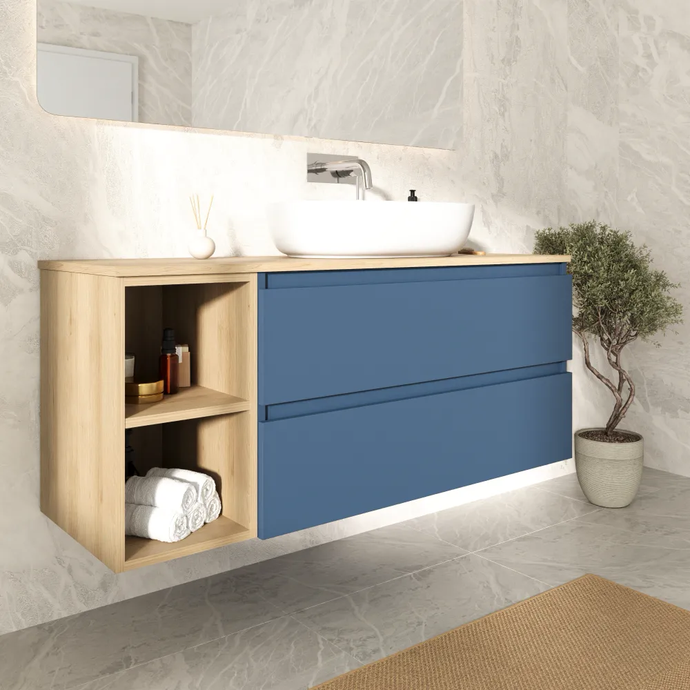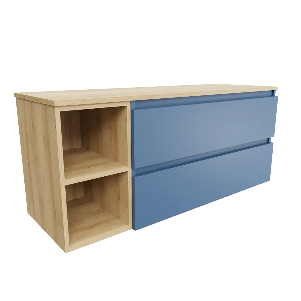 Mobile bagno sospeso 100cm due cassetti alby blue con vano a giorno e top rovere chiaro | Hexa