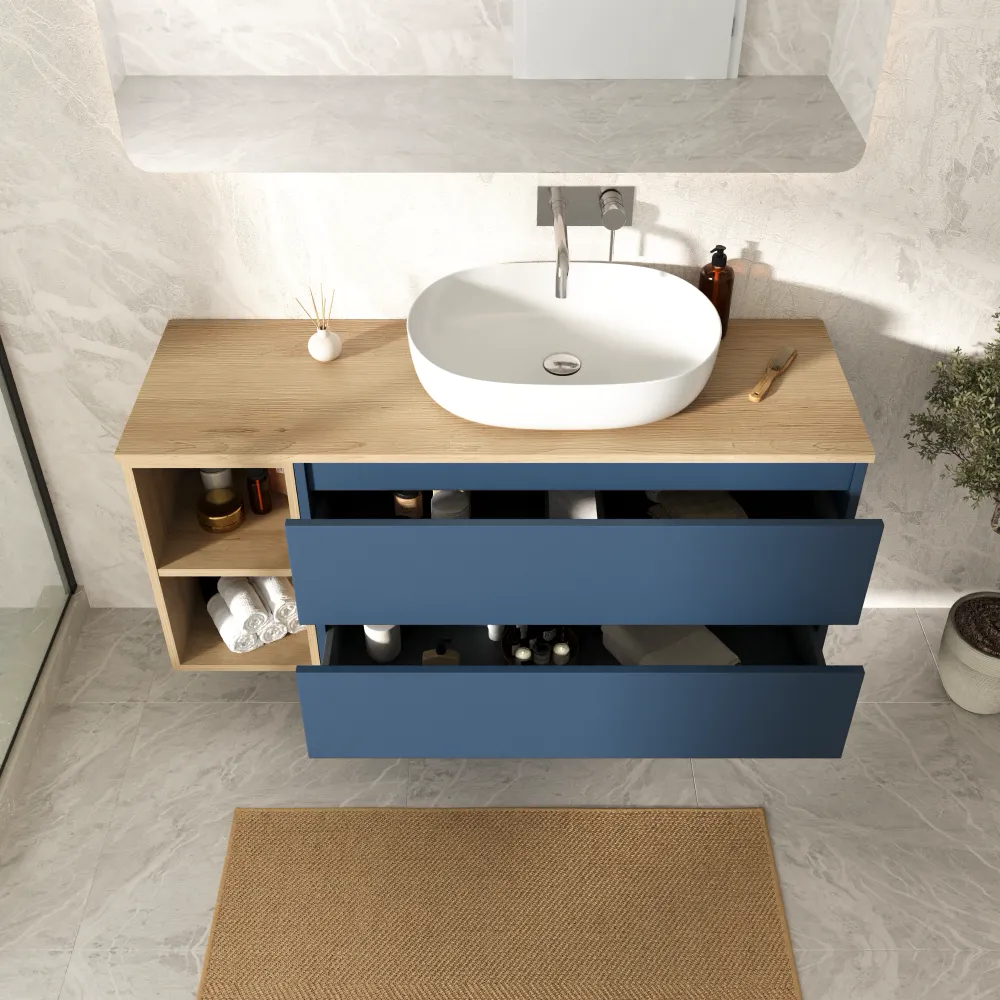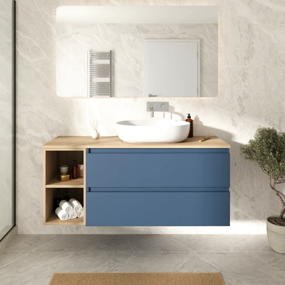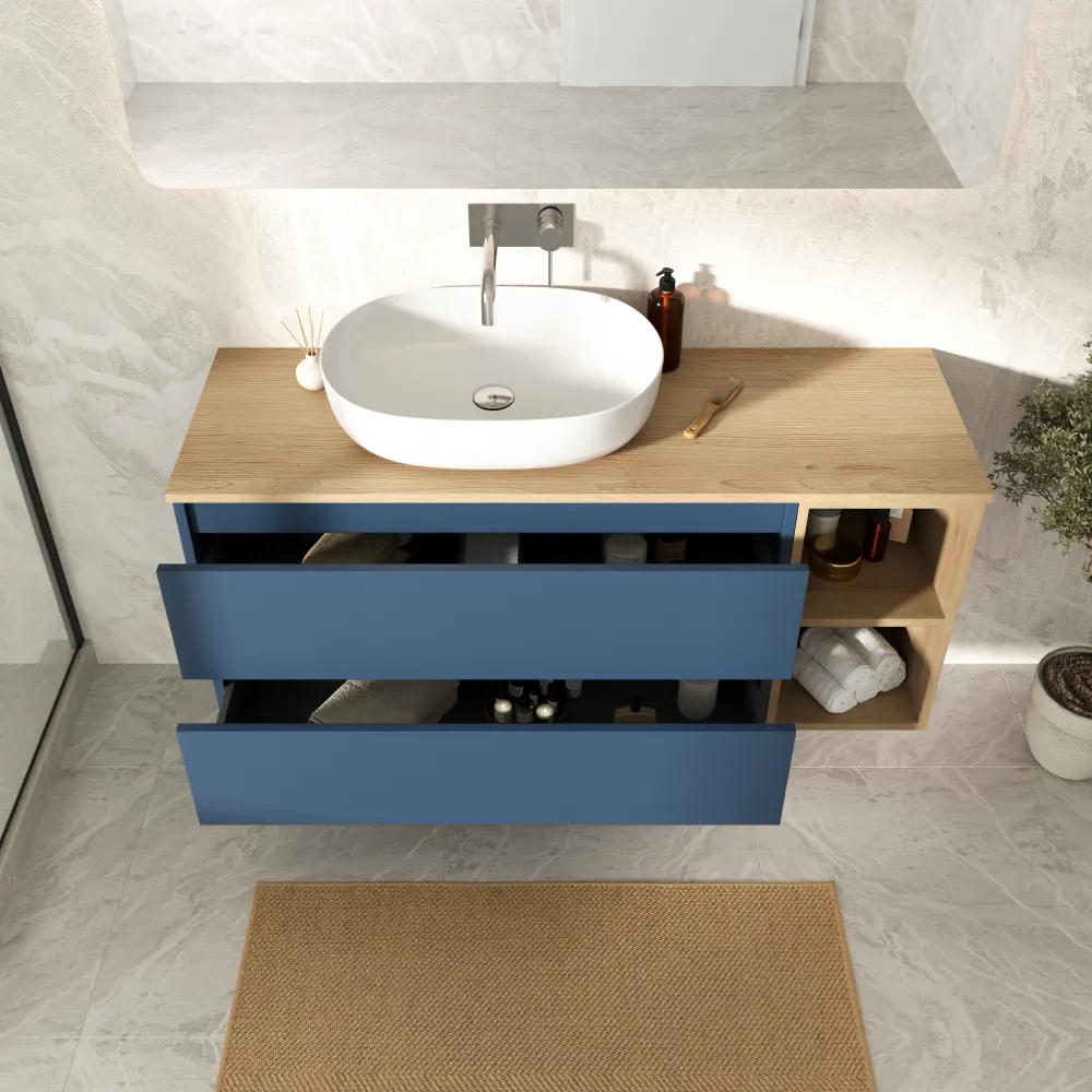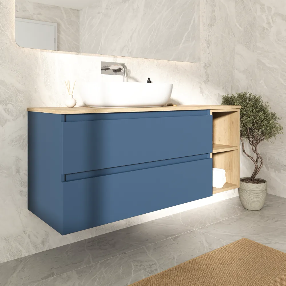 Mobile bagno sospeso 100cm due cassetti alby blue con vano a giorno e top rovere chiaro | Hexa