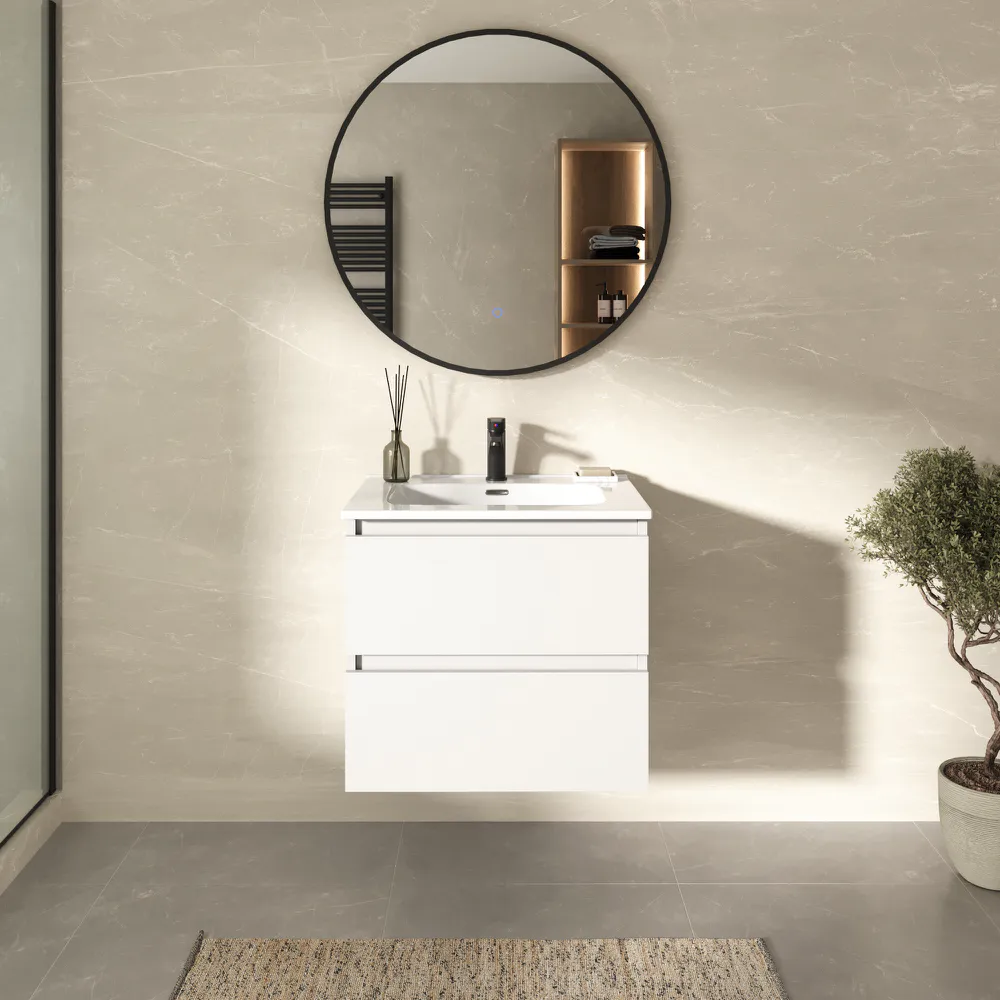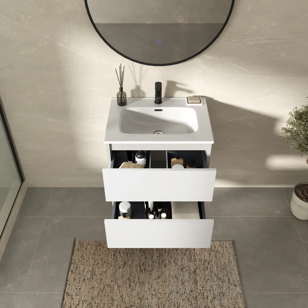 Il mobile è completo di lavabo da incasso in ceramica bianco lucido, con superficie smaltata brillante, facile da pulire e resistente ai graffi, ai detergenti e all’uso quotidiano. La vasca è studiata per ottimizzare lo spazio, offrendo una profondità comoda e una superficie di appoggio laterale funzionale.