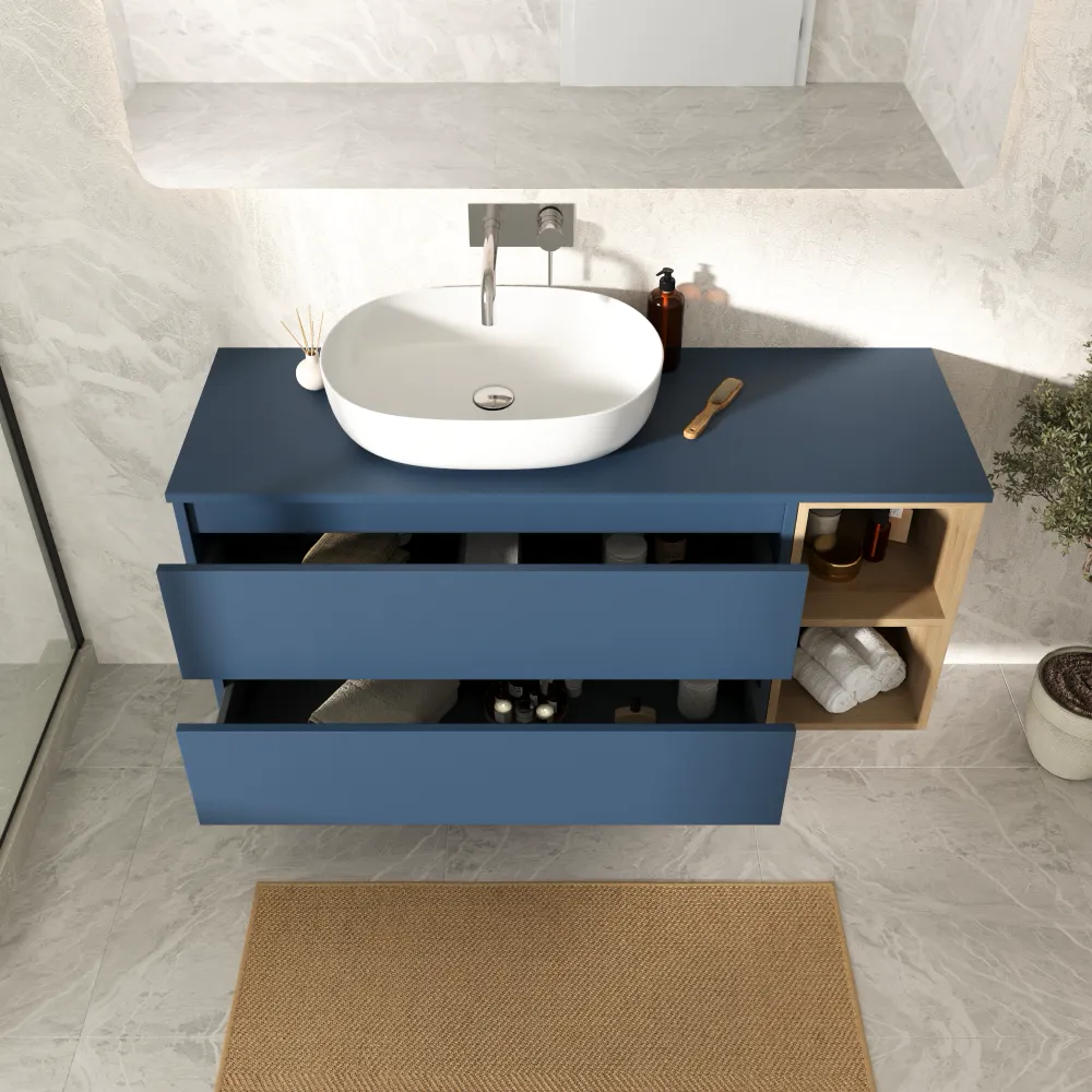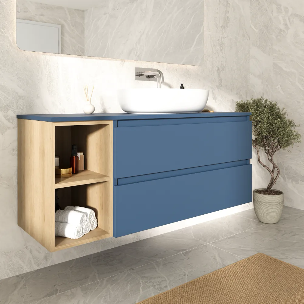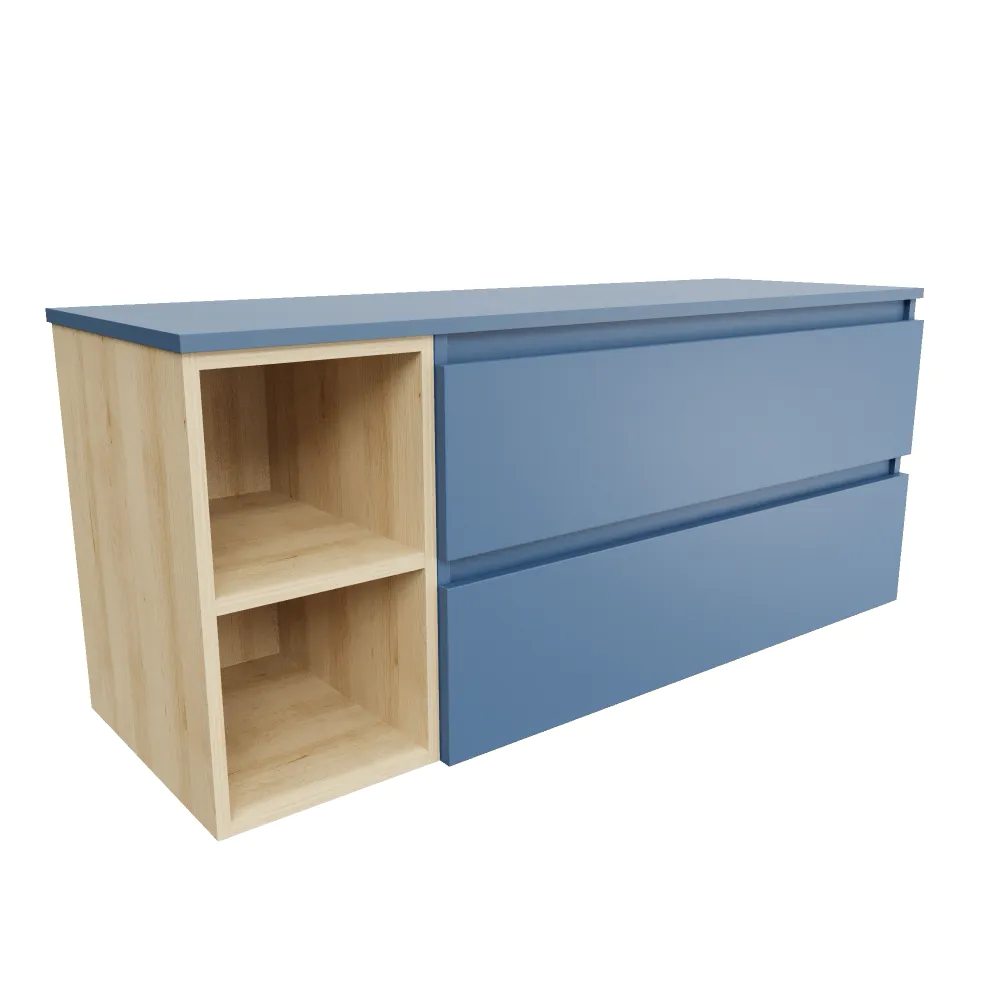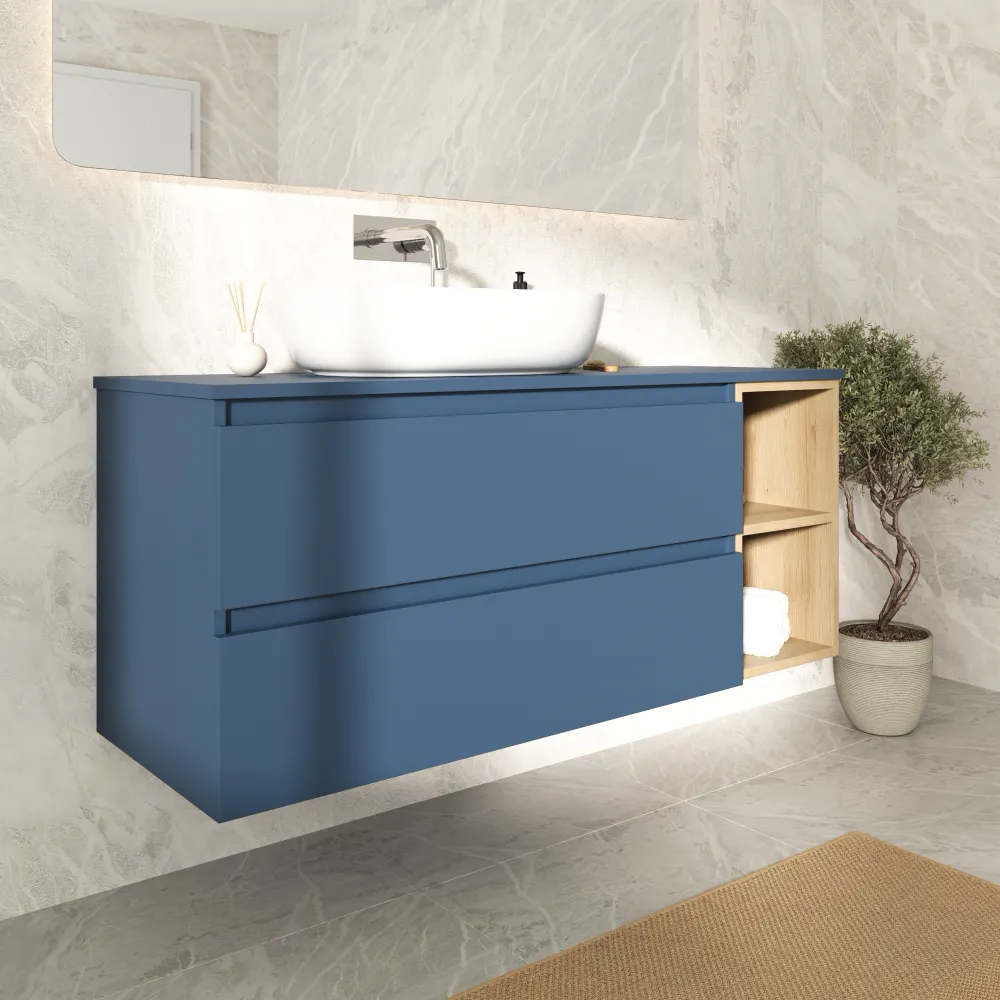 Mobile bagno sospeso 100cm due cassetti con top alby blue e vano a giorno rovere chiaro | Hexa