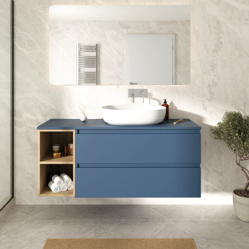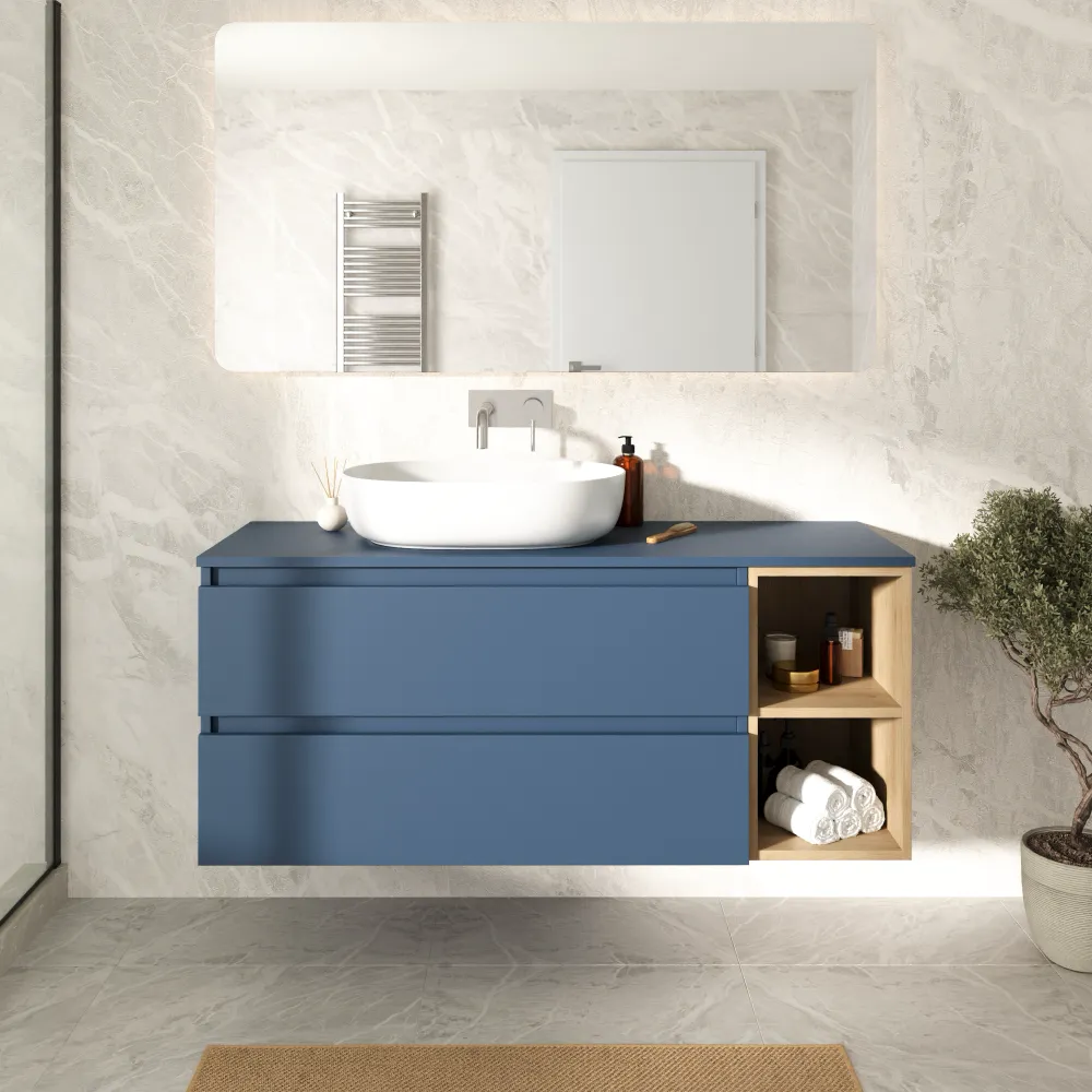 Il mobile è fornito con un top alby blue, pronto per essere completato con il lavabo di propria scelta. Il top è resistente, facile da pulire e offre una superficie funzionale per la disposizione di oggetti e accessori bagno.