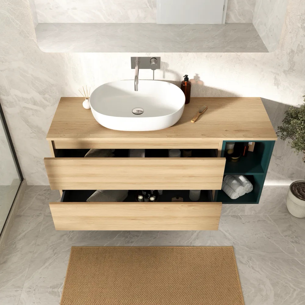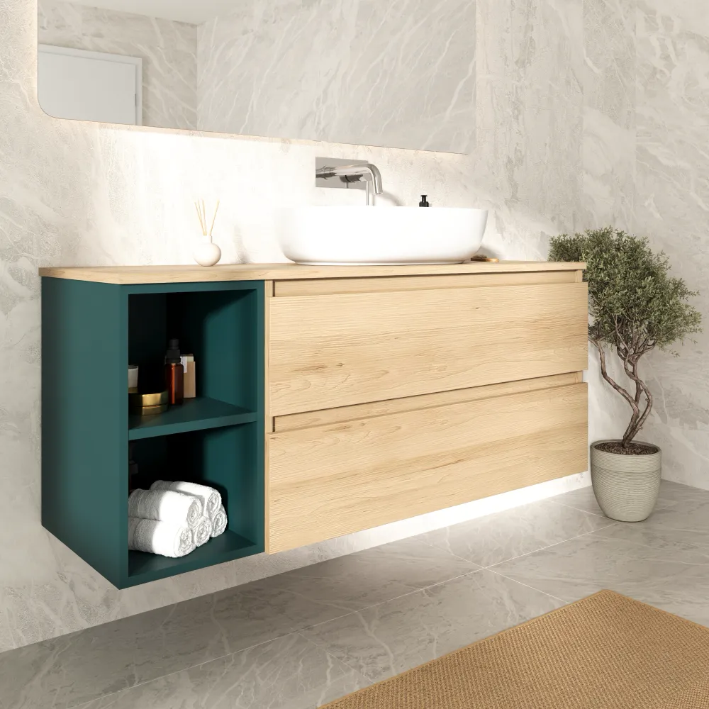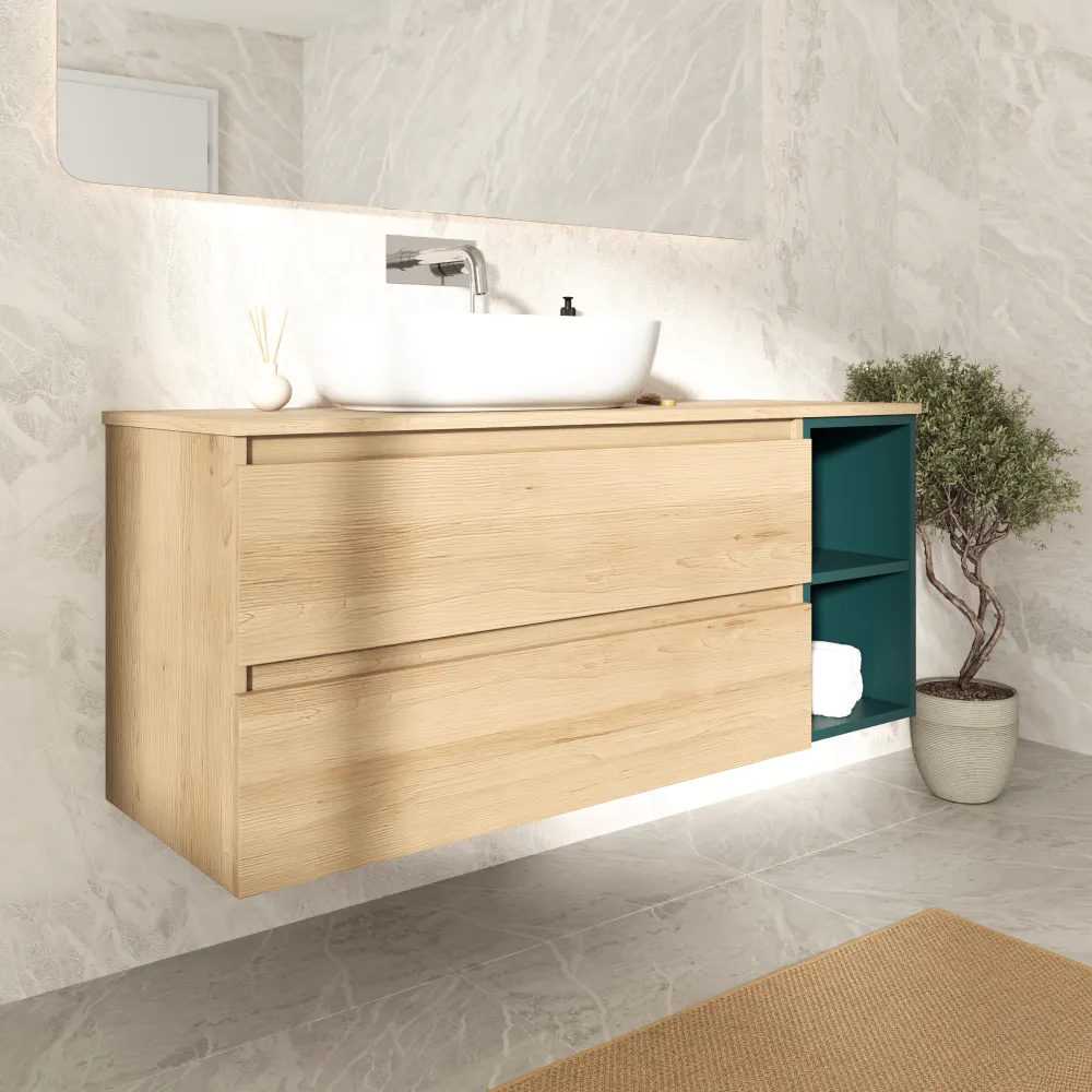 Mobile bagno sospeso 100cm due cassetti con top rovere chiaro stone oak e vano a giorno petrol | Hexa