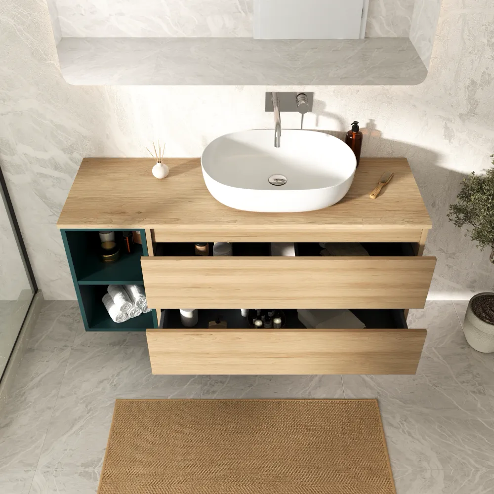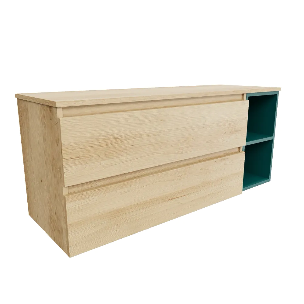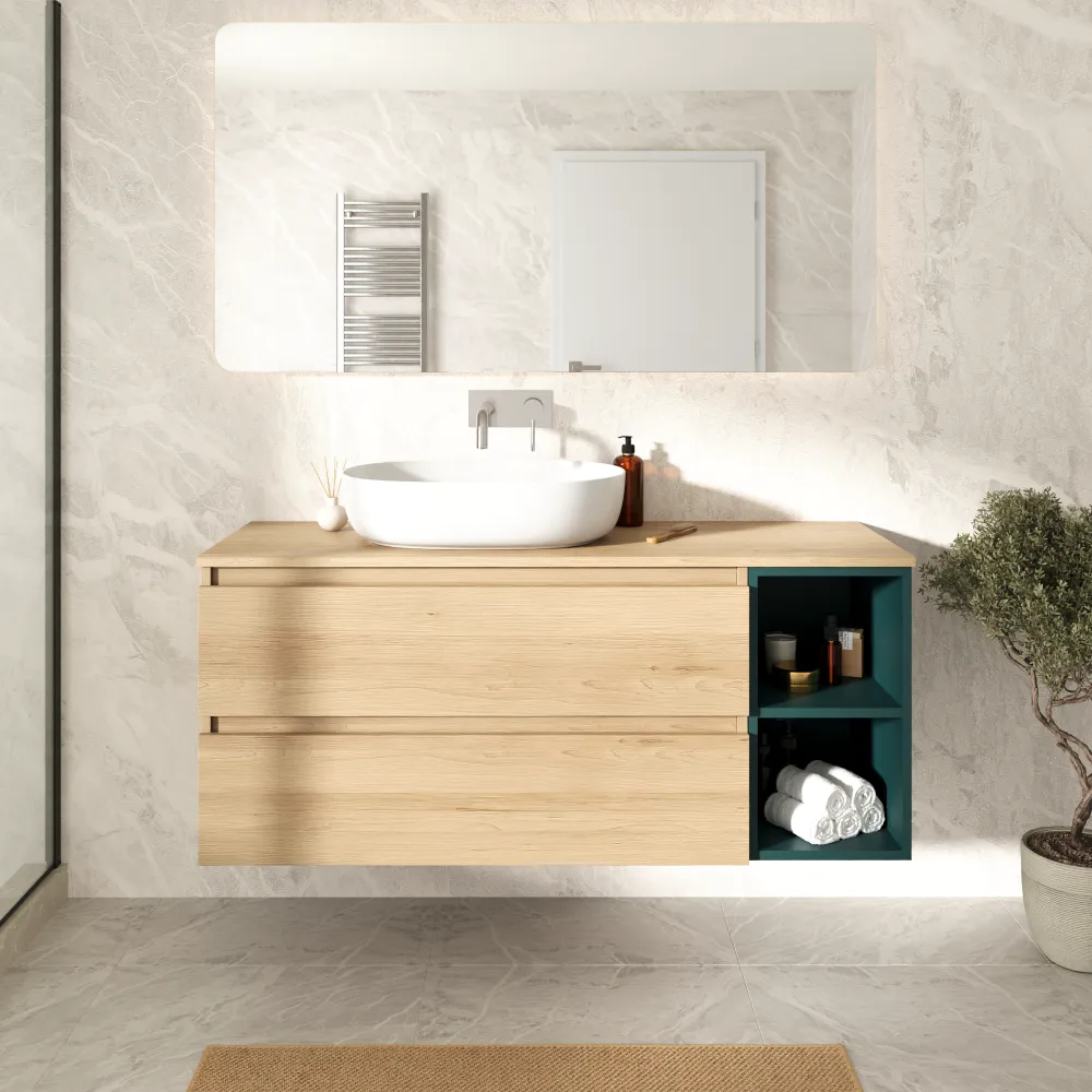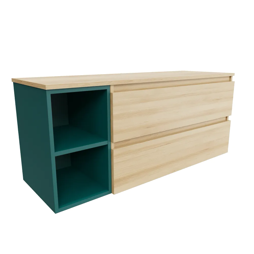 Mobile bagno sospeso 100cm due cassetti con top rovere chiaro stone oak e vano a giorno petrol | Hexa