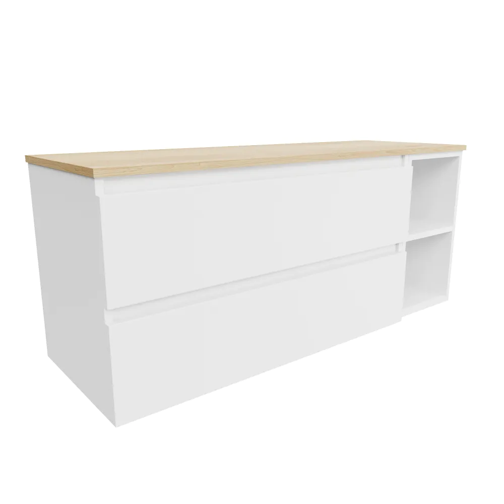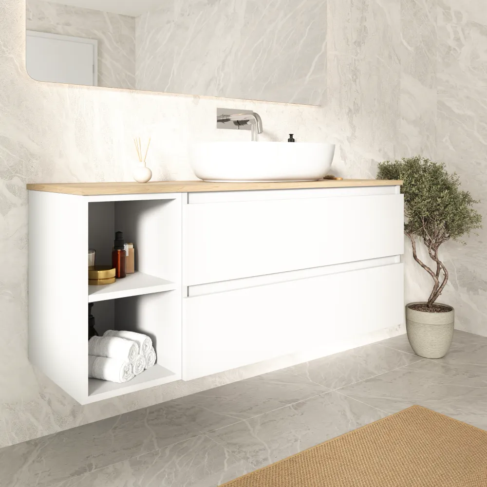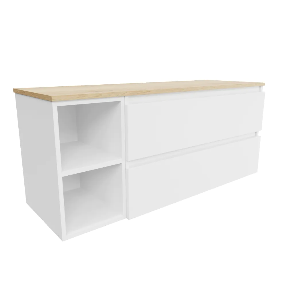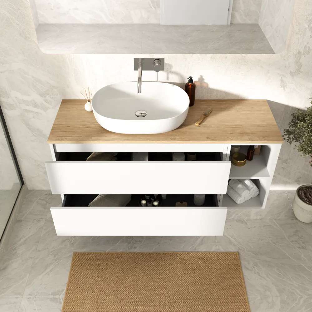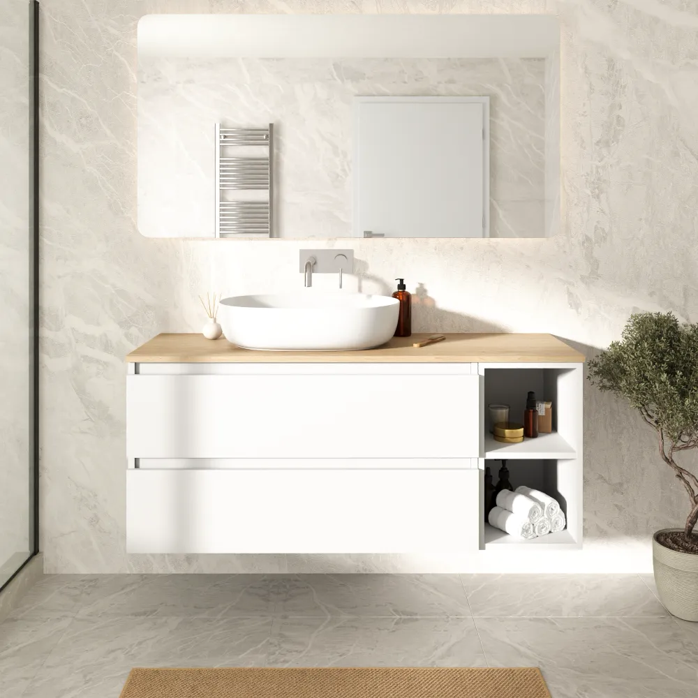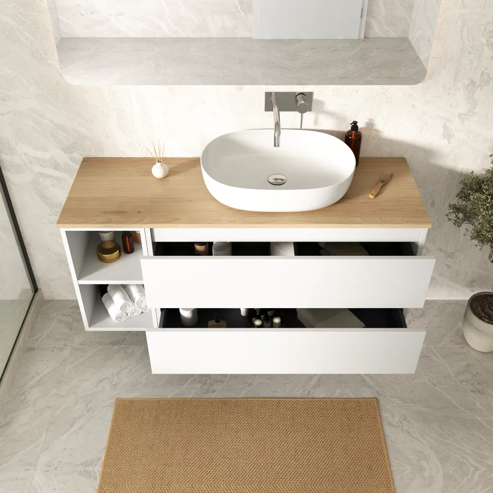 Mobile bagno sospeso 100cm due cassetti e un vano a giorno bianco opaco con top rovere chiaro | Hexa
