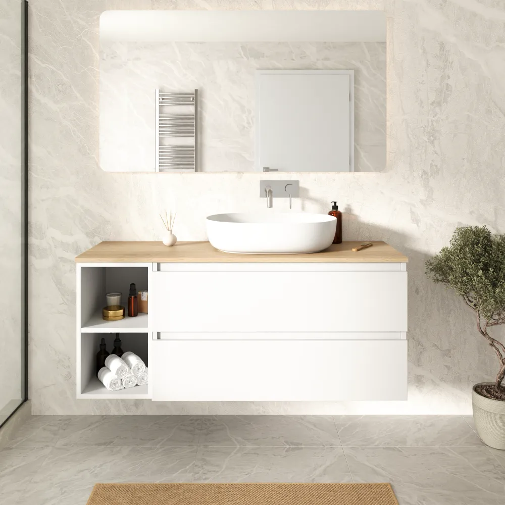 Il mobile è fornito con top in rovere chiaro, resistente e facile da pulire, pronto per essere completato con il lavabo di propria scelta. La superficie del top offre uno spazio funzionale per la disposizione di oggetti e accessori bagno, mantenendo un’estetica equilibrata ed elegante.