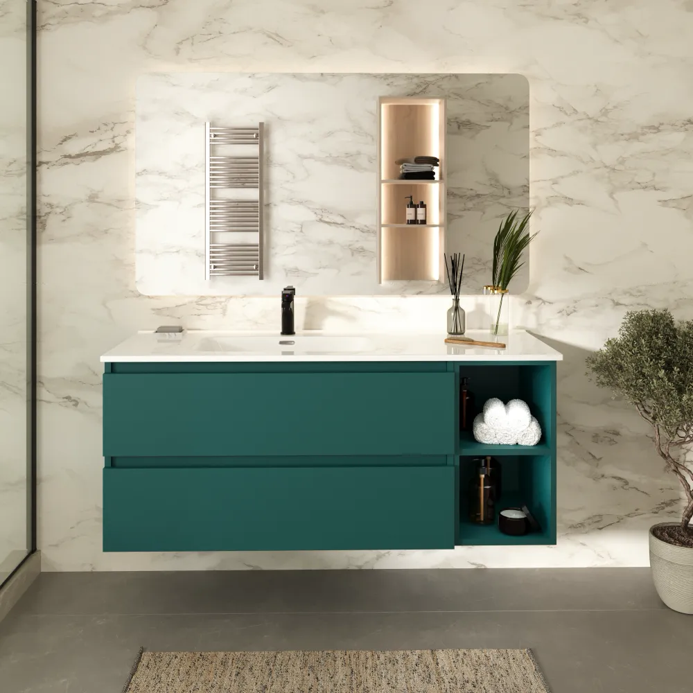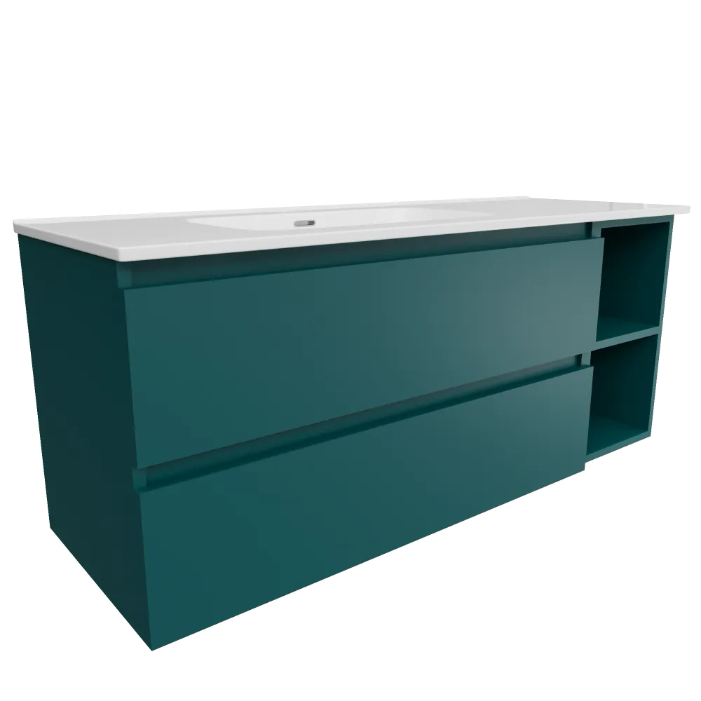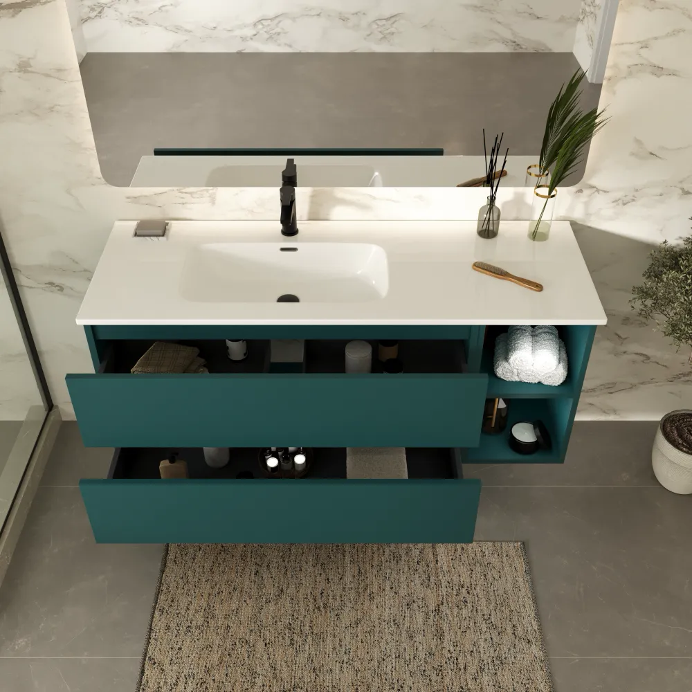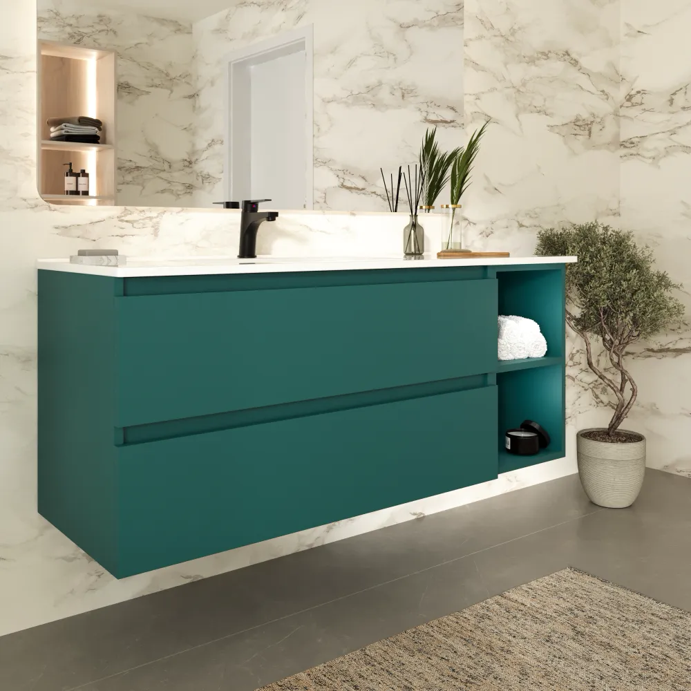 Mobile bagno sospeso 100cm due cassetti petrol con lavabo sinistro e vano a giorno petrol | Hexa