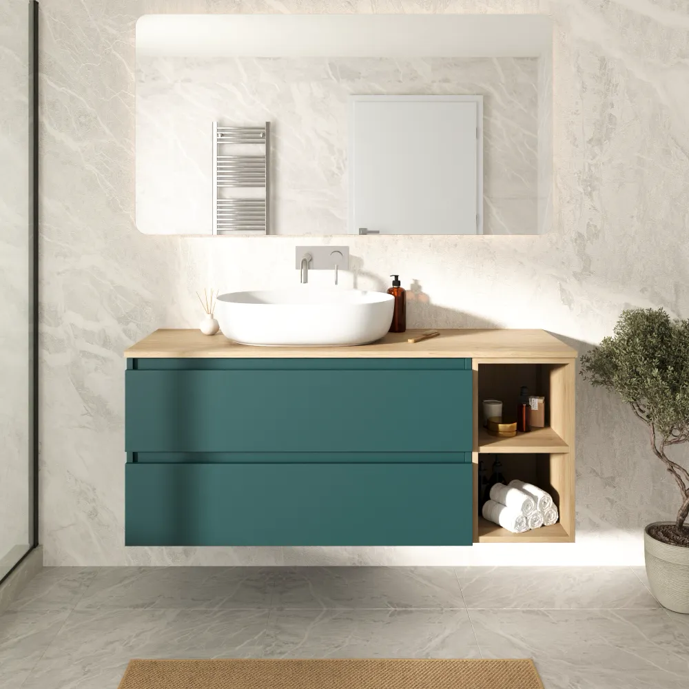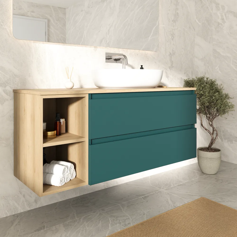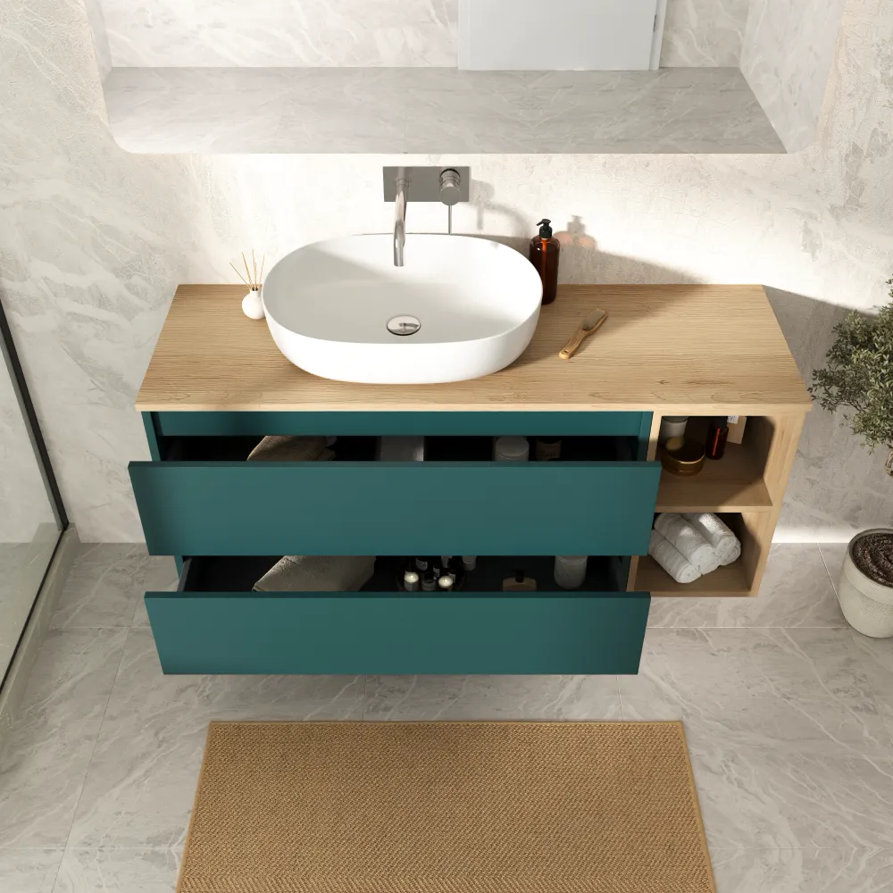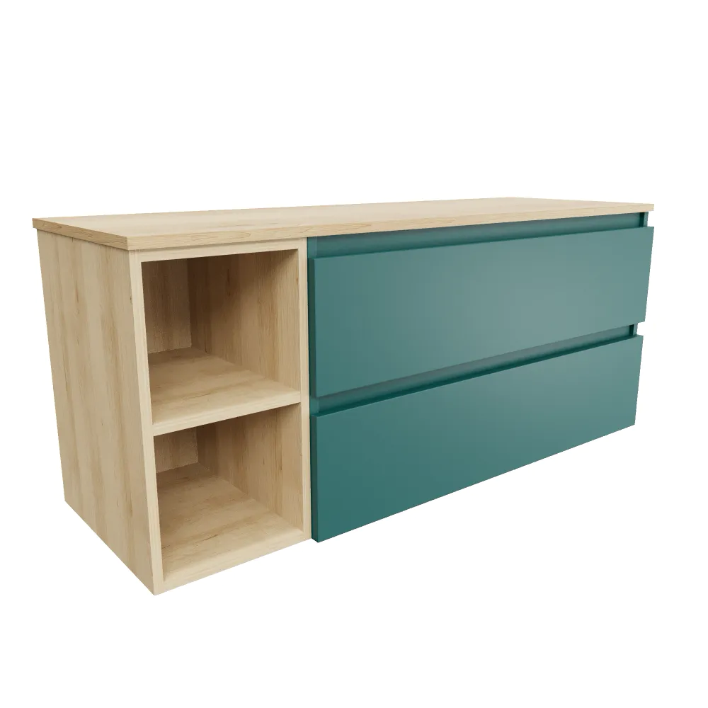 Mobile bagno sospeso 100cm due cassetti petrol con vano a giorno e top rovere chiaro | Hexa