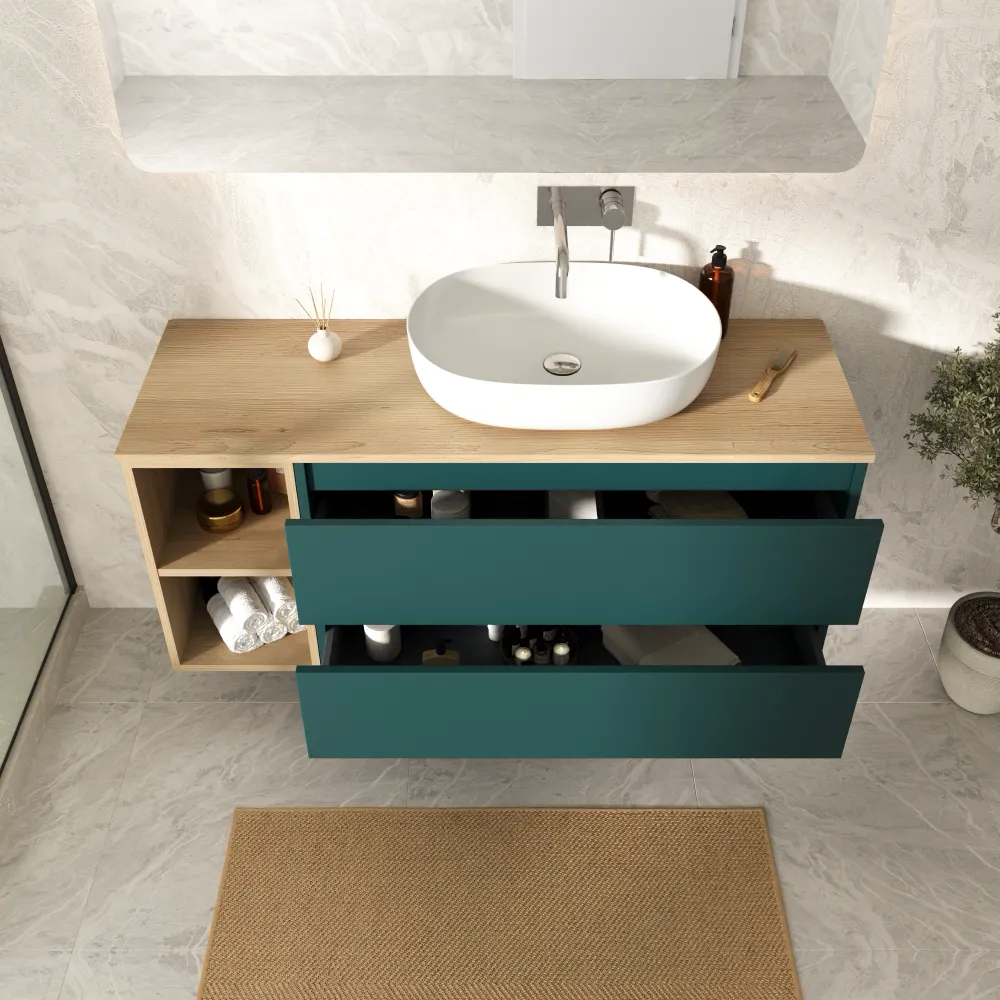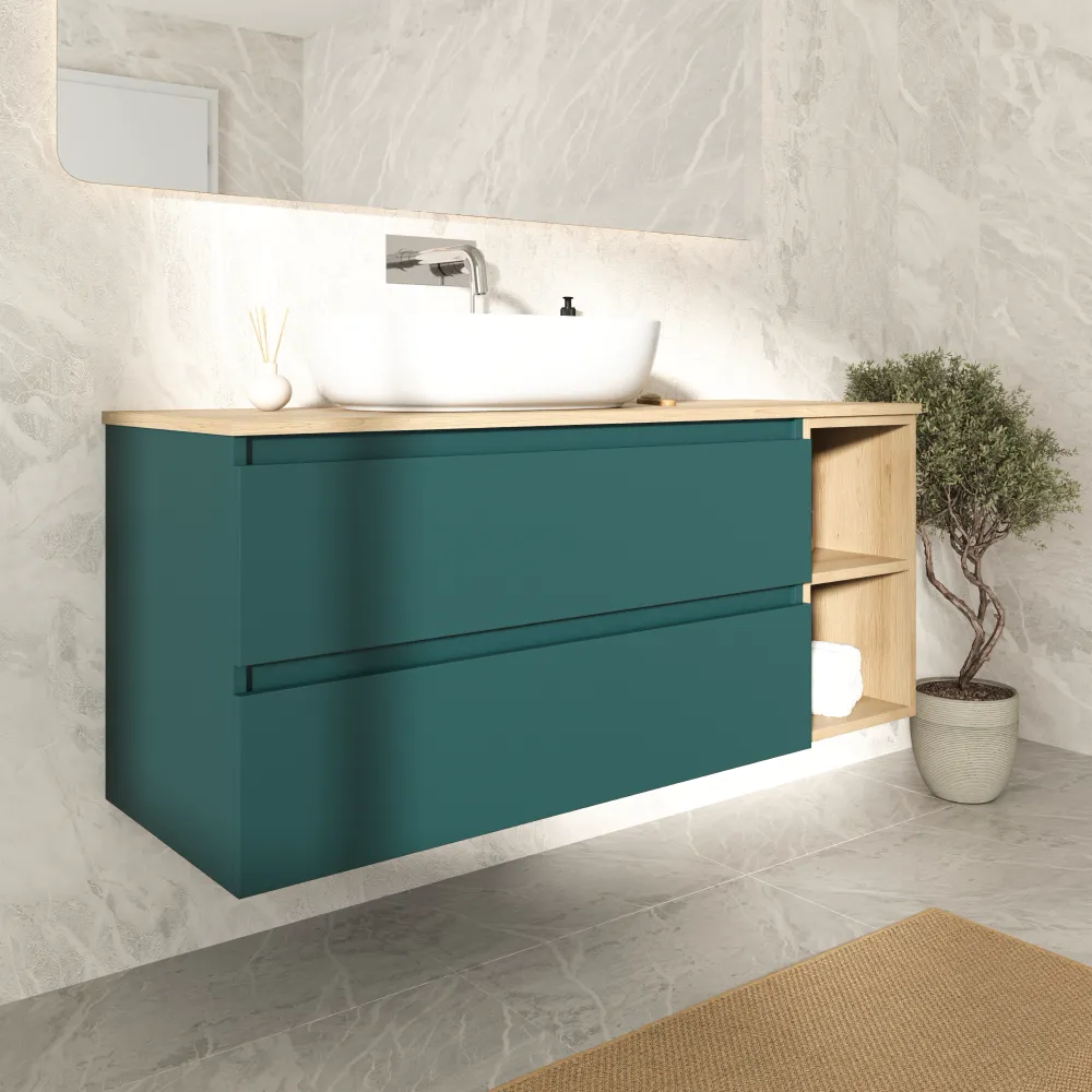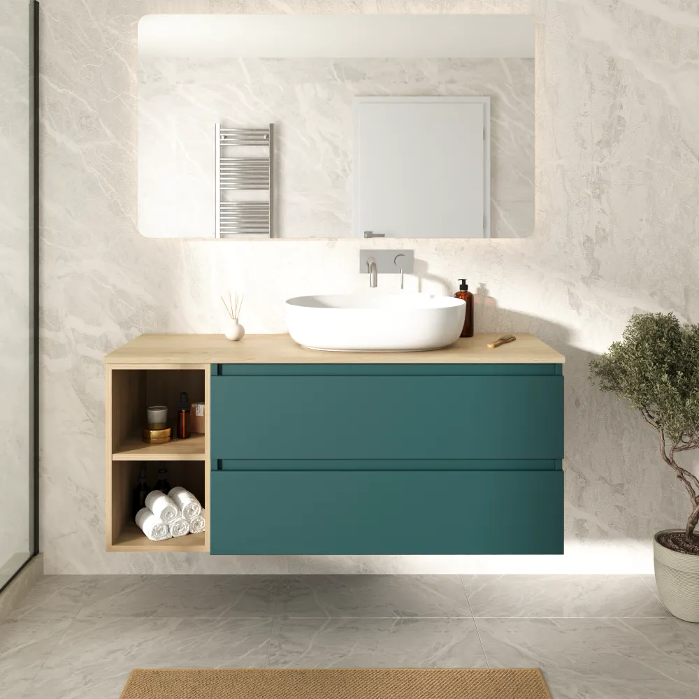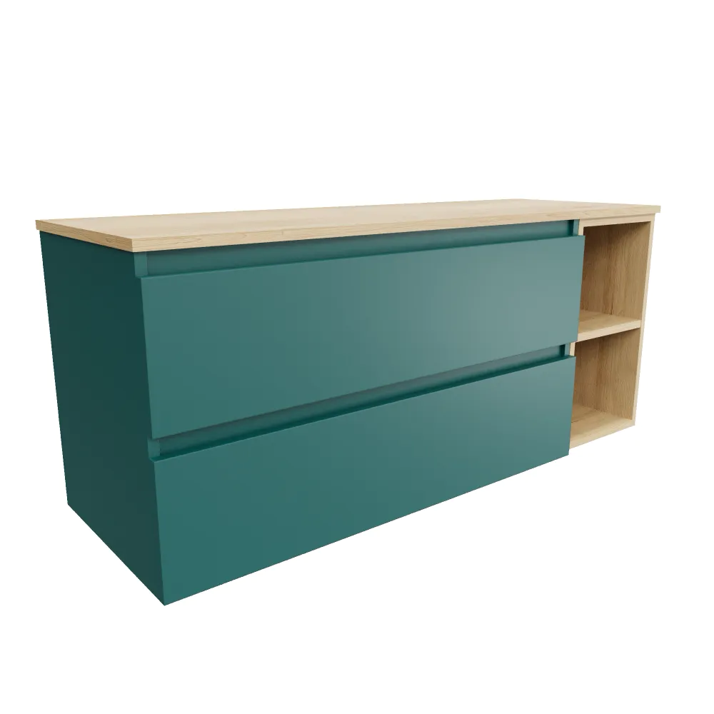 Mobile bagno sospeso 100cm due cassetti petrol con vano a giorno e top rovere chiaro | Hexa