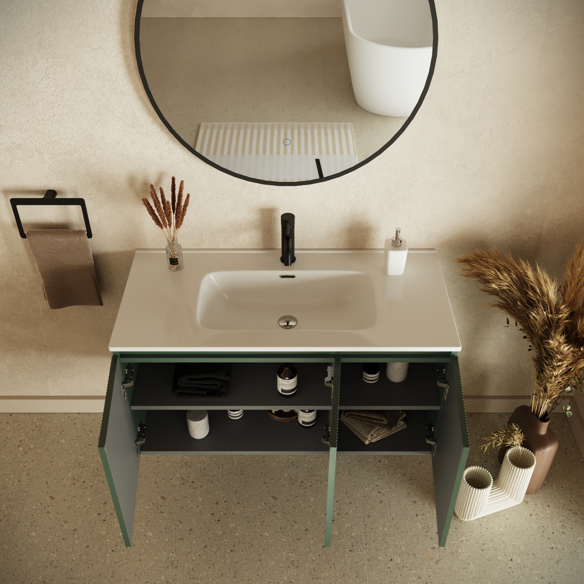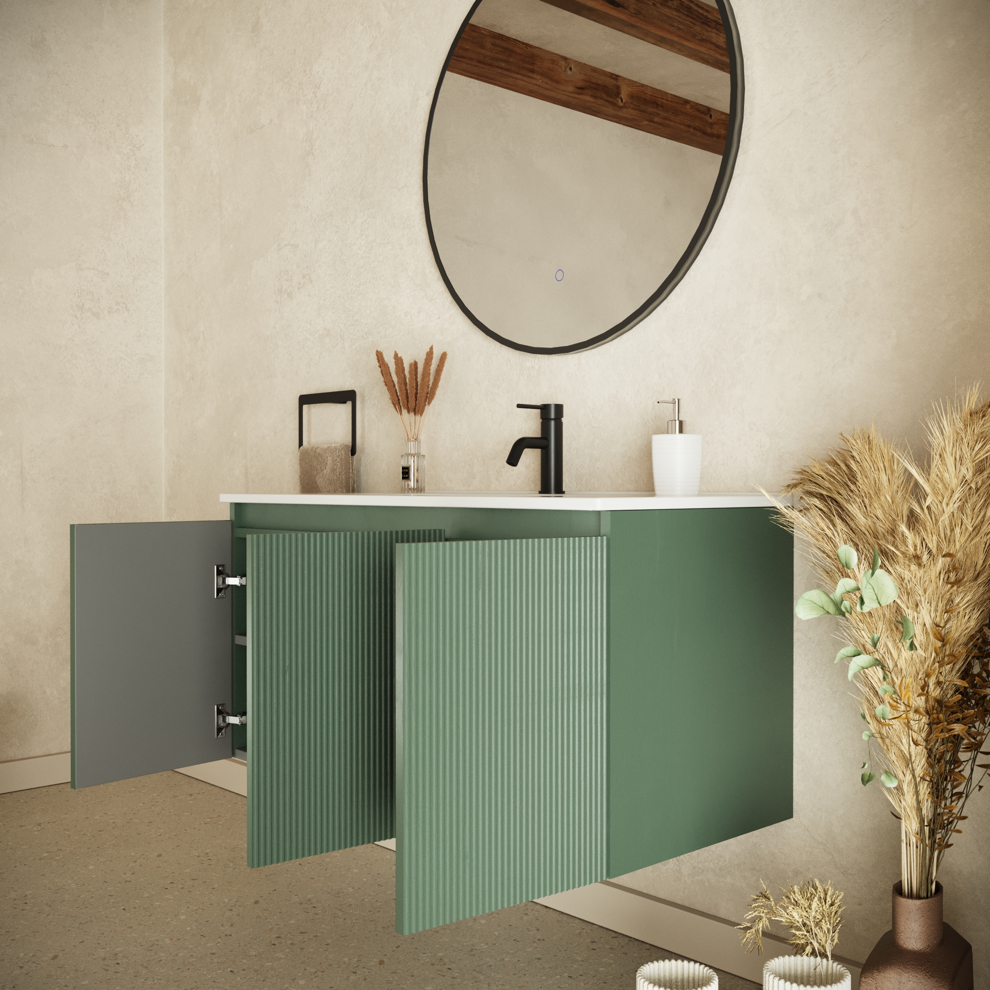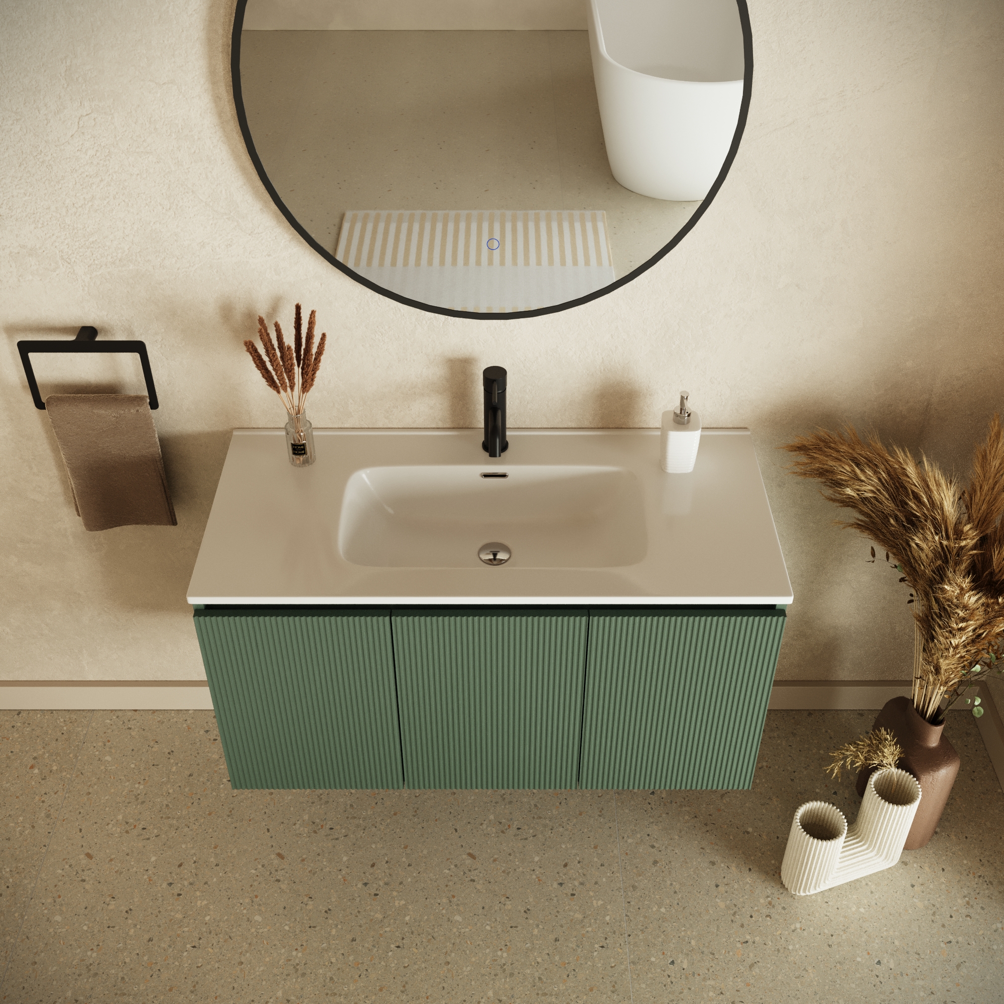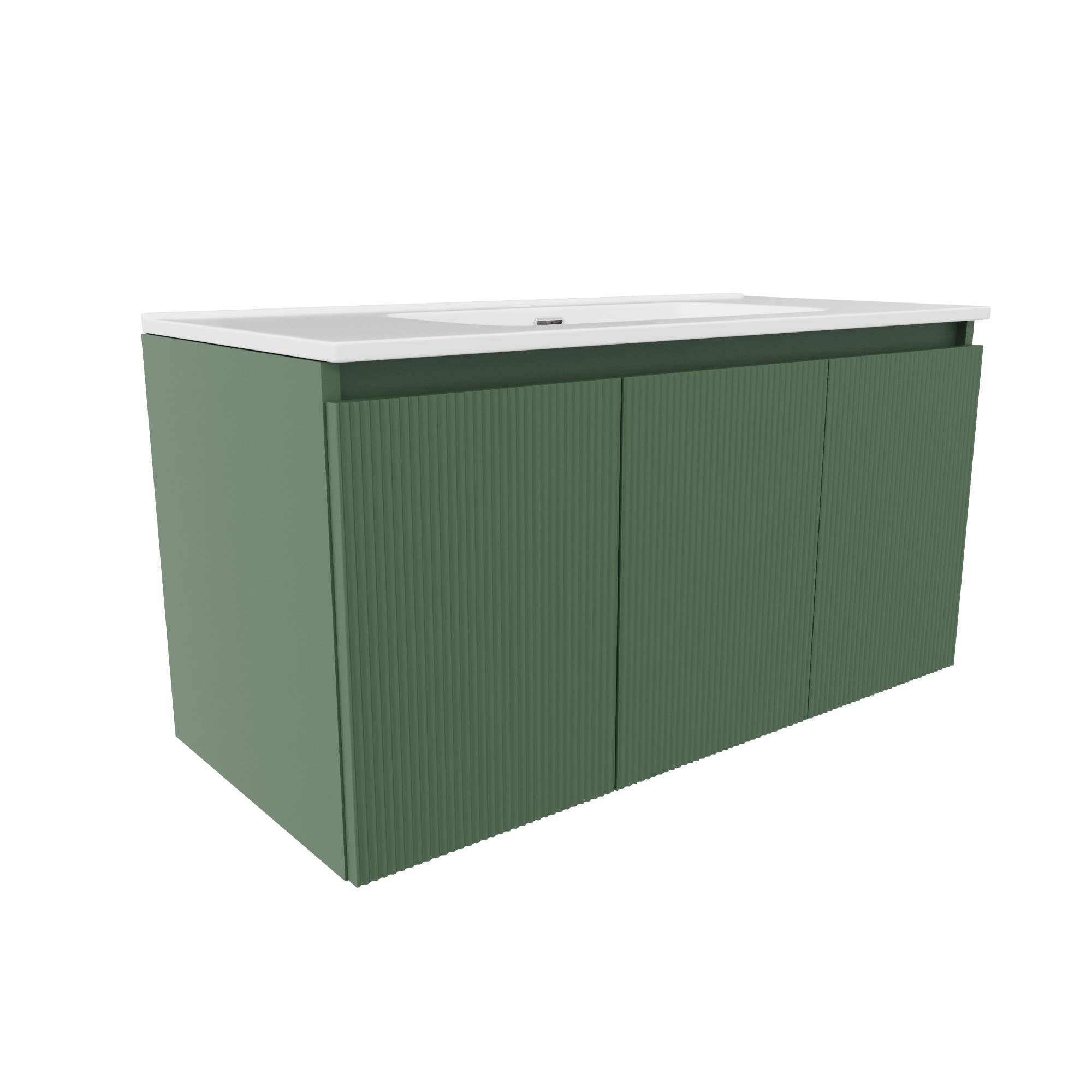 Mobile bagno sospeso 100cm tre ante verde foresta cannettato con lavabo | Pelion