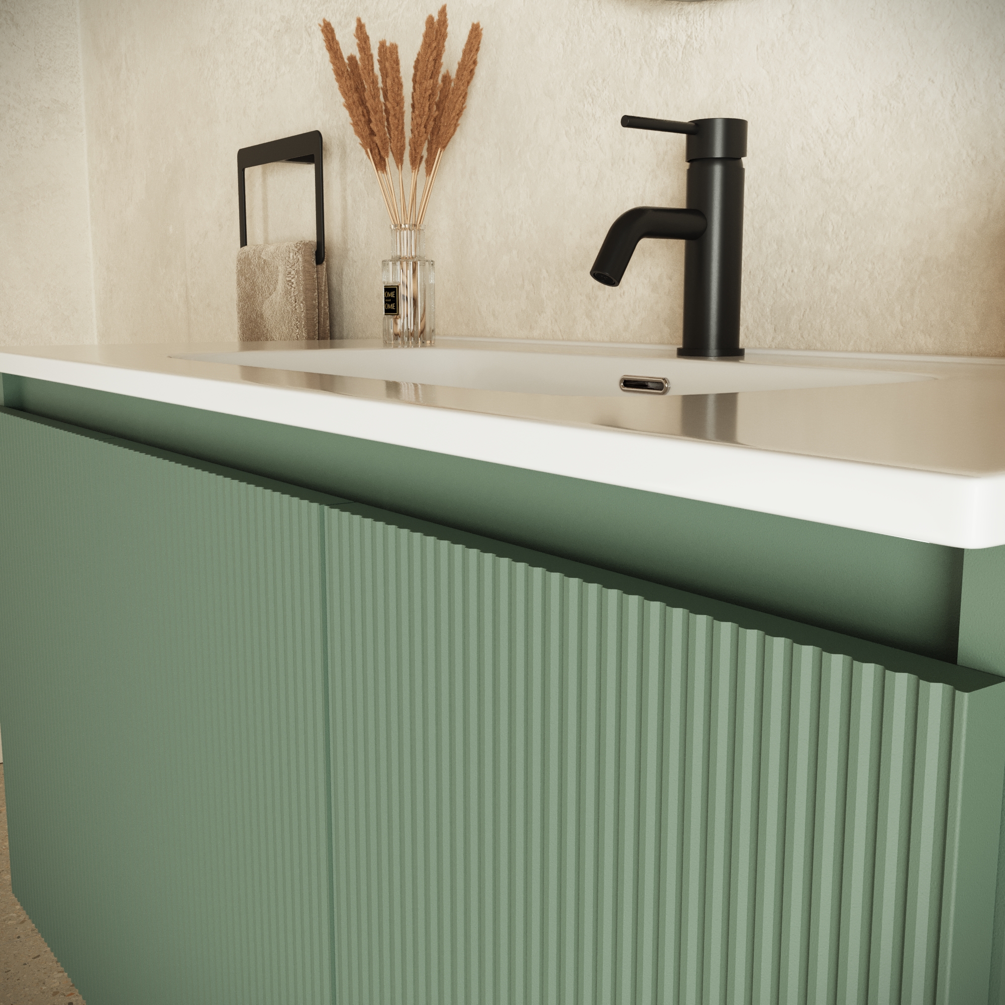 Il frontale cannettato rappresenta l'elemento distintivo di questa serie, creando un elegante gioco di luci e ombre che dona carattere e personalità al mobile. Questa texture sofisticata, abbinata al colore verde foresta, conferisce un aspetto naturale e di carattere che porta un tocco di eleganza e personalità all'ambiente bagno, creando un'atmosfera rilassante e sofisticata che richiama la natura.