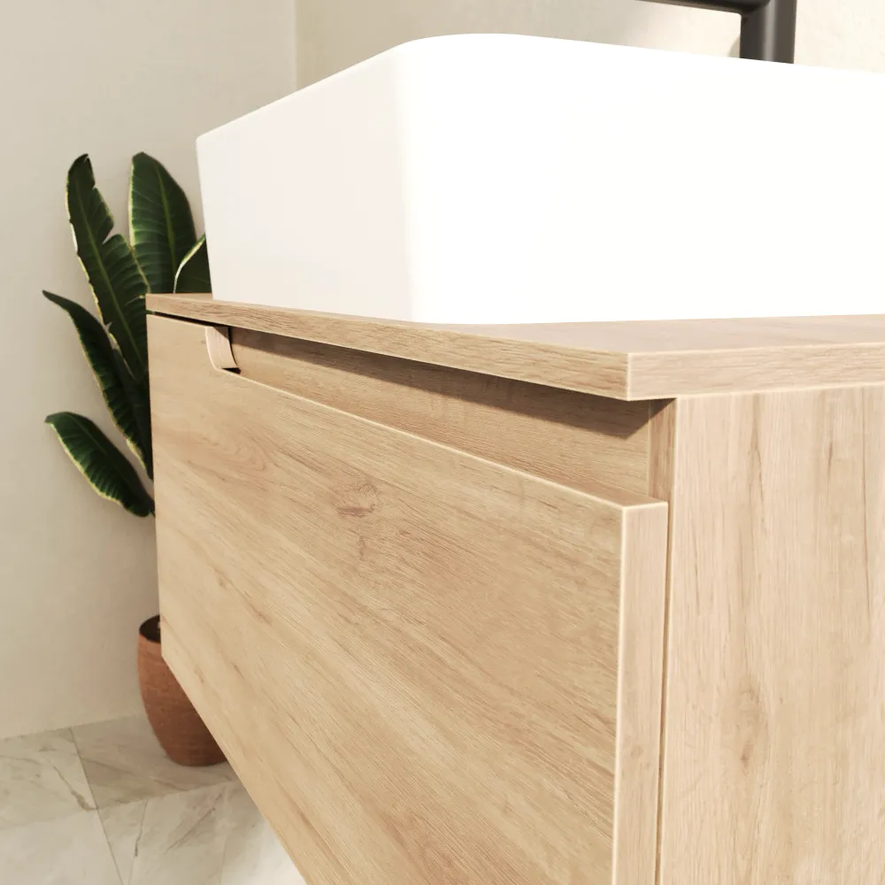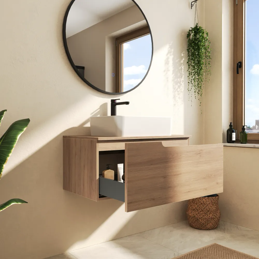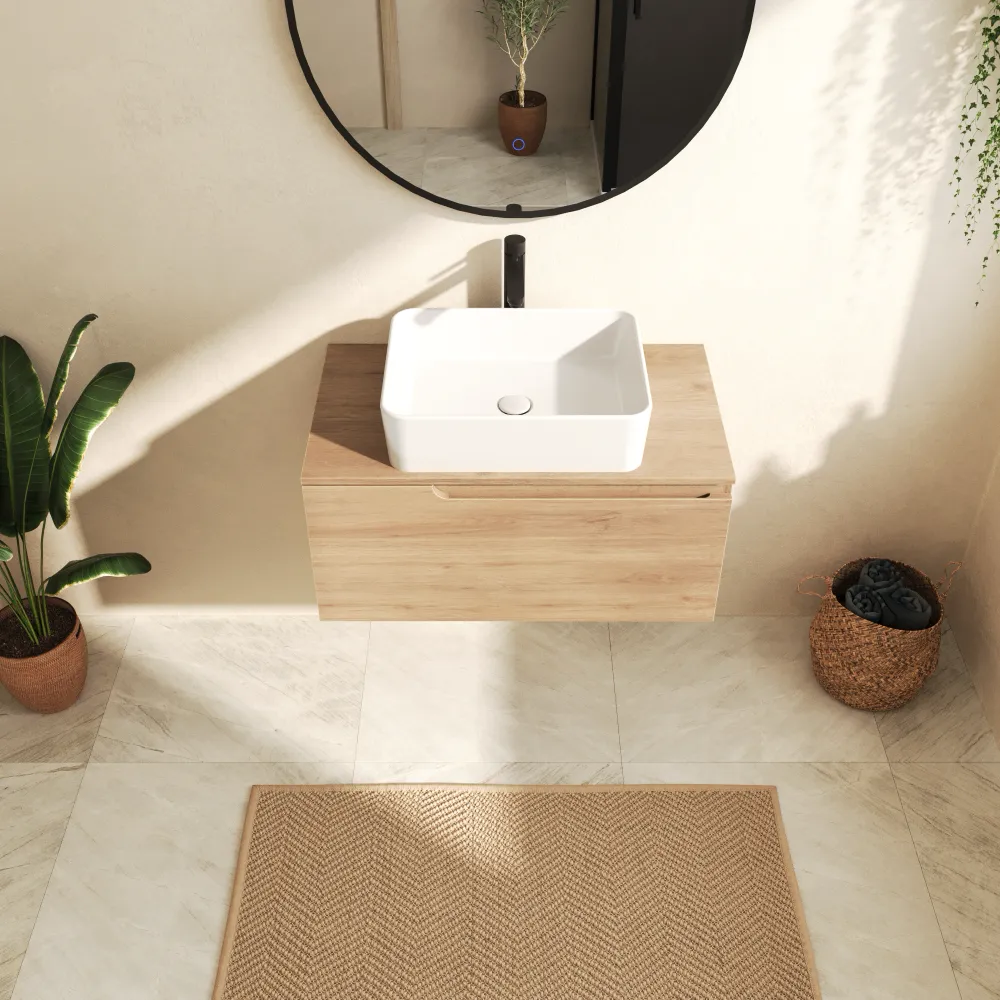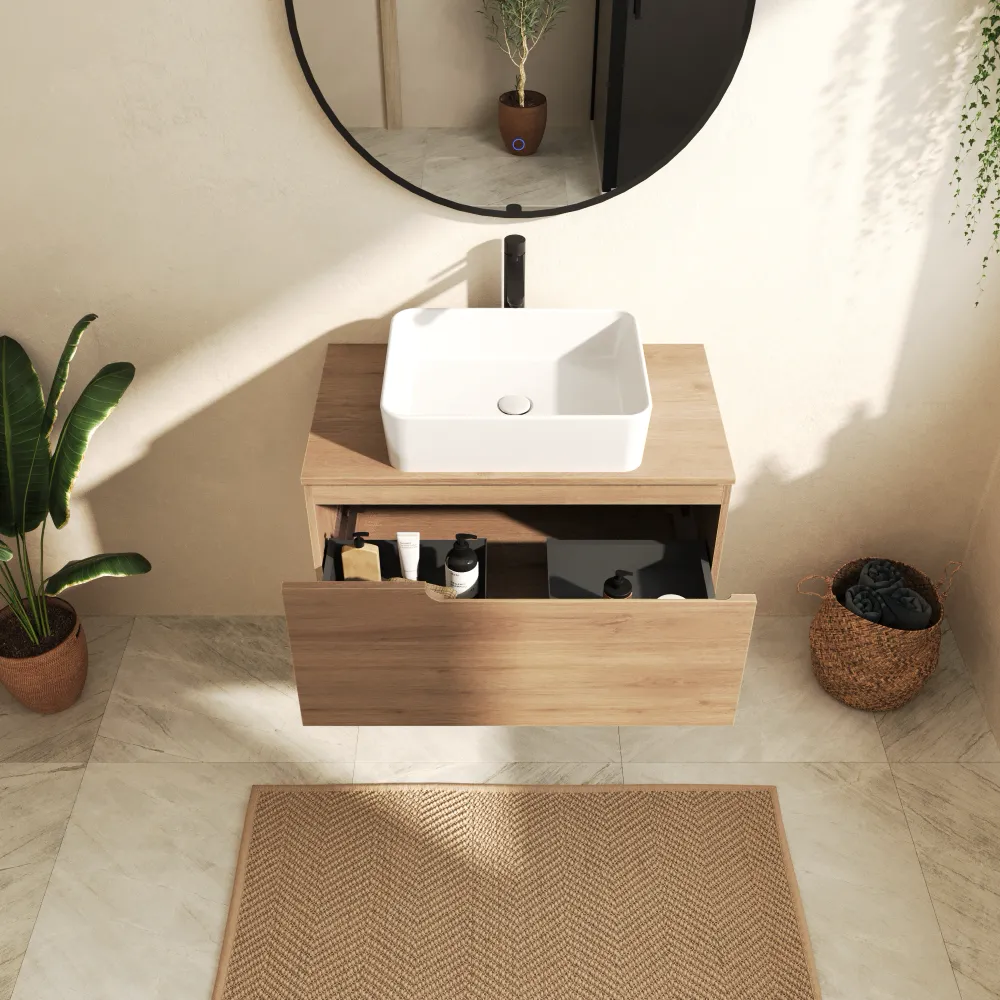 Il mobile è dotato di un top per lavabo da appoggio, che consente di scegliere liberamente il lavabo preferito per personalizzare l’estetica del bagno. Il rovere chiaro, caldo e naturale, dona luminosità e armonia all’ambiente, rendendolo accogliente e contemporaneo.