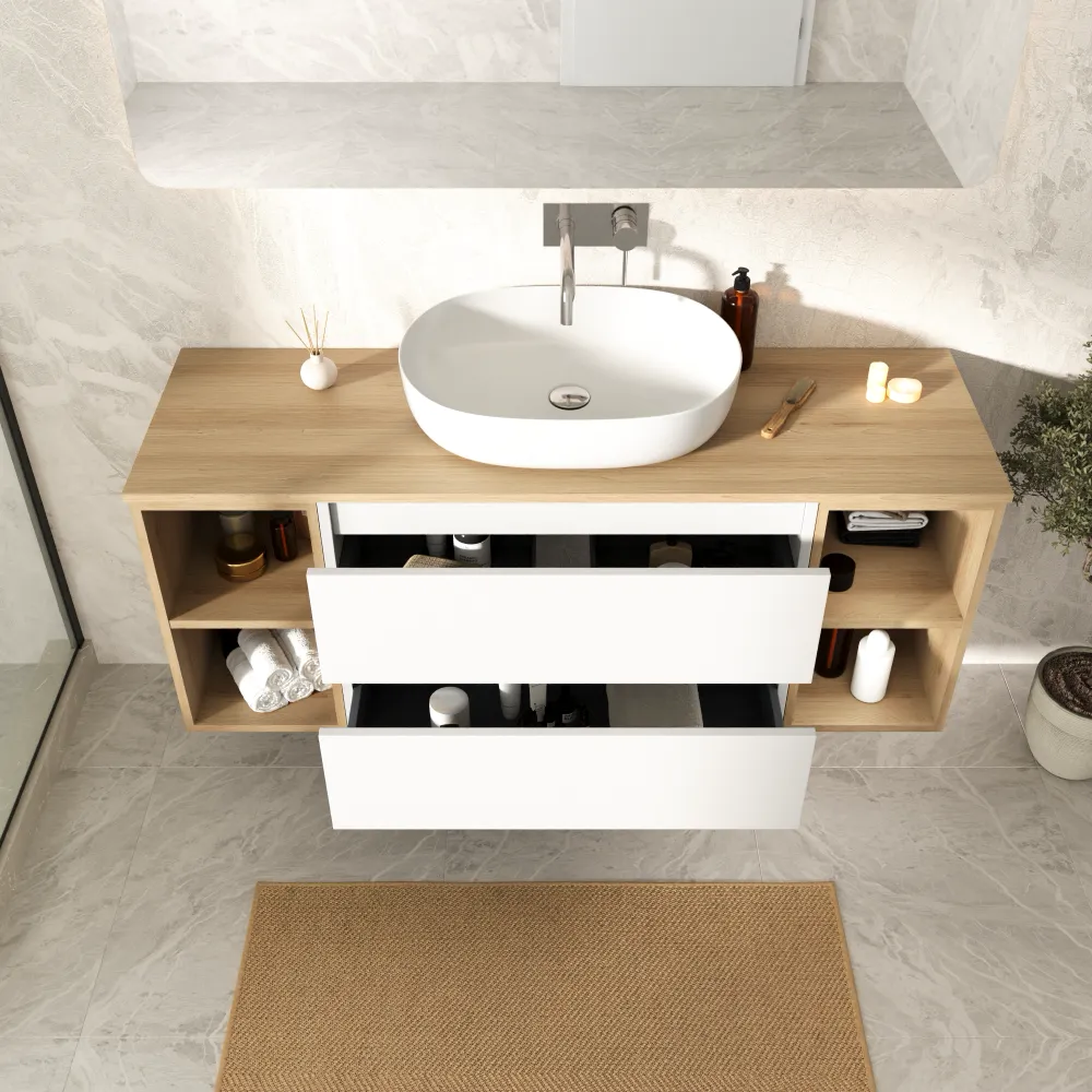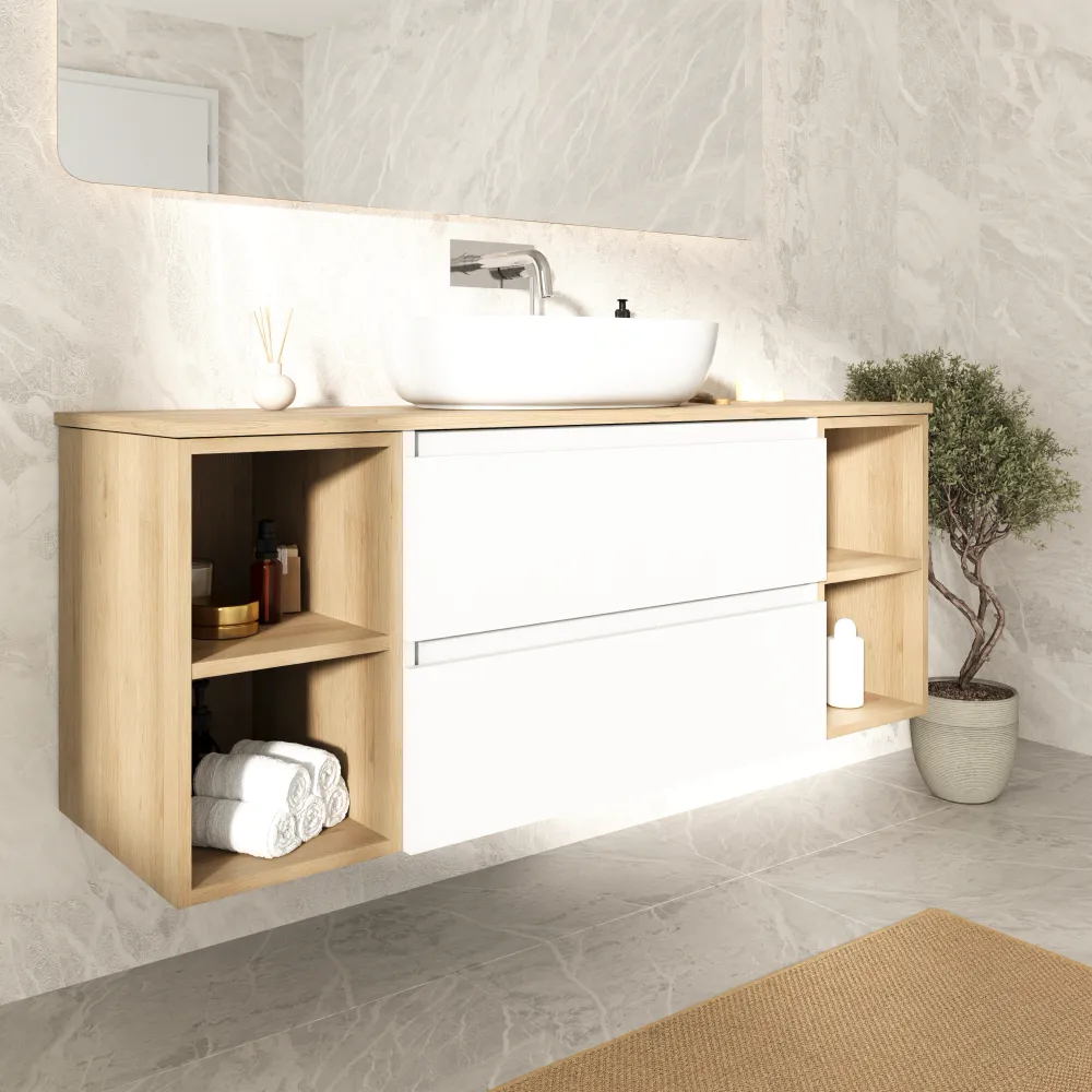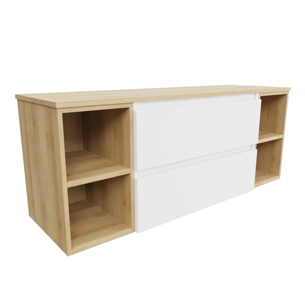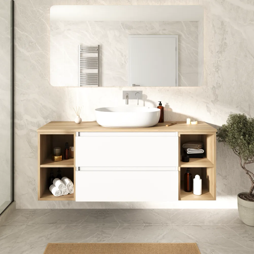 Mobile bagno sospeso 120cm due cassetti bianco opaco con due vani a giorno e top rovere chiaro | Hexa