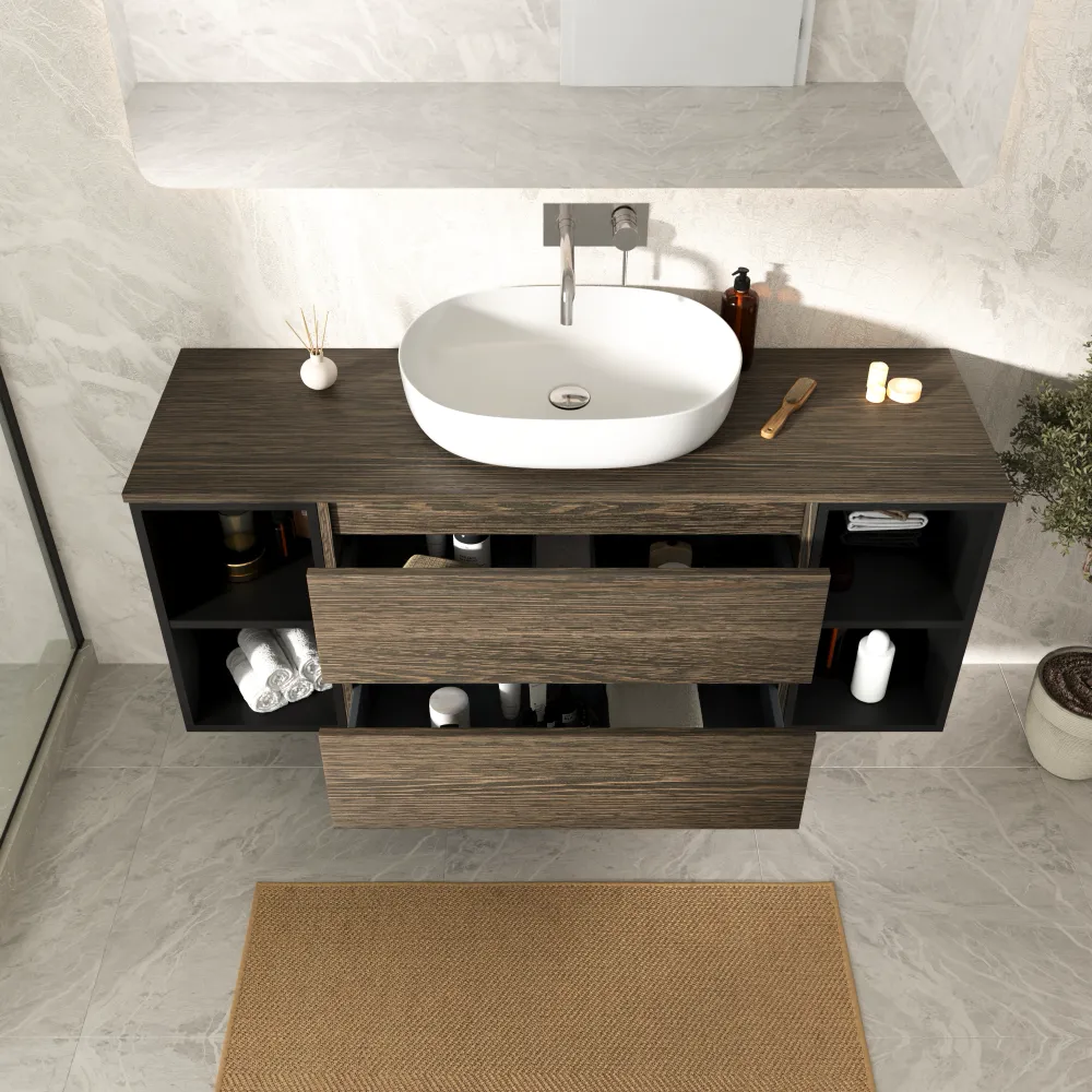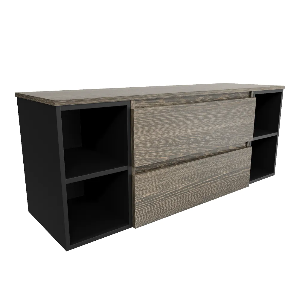 Mobile bagno sospeso 120cm due cassetti con top rovere scuro vintage wenge e due vani a giorno nero opaco | Hexa
