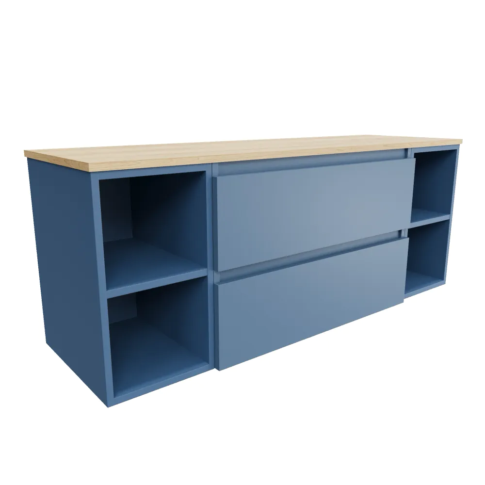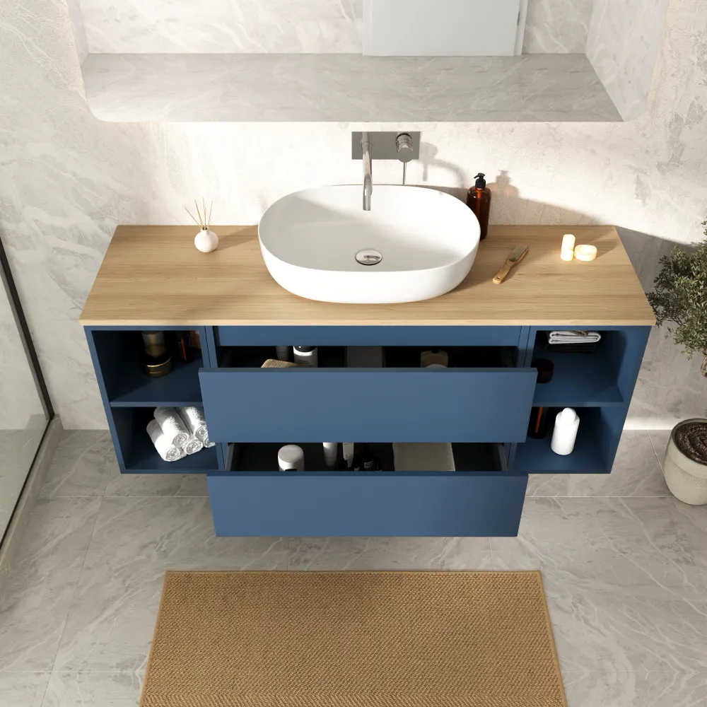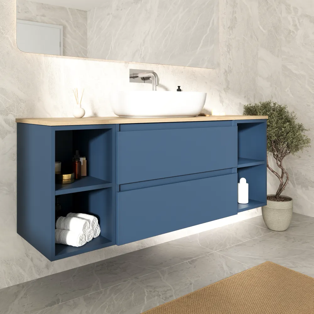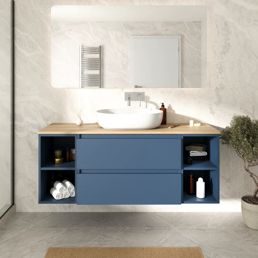Mobile bagno sospeso 120cm due cassetti e due vani a giorno alby blue con top rovere chiaro | Hexa