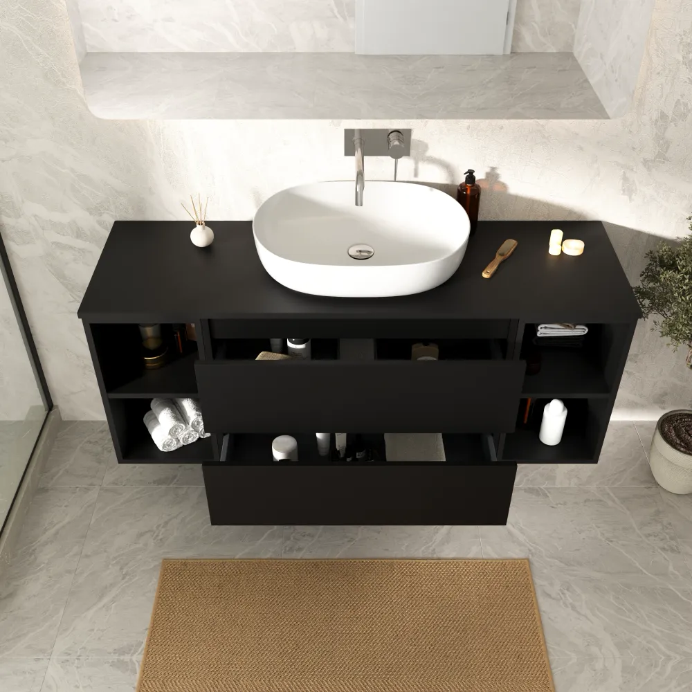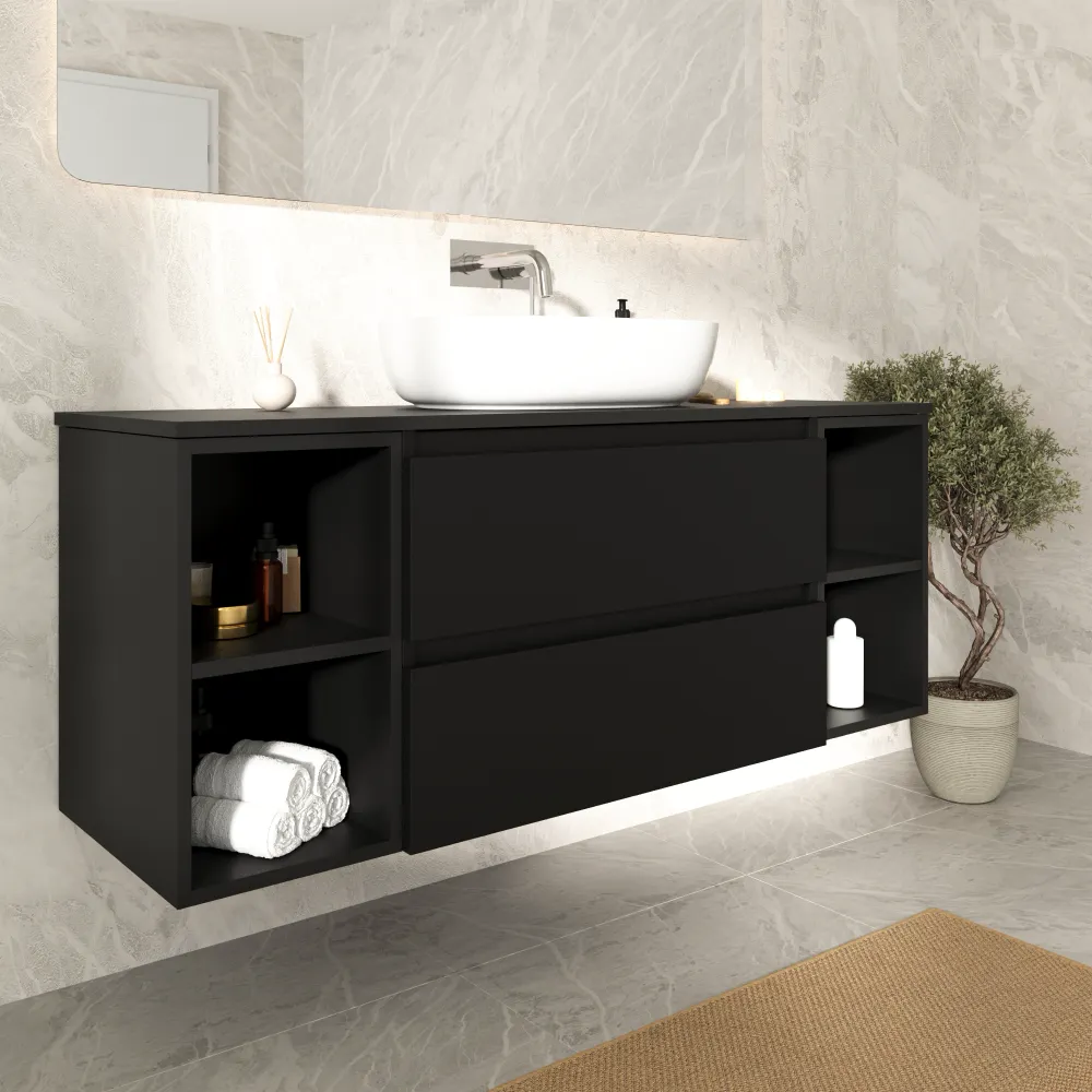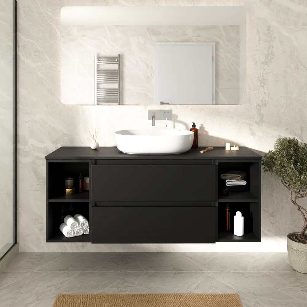 Mobile bagno sospeso 120cm due cassetti nero opaco e due vani a giorno con top | Hexa