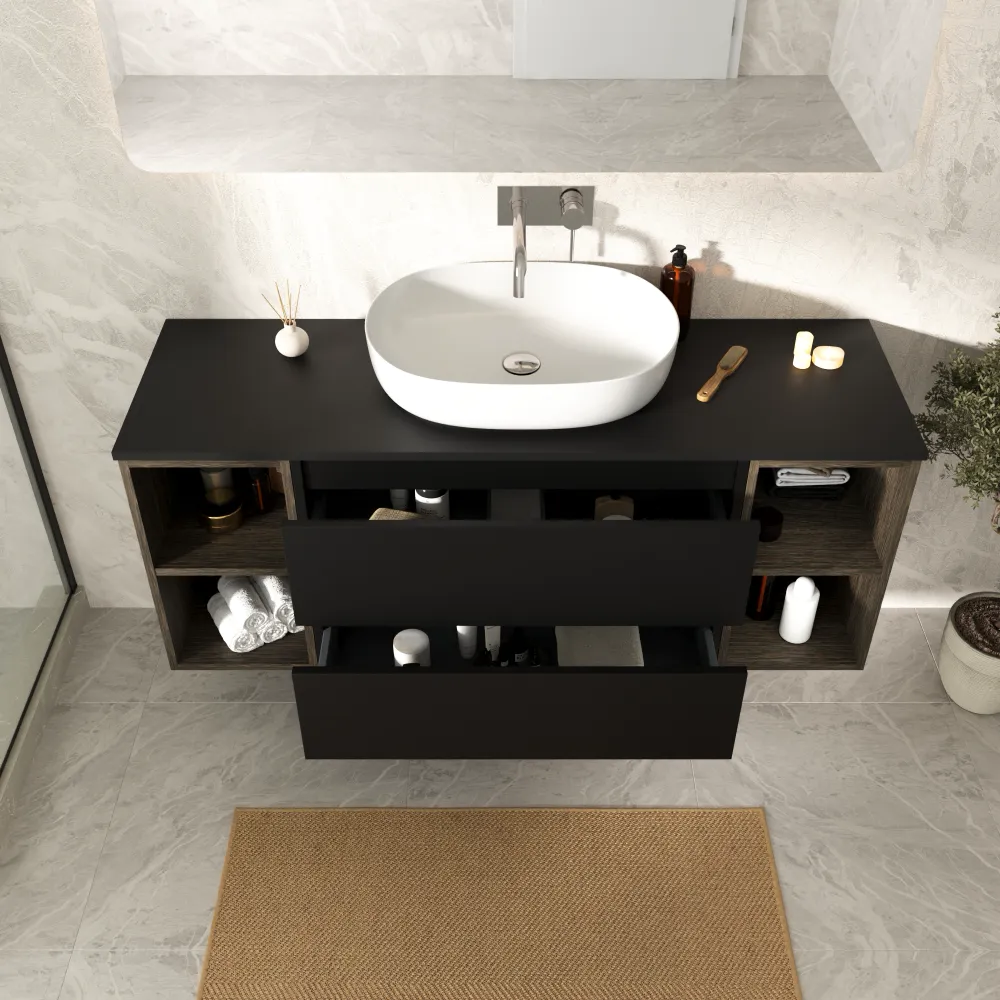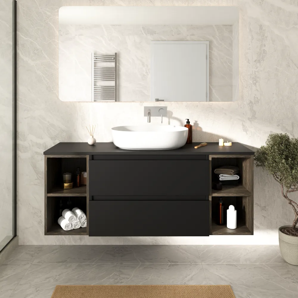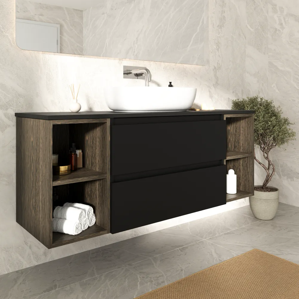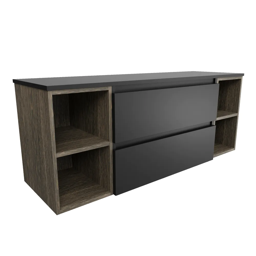 Mobile bagno sospeso 120cm due cassetti nero opaco e due vani a giorno rovere vintage wenge con top | Hexa