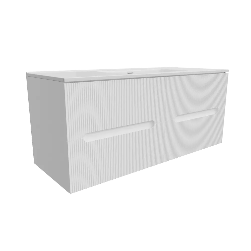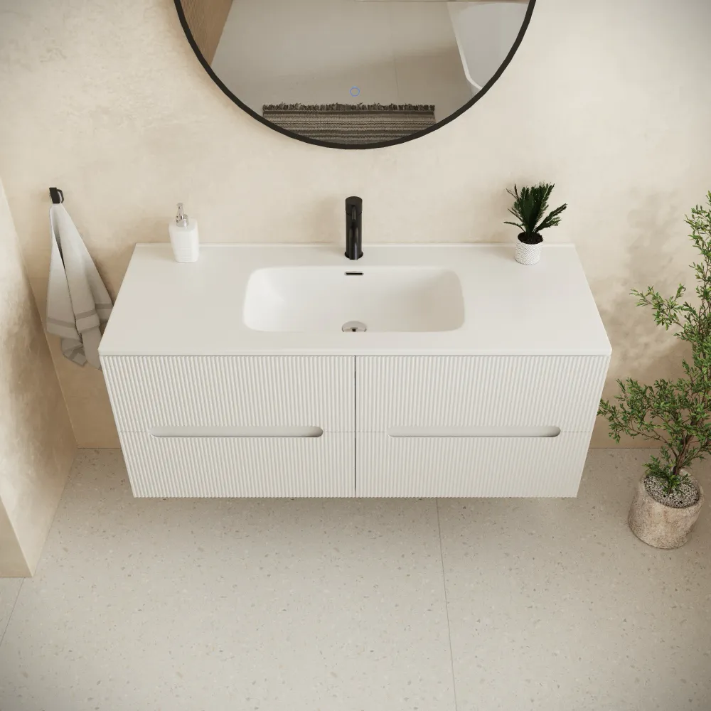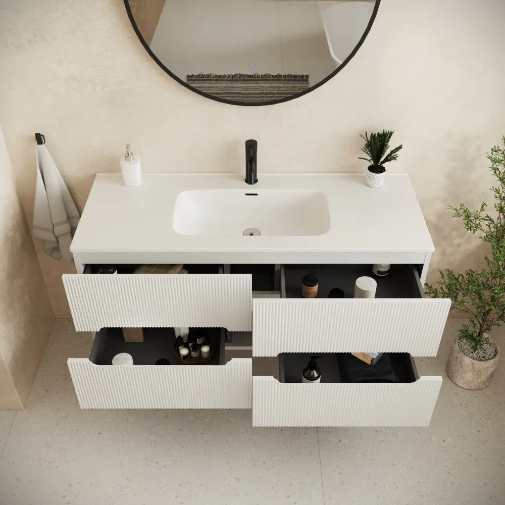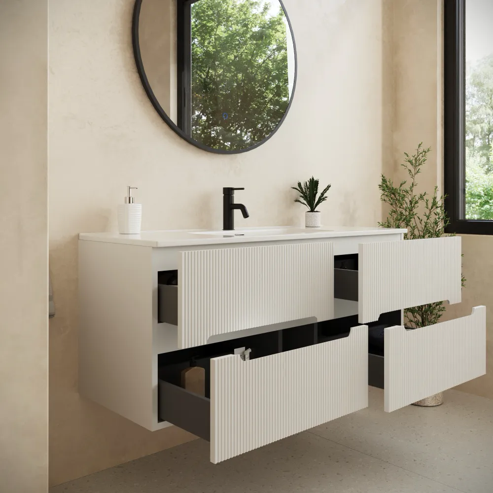 Mobile bagno sospeso 120cm quattro cassetti bianco opaco cannettato con lavabo | Tigua