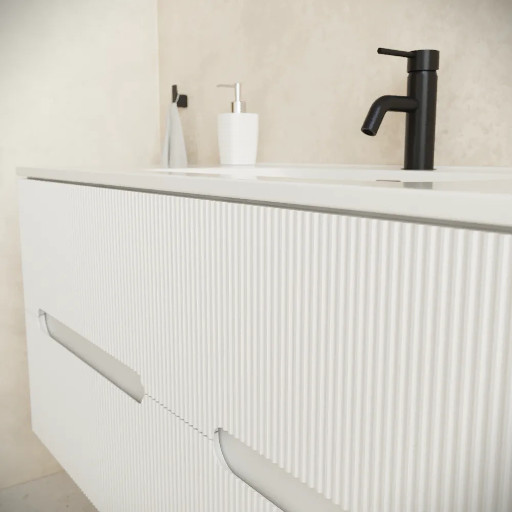 Il mobile da bagno sospeso della serie Tigua, con le sue dimensioni di 120 cm, combina funzionalità e design contemporaneo. La finitura in bianco opaco illumina l’ambiente, mentre il frontale cannettato crea un elegante gioco di luci e ombre che dona carattere e profondità al mobile.