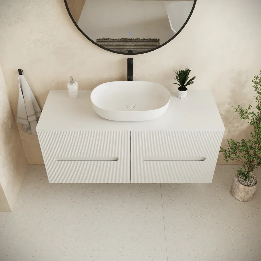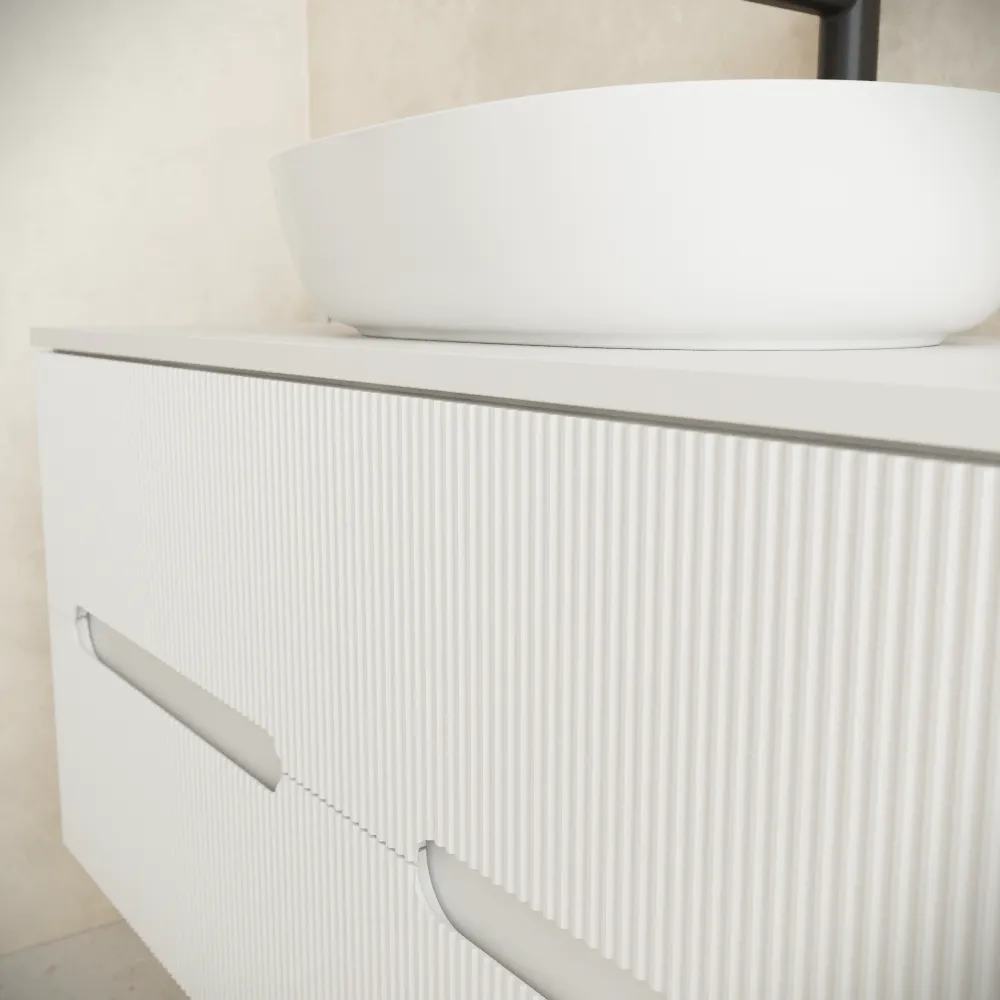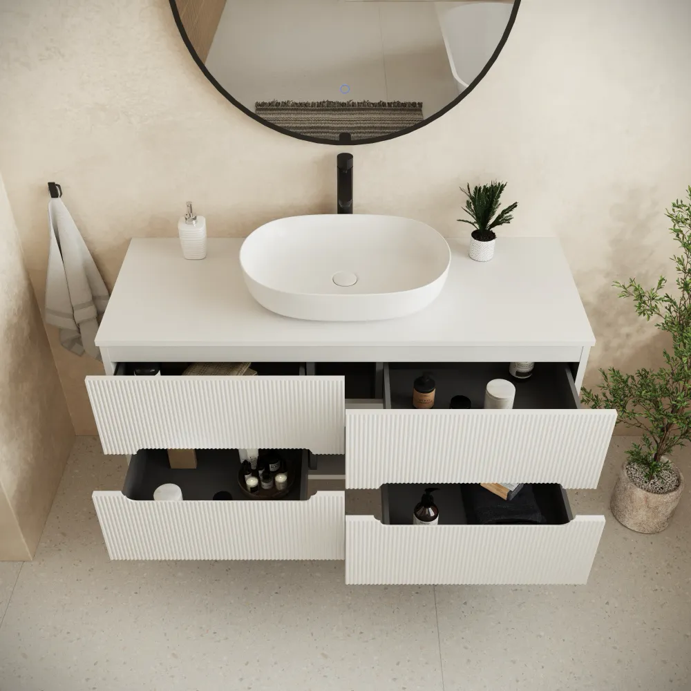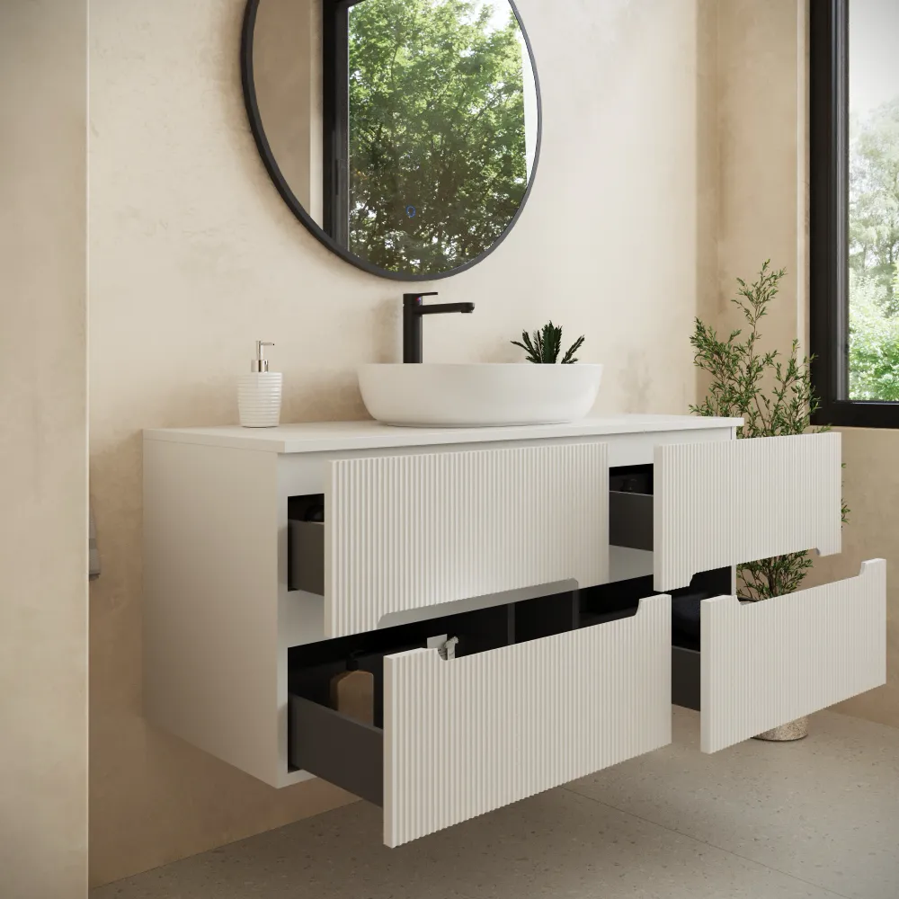 Mobile bagno sospeso 120cm quattro cassetti bianco opaco cannettato con top | Tigua