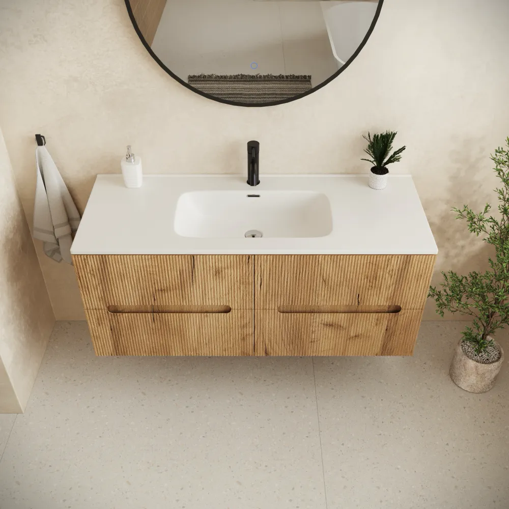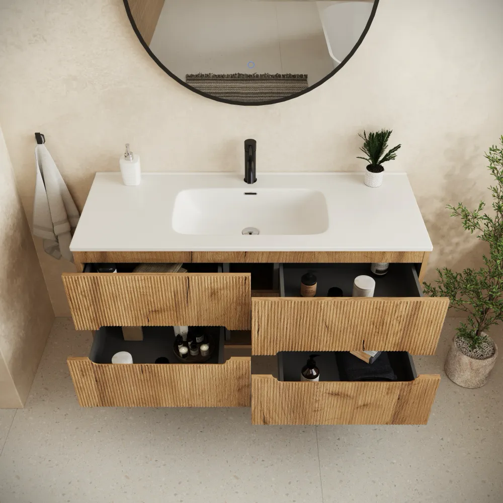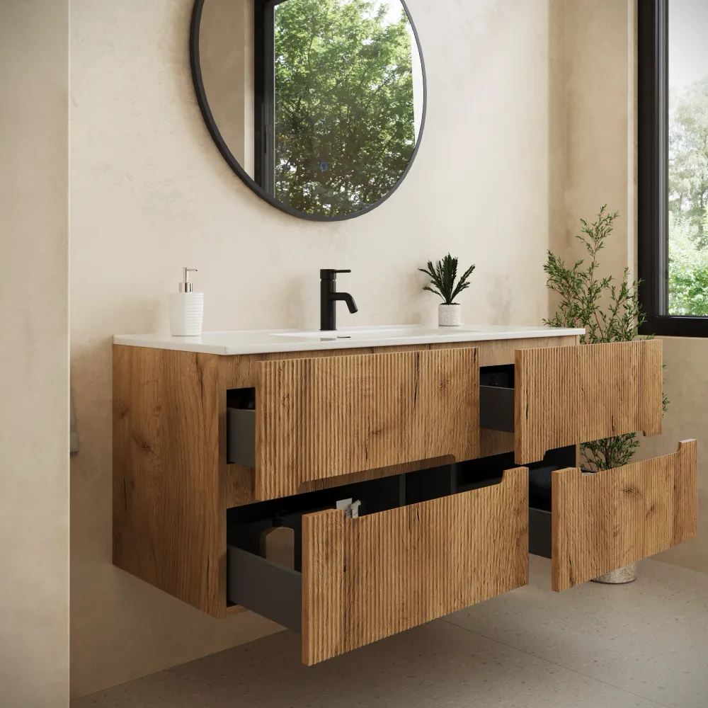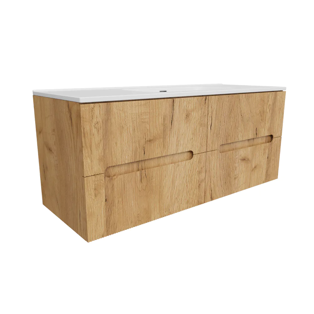 Mobile bagno sospeso 120cm quattro cassetti rovere chiaro cannettato con lavabo | Tigua