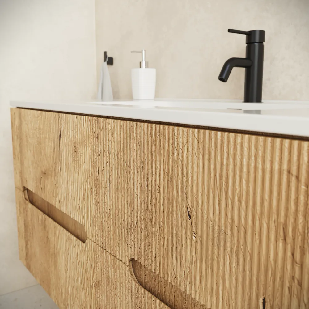 Il mobile da bagno sospeso della serie Tigua, con le sue dimensioni di 120 cm, combina funzionalità e design contemporaneo. La finitura in rovere chiaro illumina l’ambiente, mentre il frontale cannettato crea un elegante gioco di luci e ombre che dona carattere e profondità al mobile.