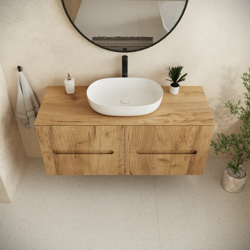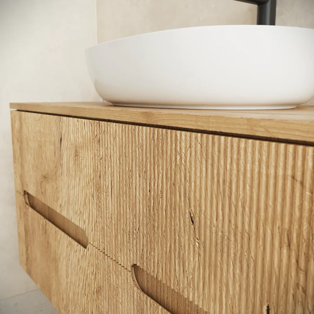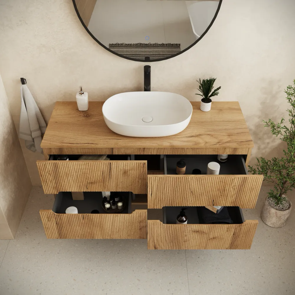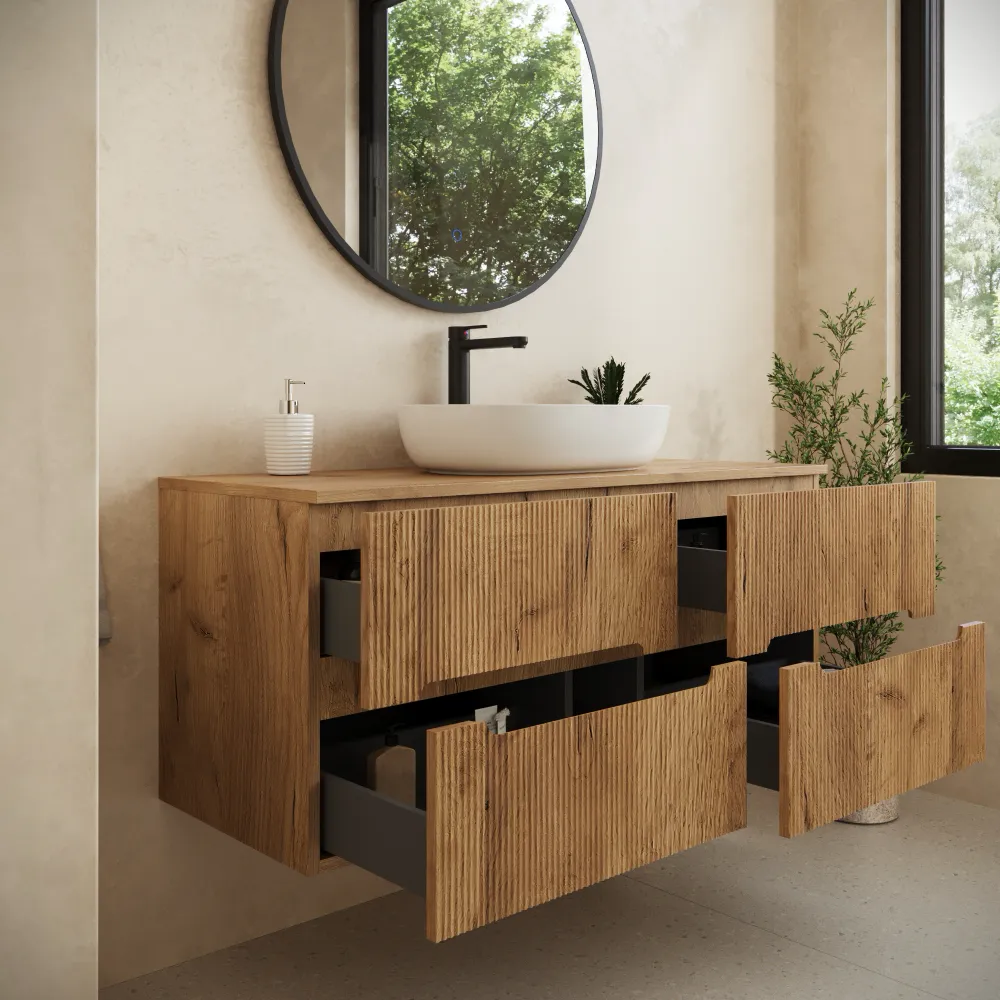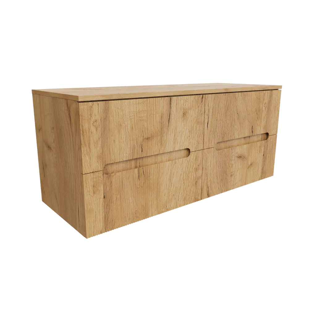 Mobile bagno sospeso 120cm quattro cassetti rovere chiaro cannettato con top | Tigua