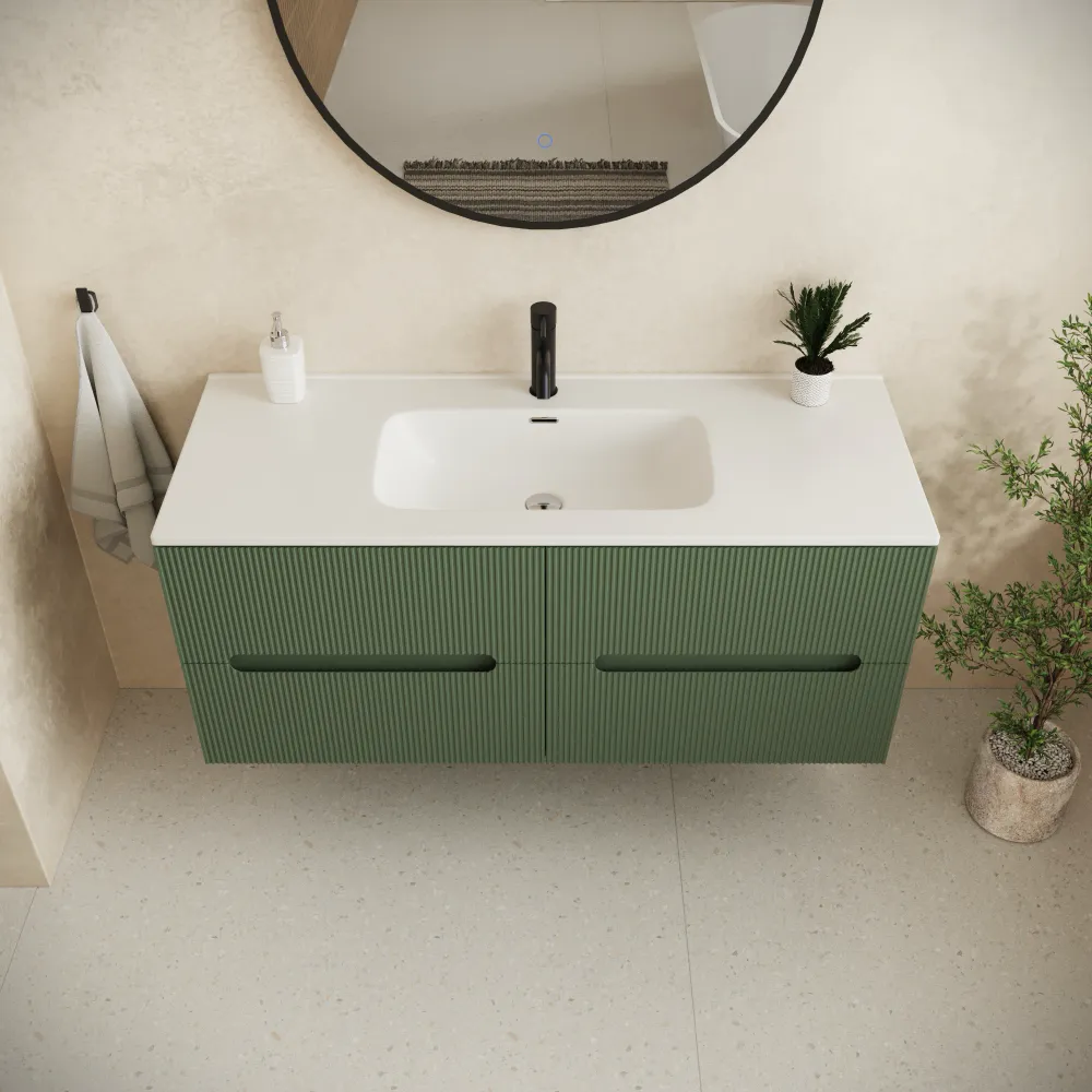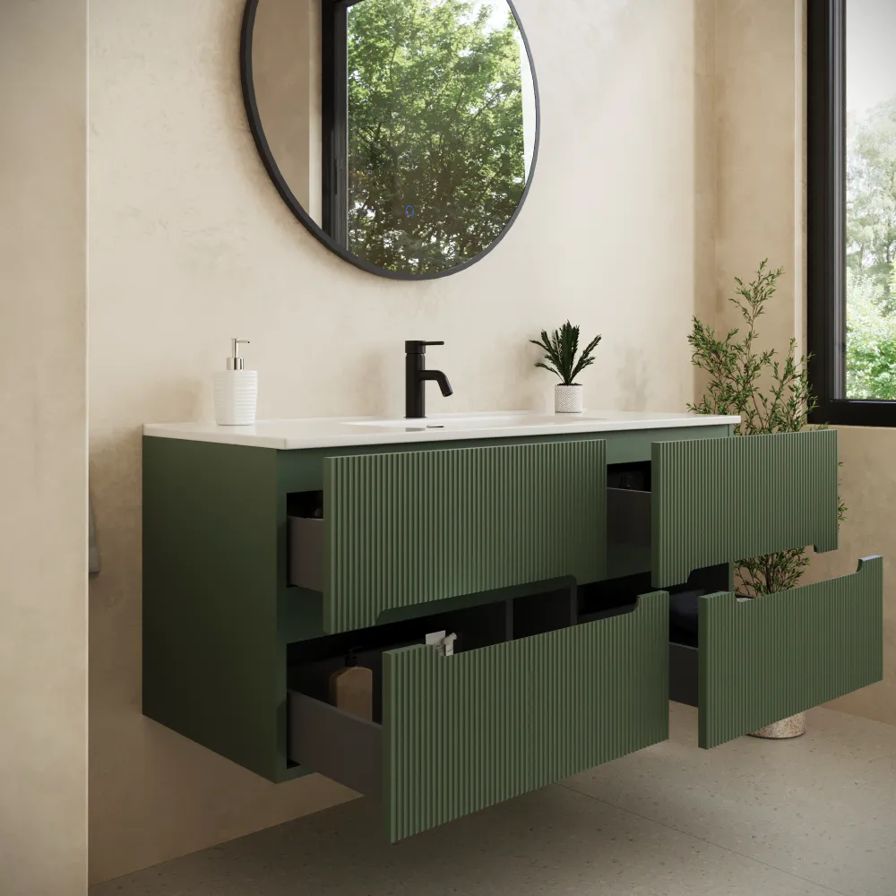 Il mobile da bagno sospeso della serie Tigua, con le sue dimensioni di 120 cm, combina funzionalità e design contemporaneo. La finitura in verde foresta illumina l’ambiente, mentre il frontale cannettato crea un elegante gioco di luci e ombre che dona carattere e profondità al mobile.