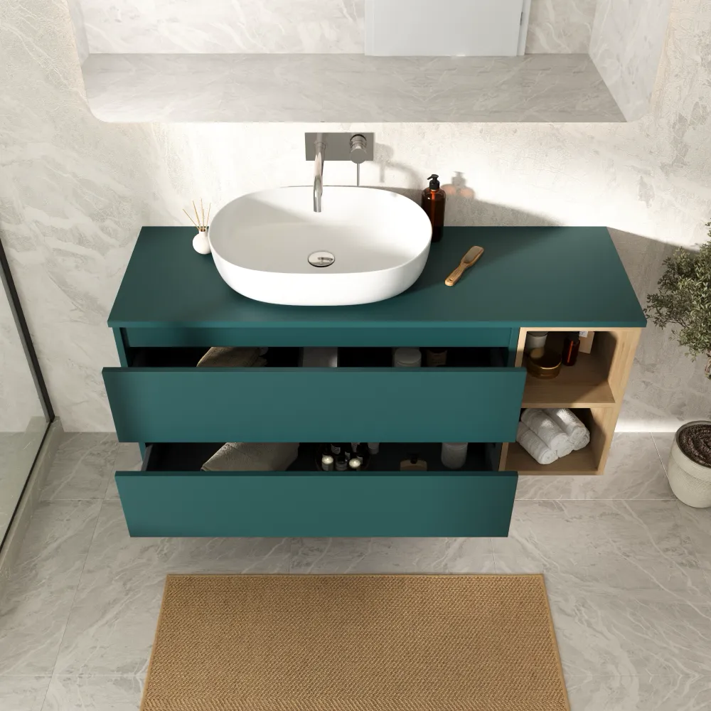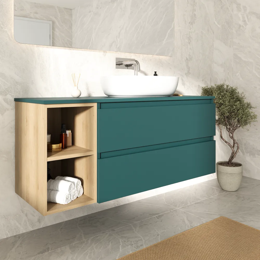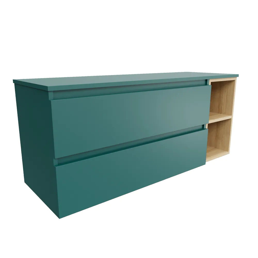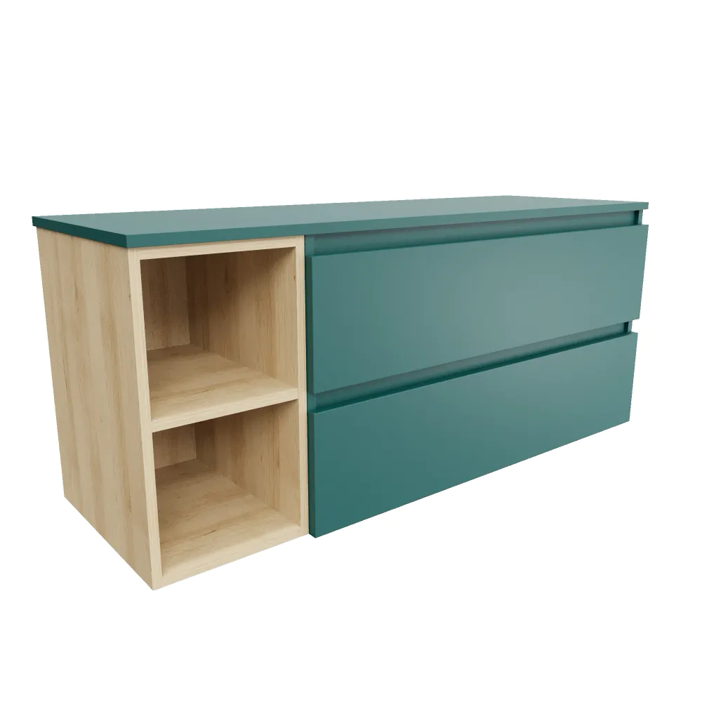 Mobile bagno sospeso 130cm due cassetti con top petrol e vano a giorno rovere chiaro | Hexa