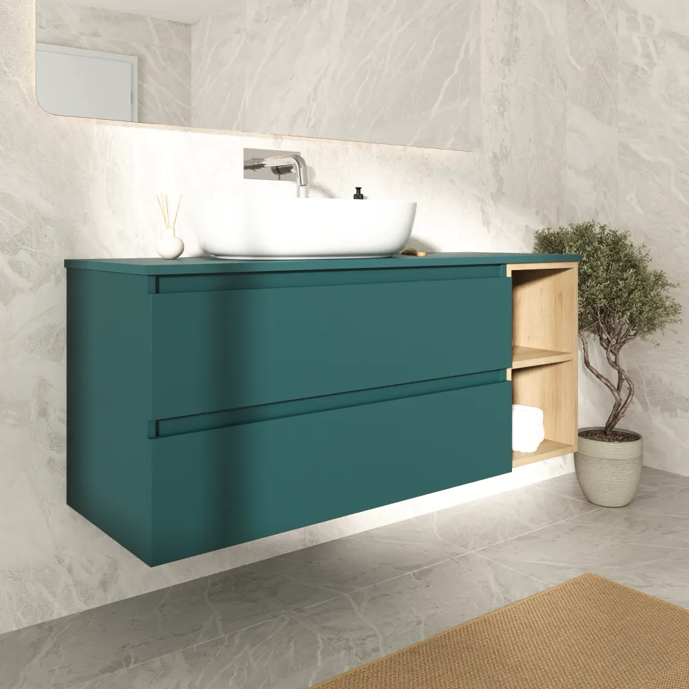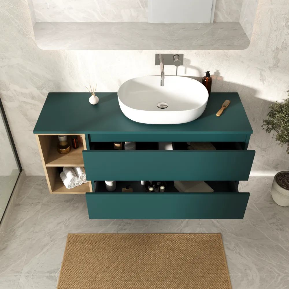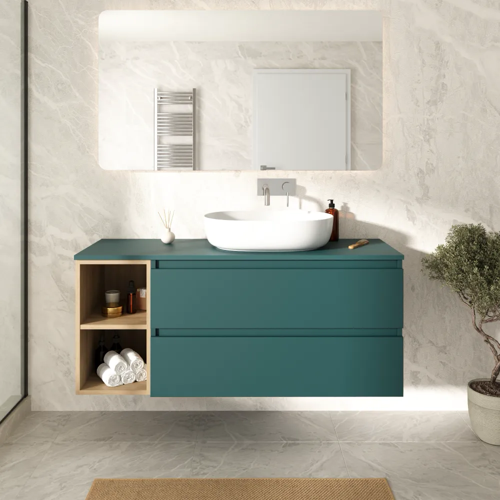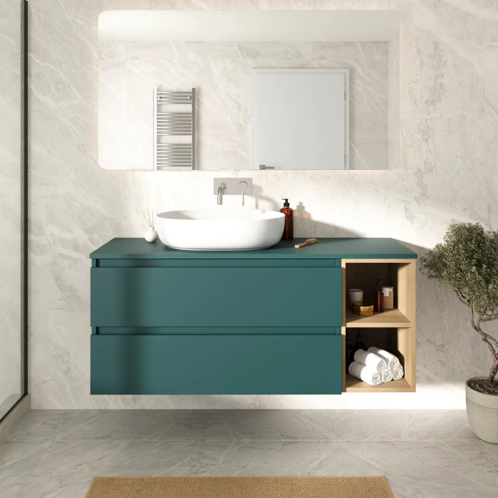 Mobile bagno sospeso 130cm due cassetti con top petrol e vano a giorno rovere chiaro | Hexa