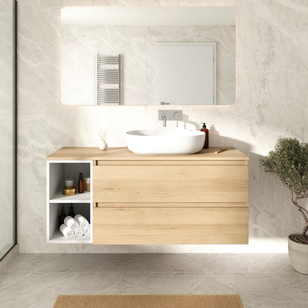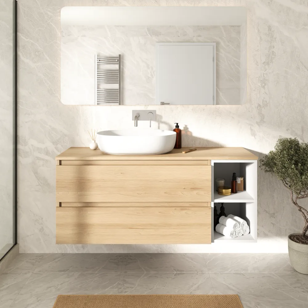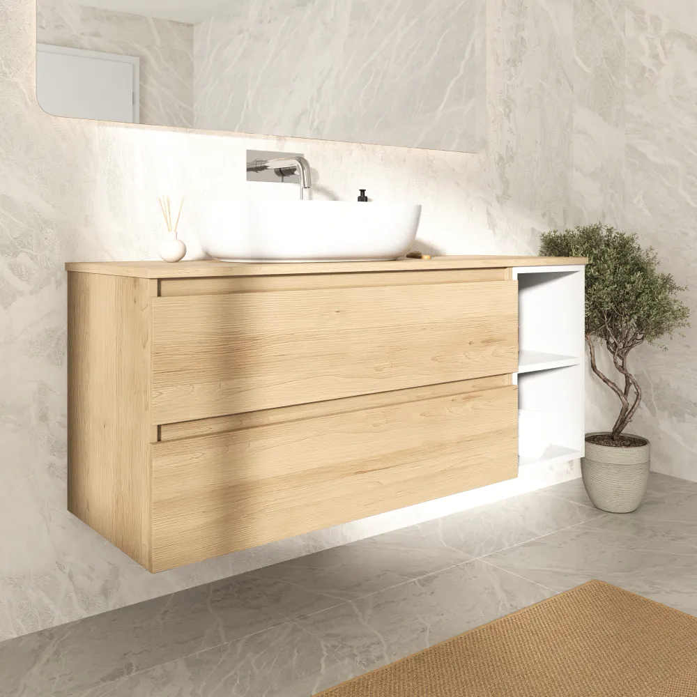 Mobile bagno sospeso 130cm due cassetti con top rovere chiaro stone oak e vano a giorno bianco opaco | Hexa