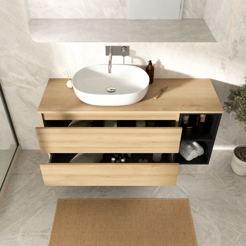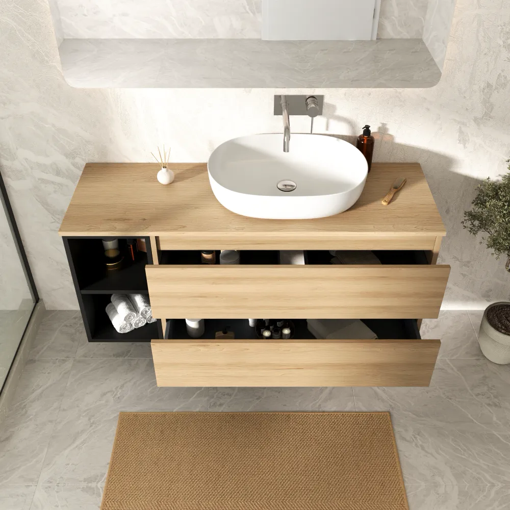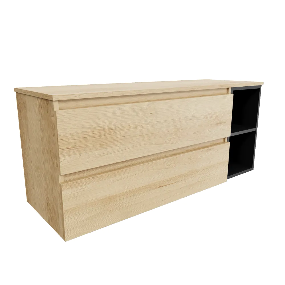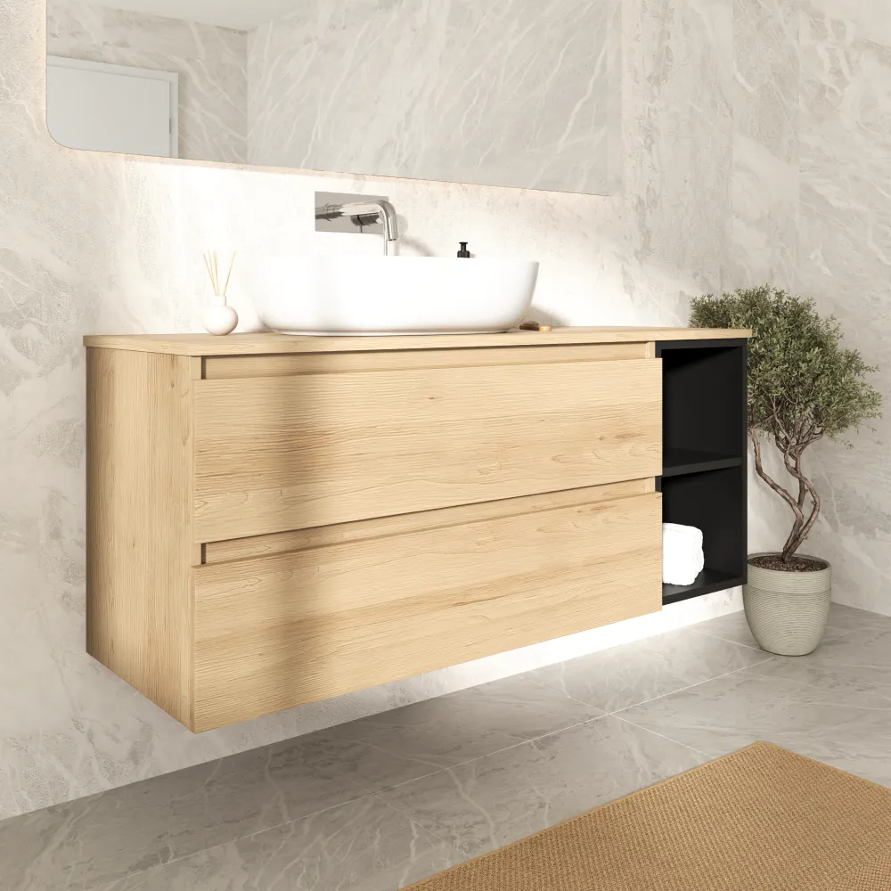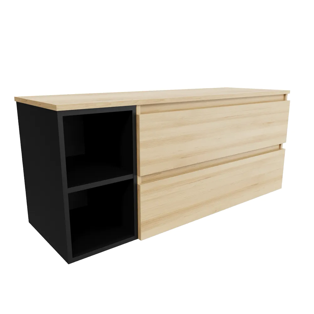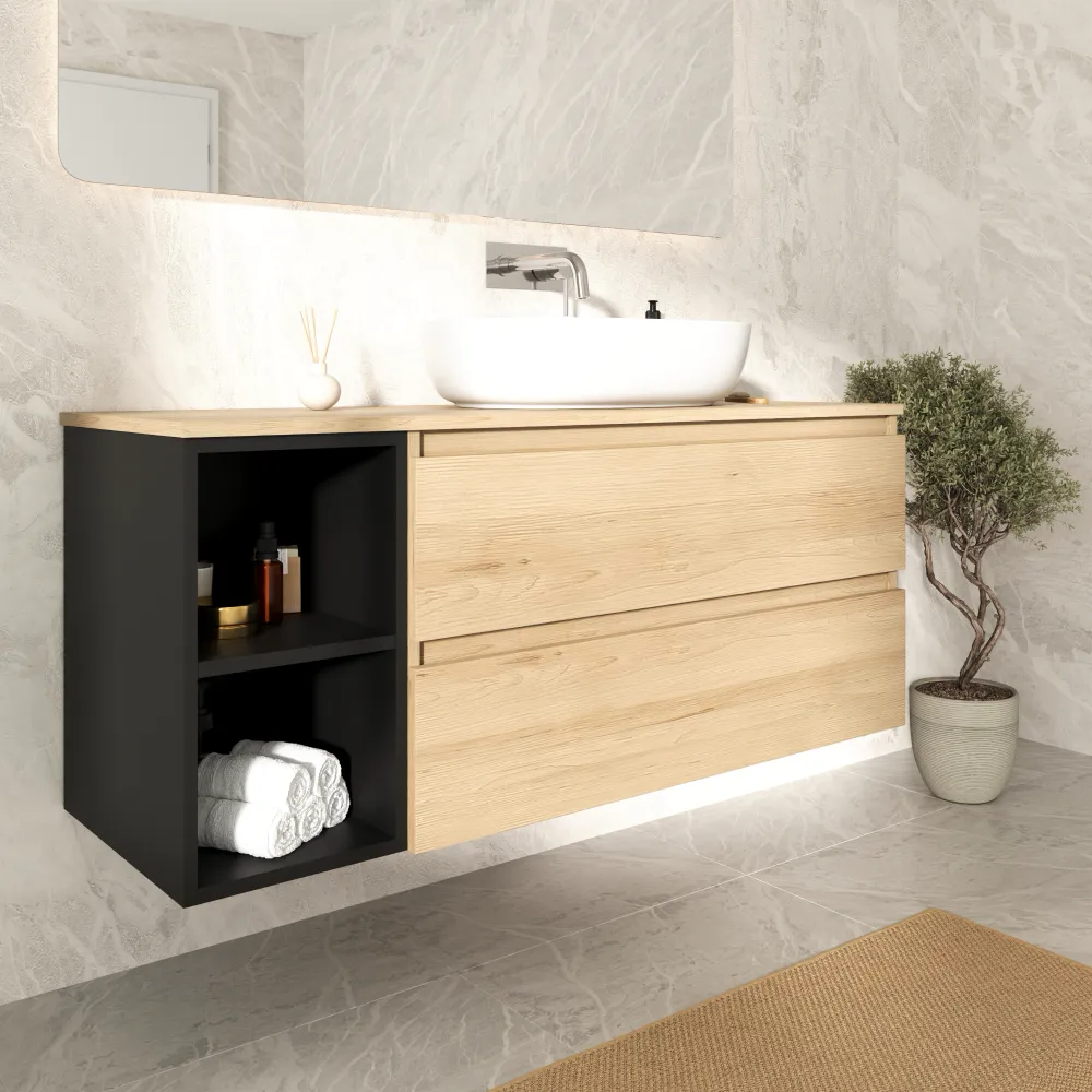 Mobile bagno sospeso 130cm due cassetti con top rovere chiaro stone oak e vano a giorno nero opaco | Hexa