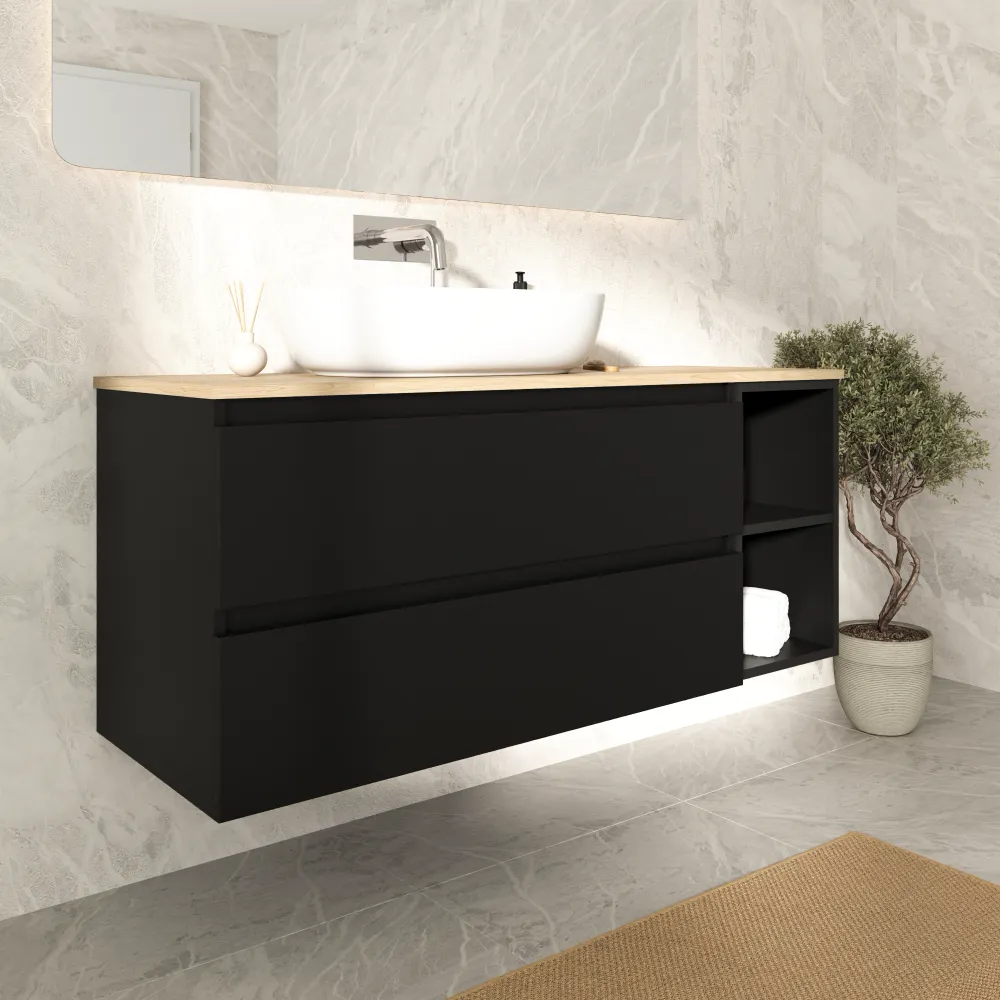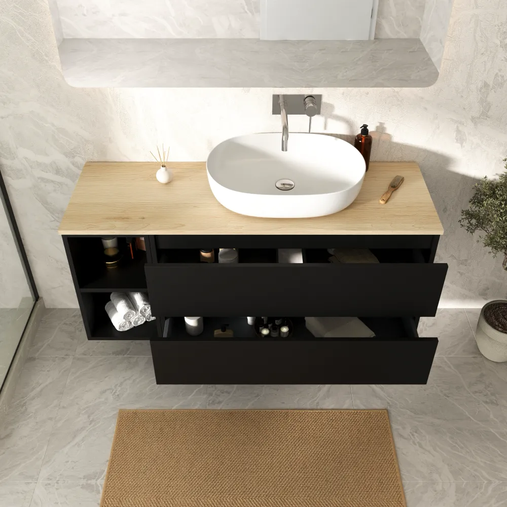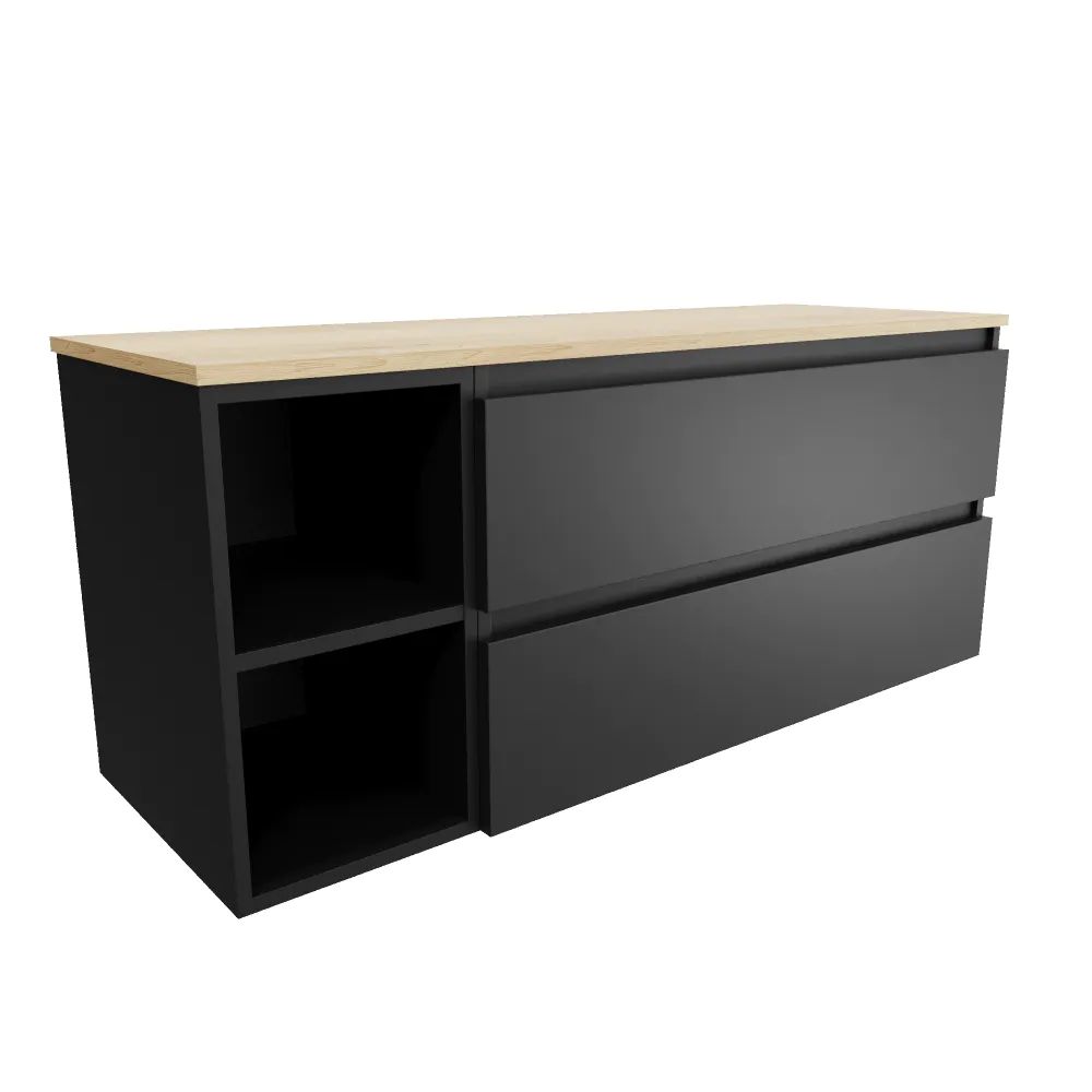 Mobile bagno sospeso 130cm due cassetti con vano a giorno nero opaco e top rovere chiaro | Hexa