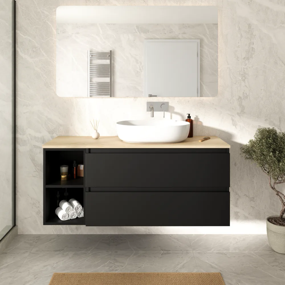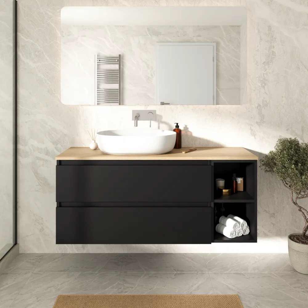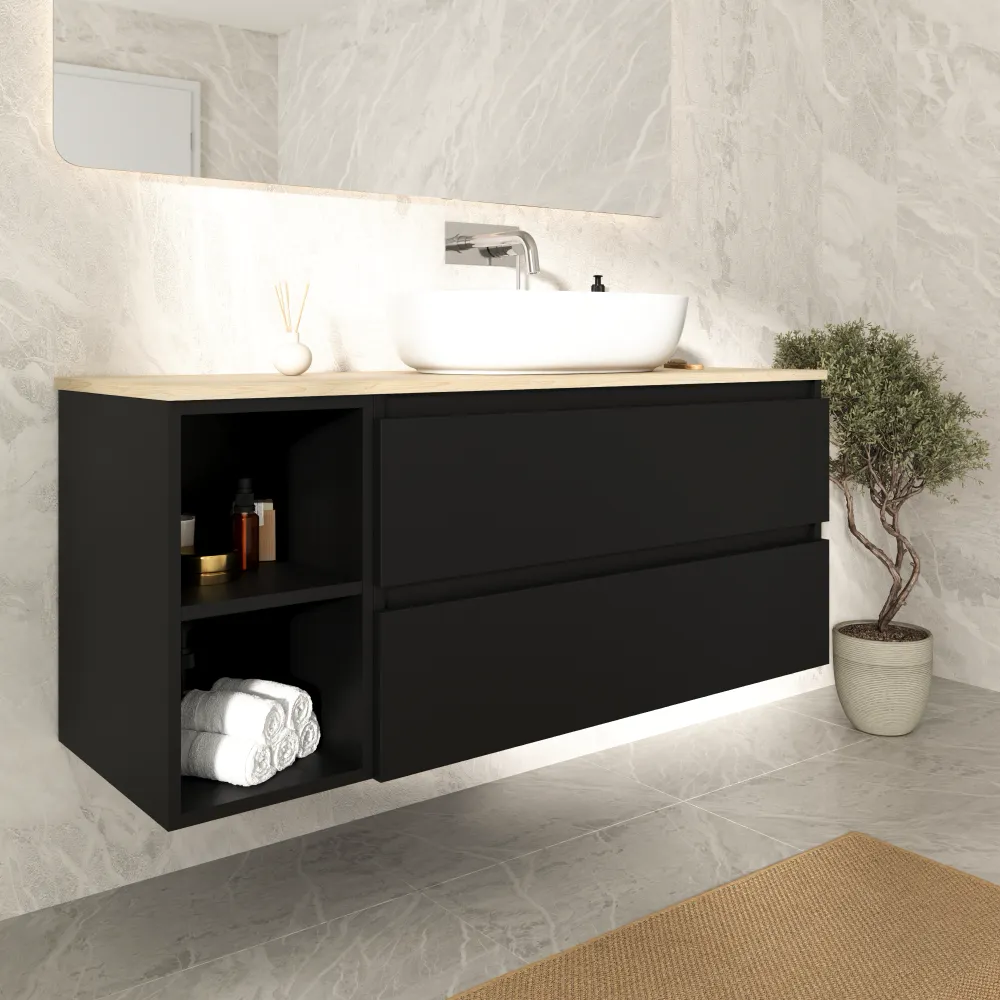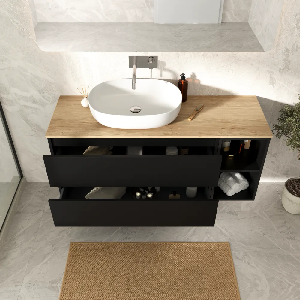 Mobile bagno sospeso 130cm due cassetti con vano a giorno nero opaco e top rovere chiaro | Hexa