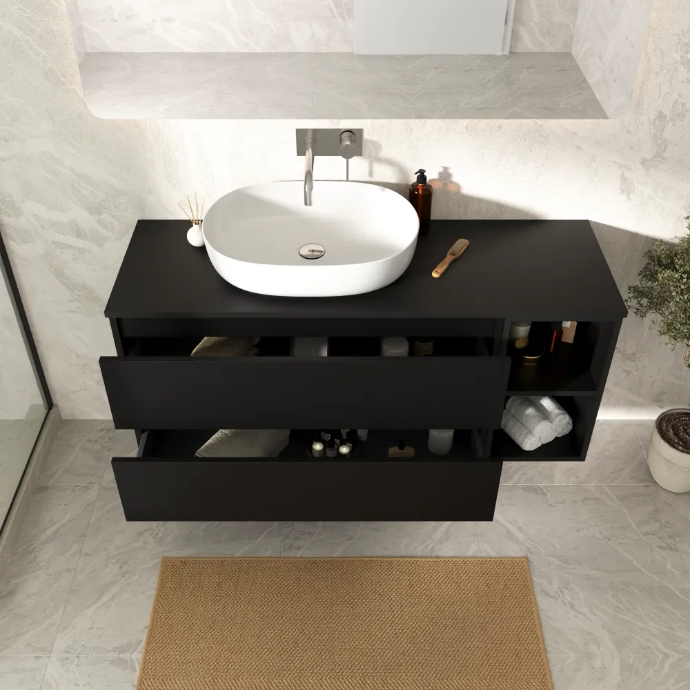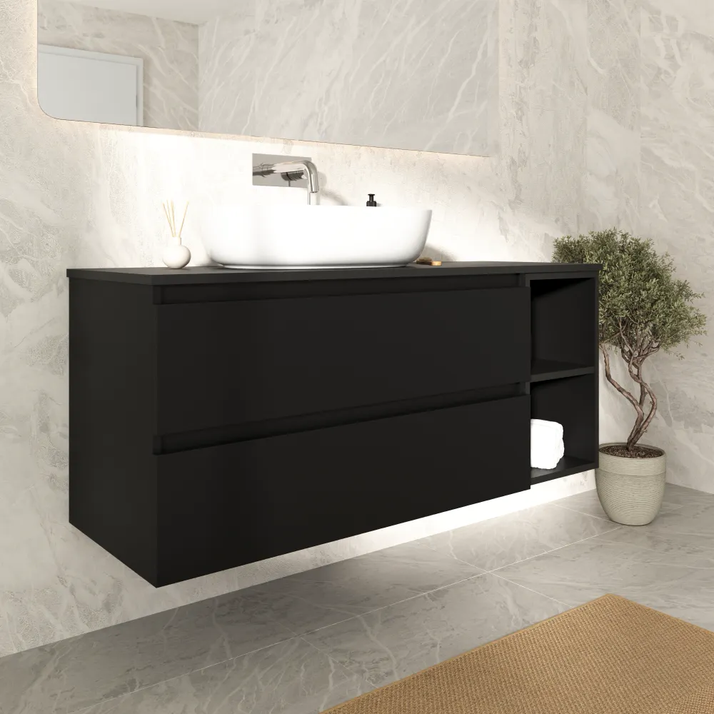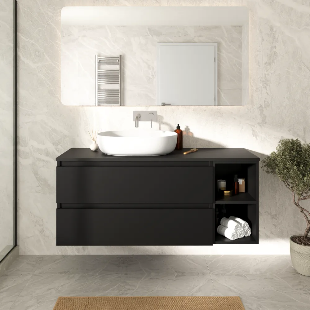 Mobile bagno sospeso 130cm due cassetti nero opaco con top e vano a giorno | Hexa