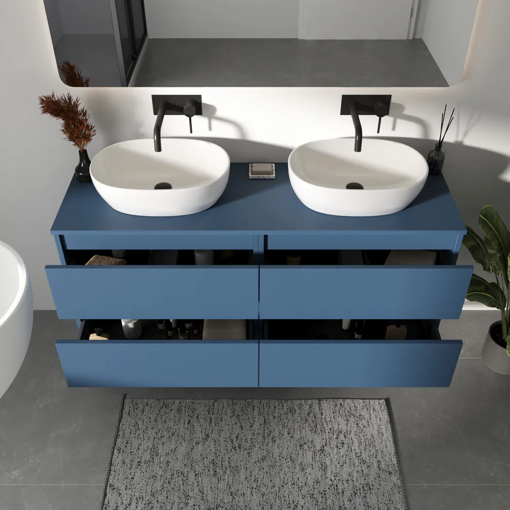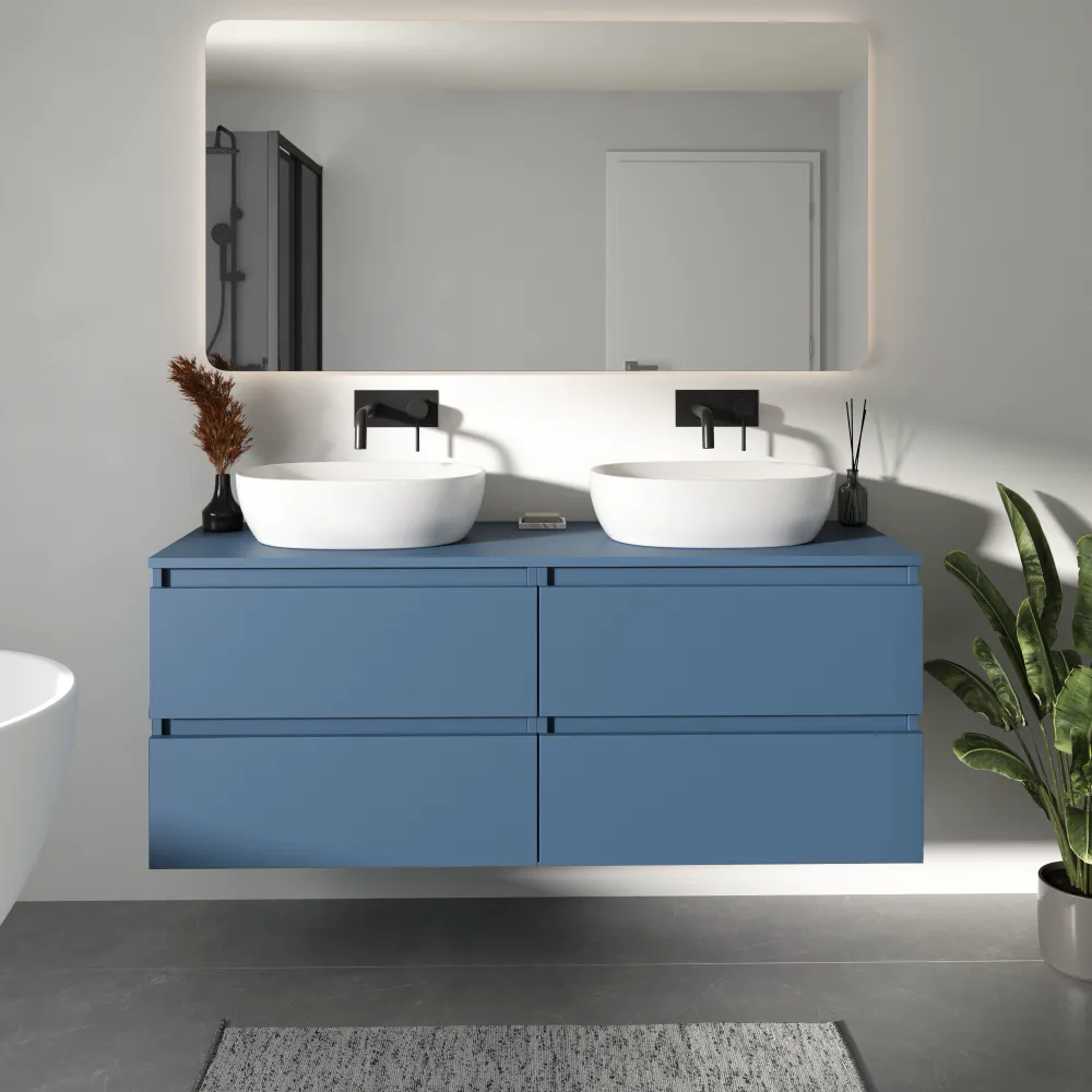 Il mobile è fornito con un top in Alby Blue pronto per il lavabo da appoggio. La superficie è resistente, facile da pulire e offre ampio spazio d’appoggio per gli accessori del bagno.
