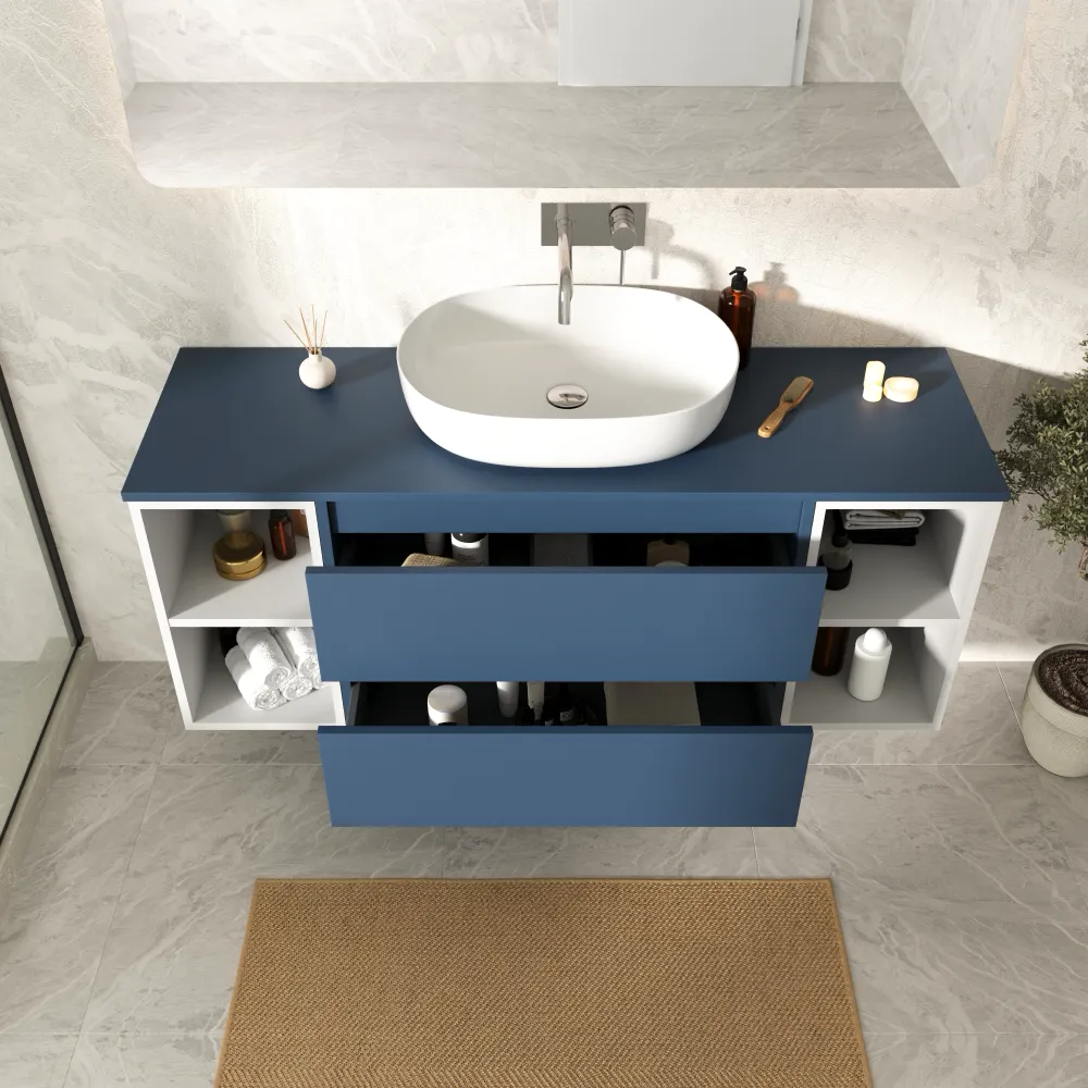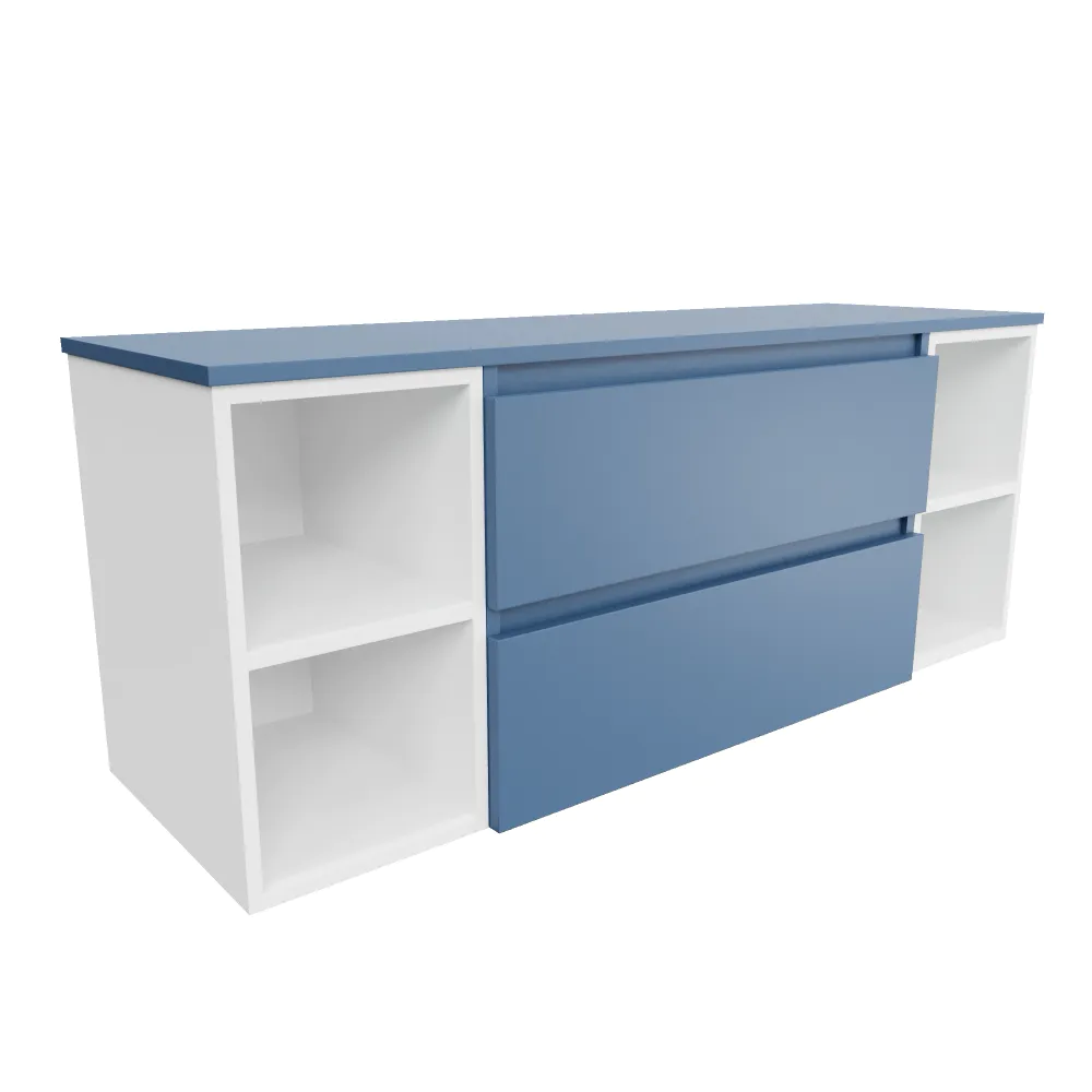 Mobile bagno sospeso 140cm due cassetti con top alby blue e due vani a giorno bianco opaco | Hexa