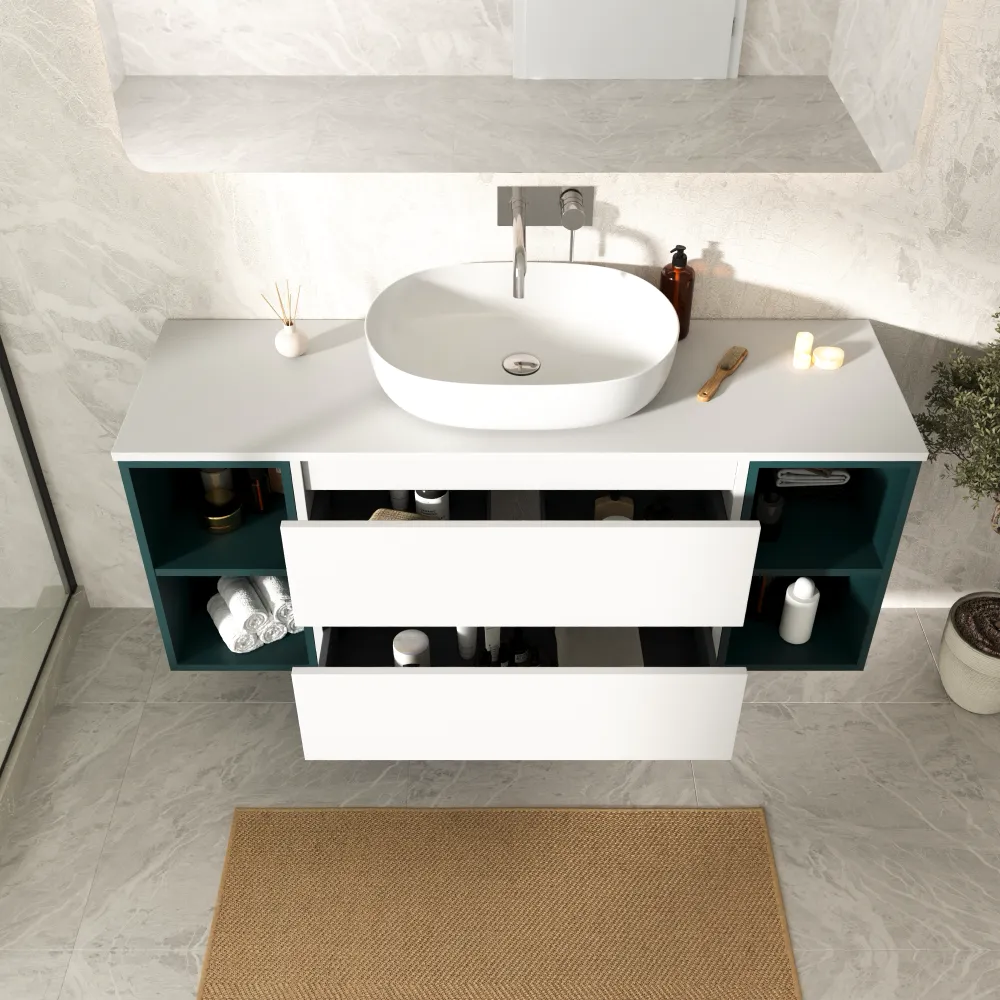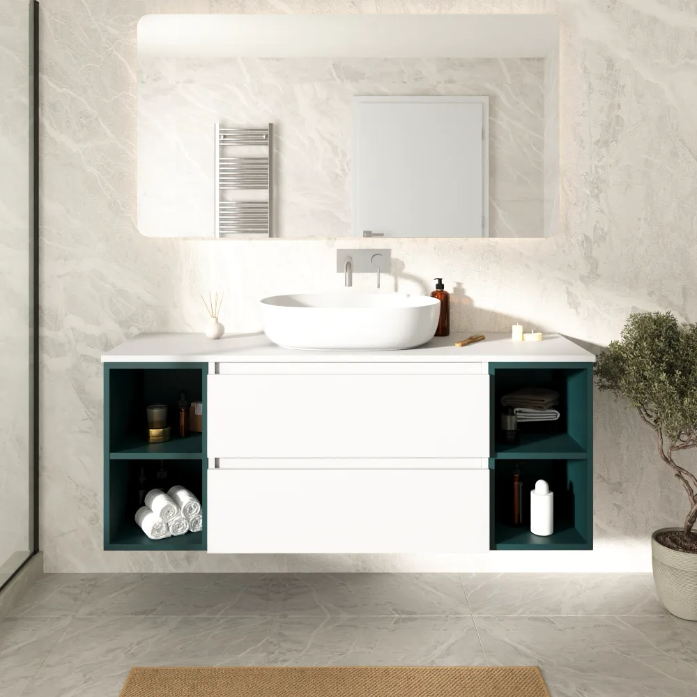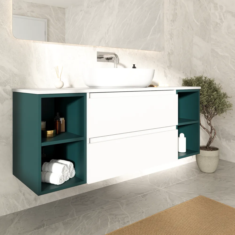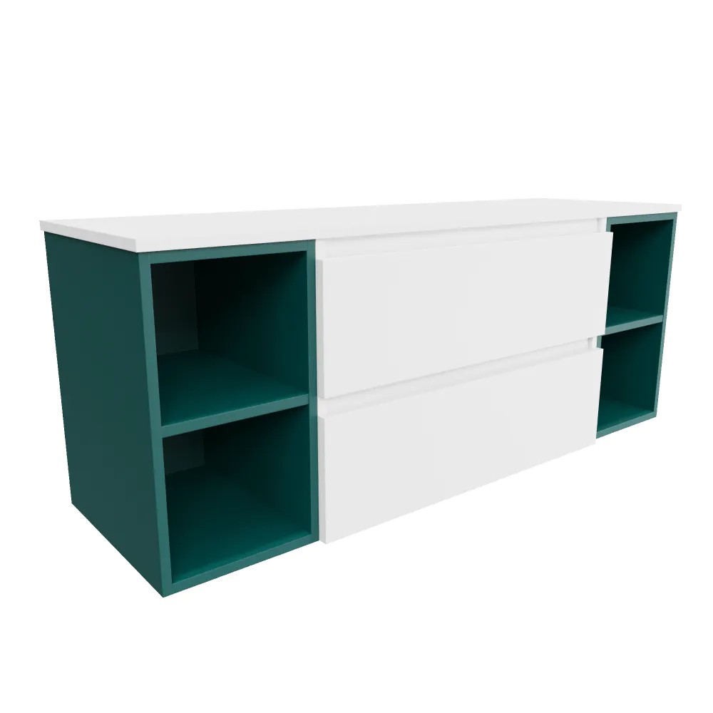 Mobile bagno sospeso 140cm due cassetti con top bianco opaco e due vani a giorno petrol | Hexa