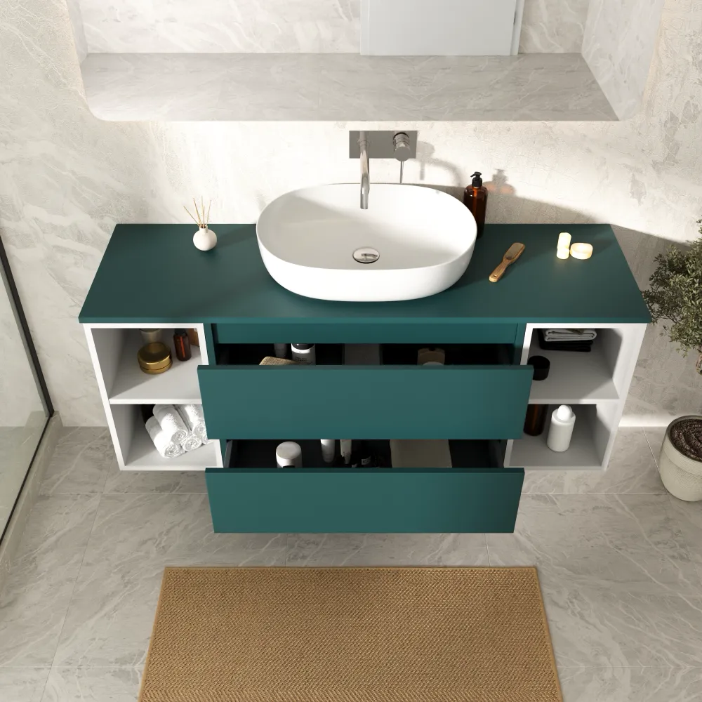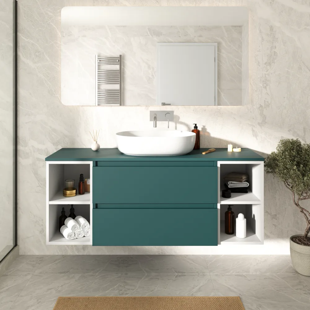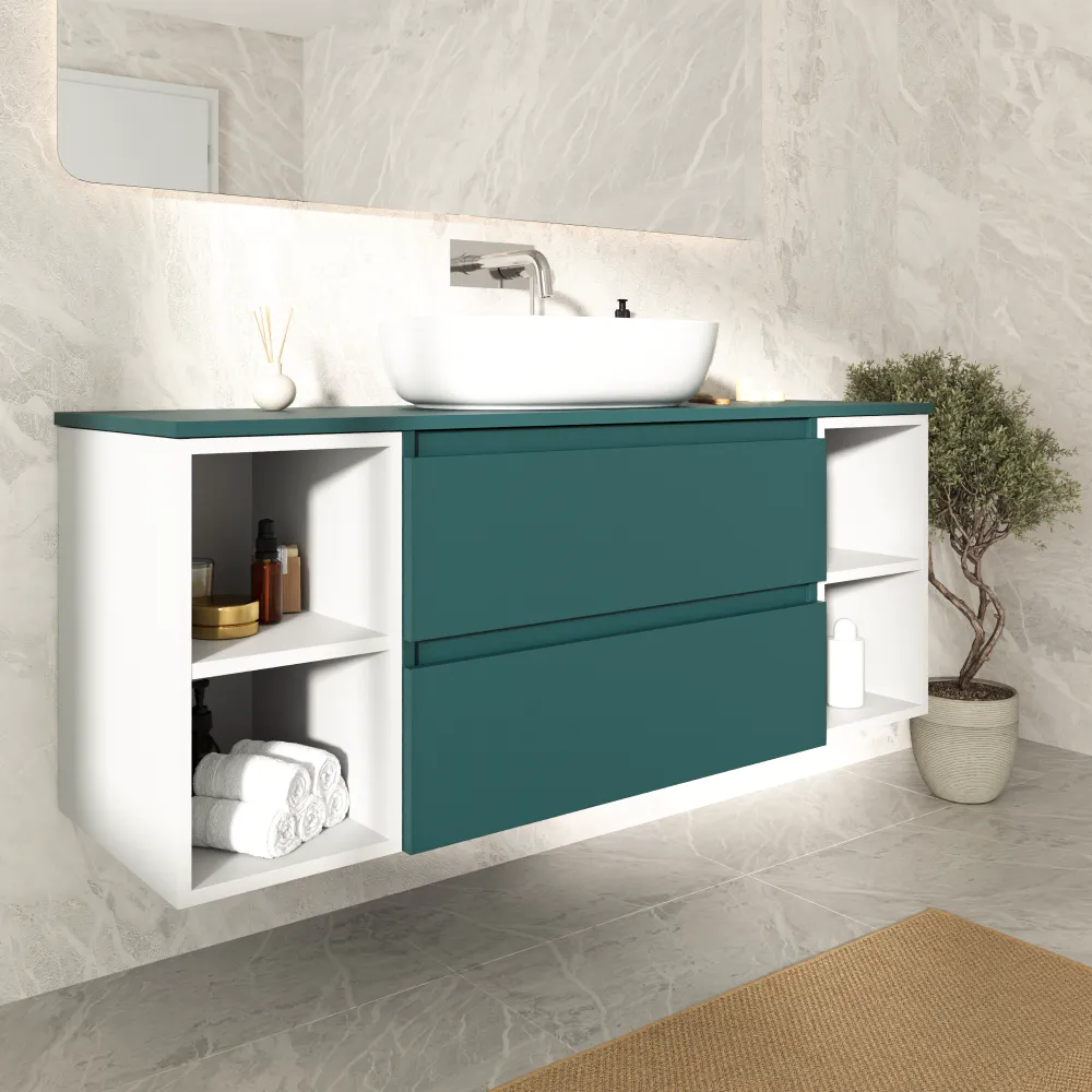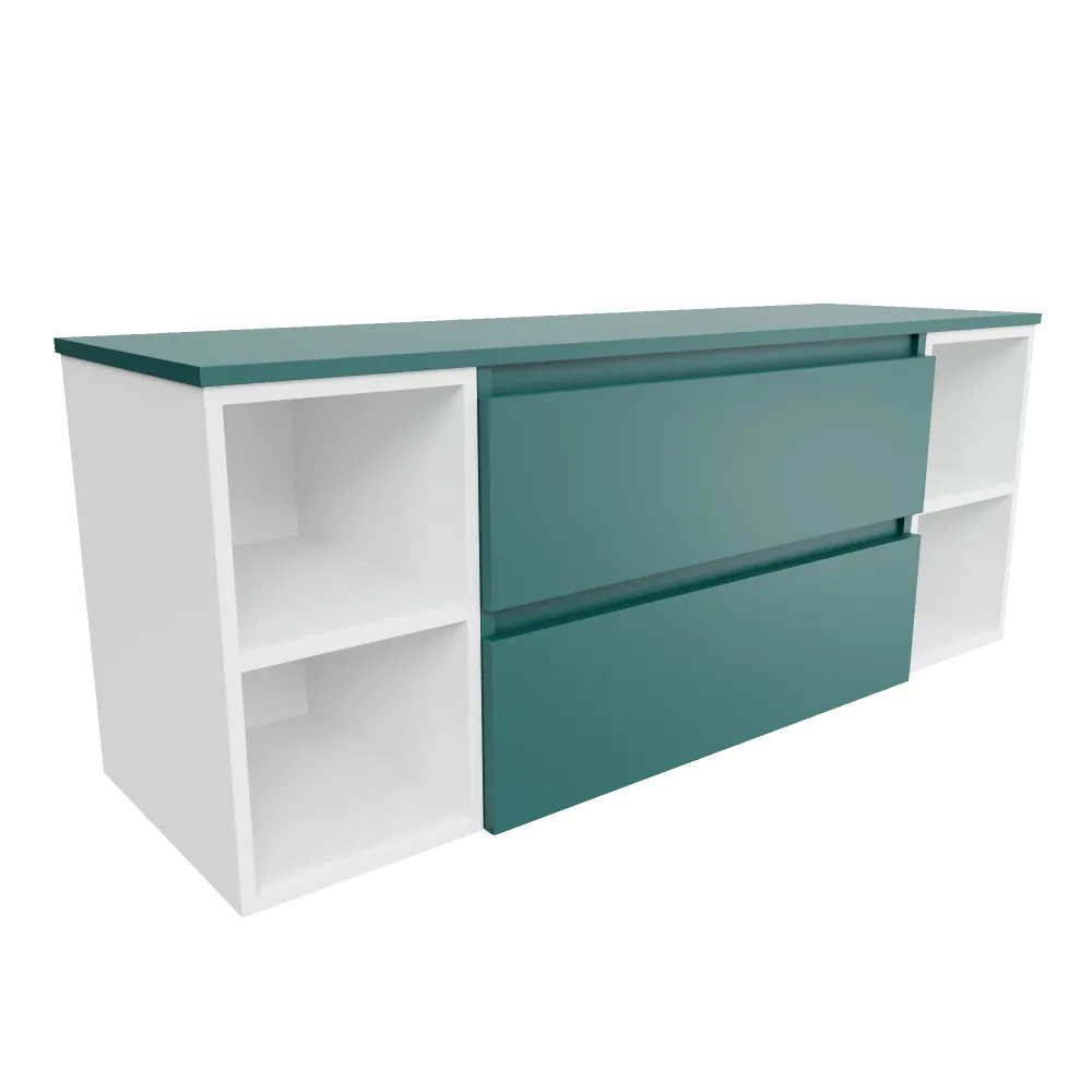 Mobile bagno sospeso 140cm due cassetti con top petrol e due vani a giorno bianco opaco | Hexa