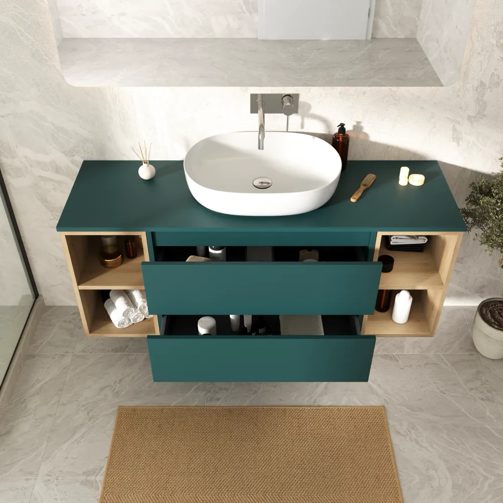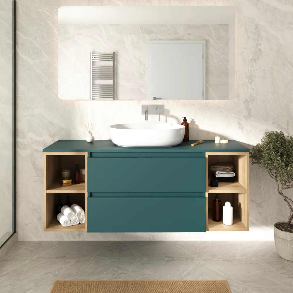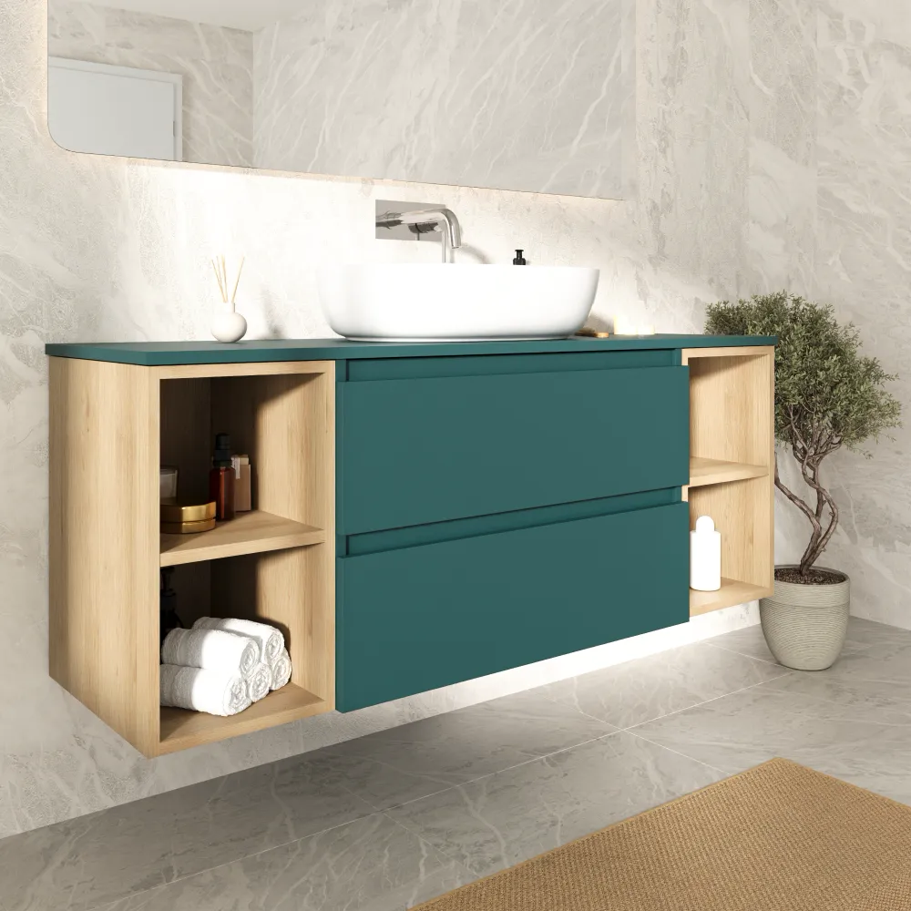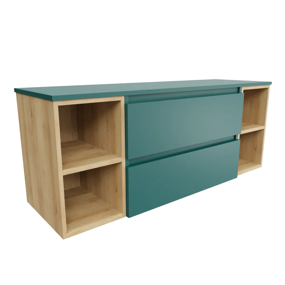 Mobile bagno sospeso 140cm due cassetti con top petrol e due vani a giorno rovere chiaro | Hexa