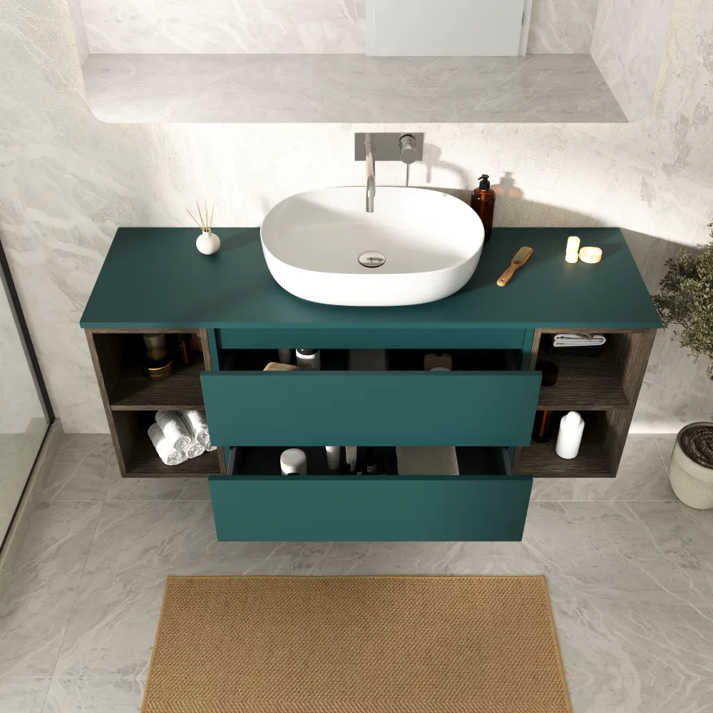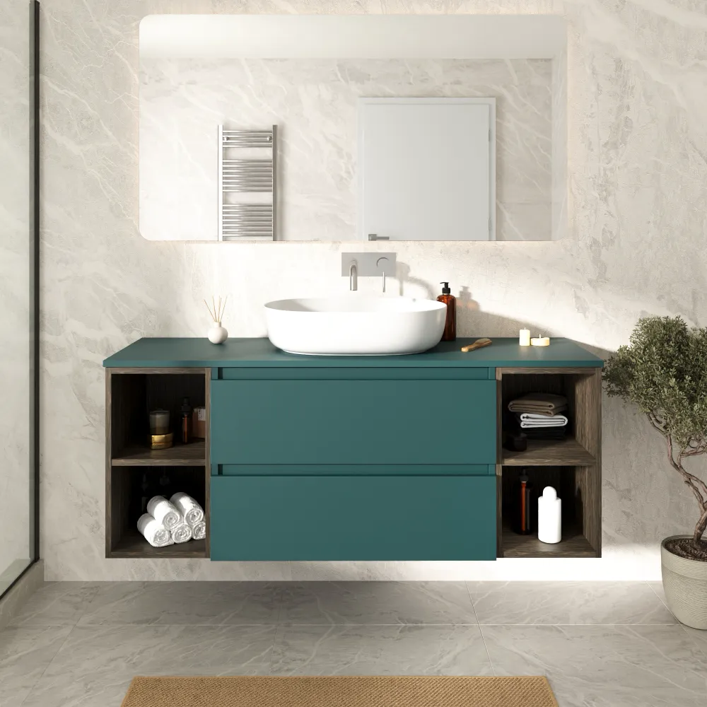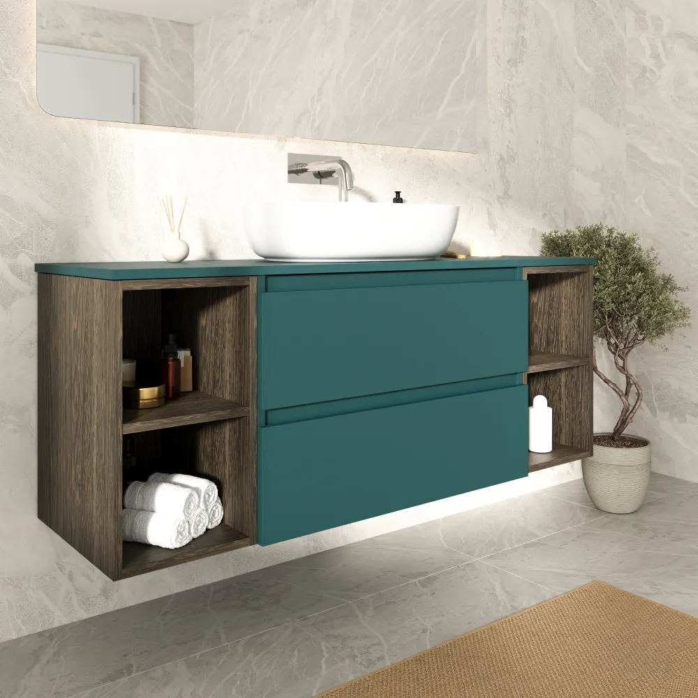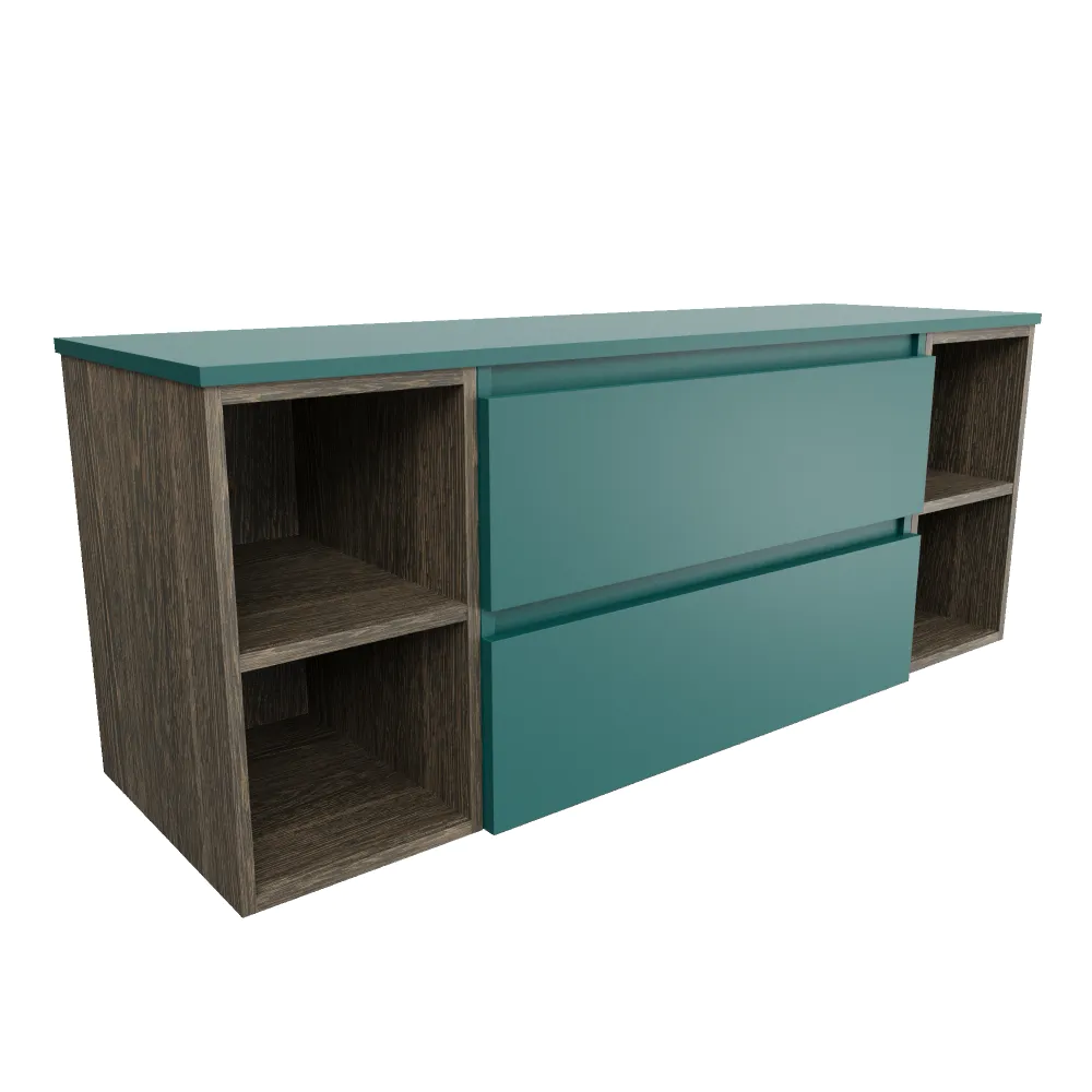 Mobile bagno sospeso 140cm due cassetti con top petrol e due vani a giorno rovere vintage wenge | Hexa
