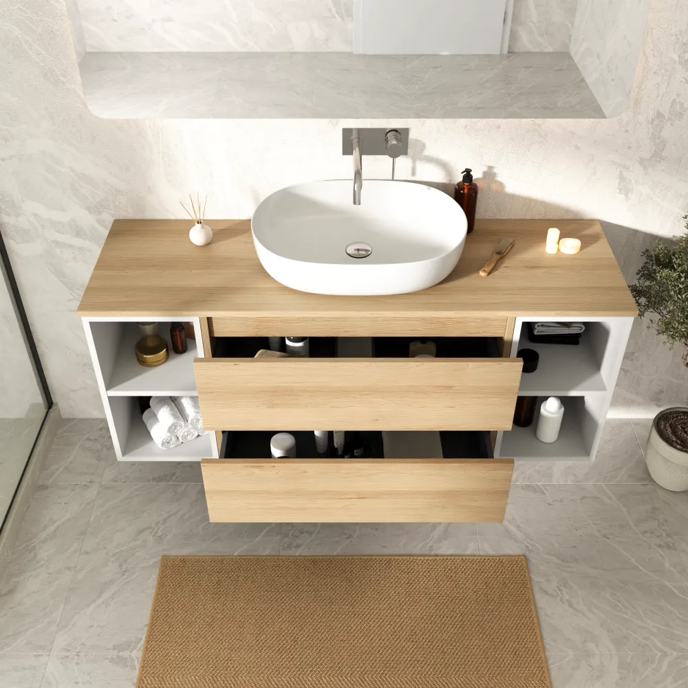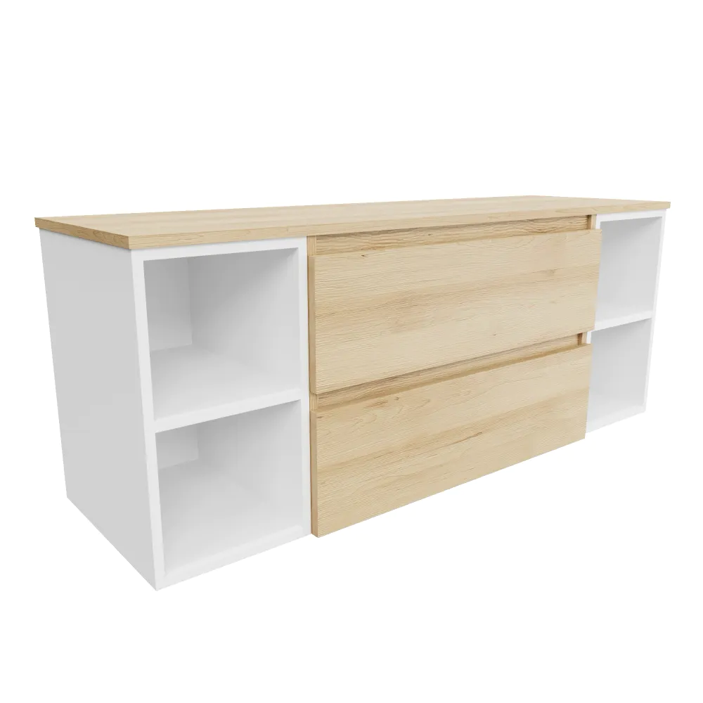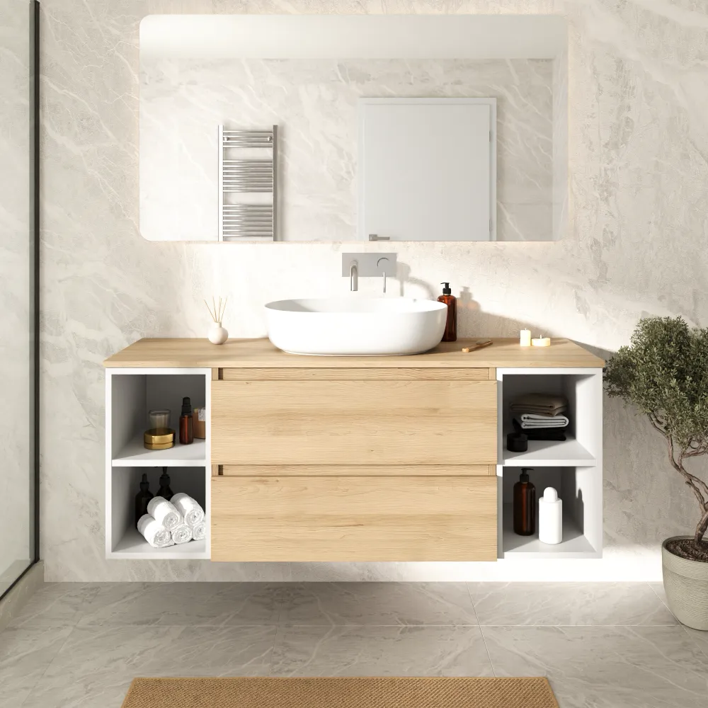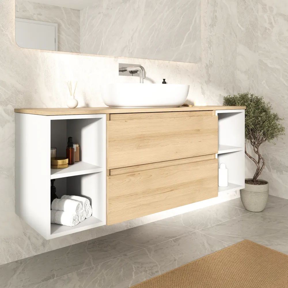 Mobile bagno sospeso 140cm due cassetti con top rovere chiaro stone oak e due vani a giorno bianco opaco | Hexa