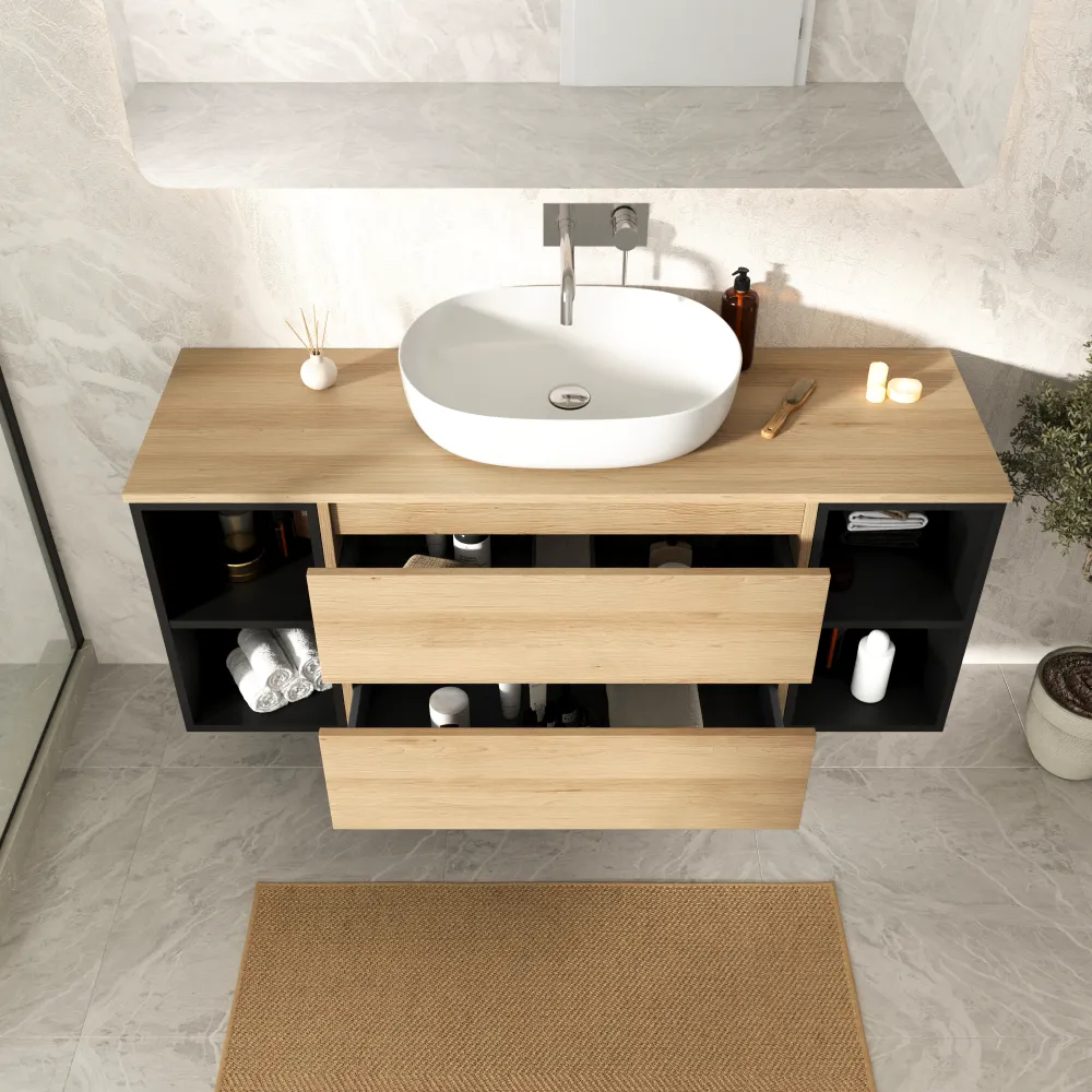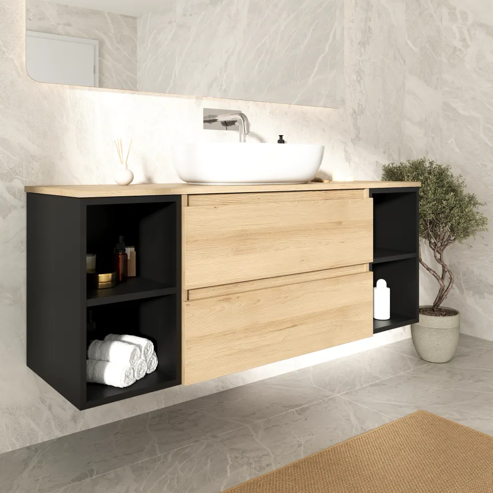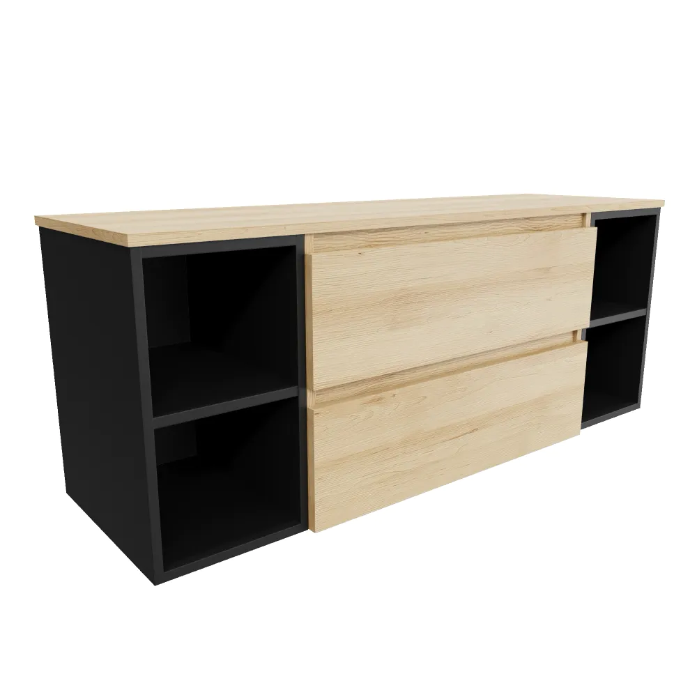 Mobile bagno sospeso 140cm due cassetti con top rovere chiaro stone oak e due vani a giorno nero opaco | Hexa