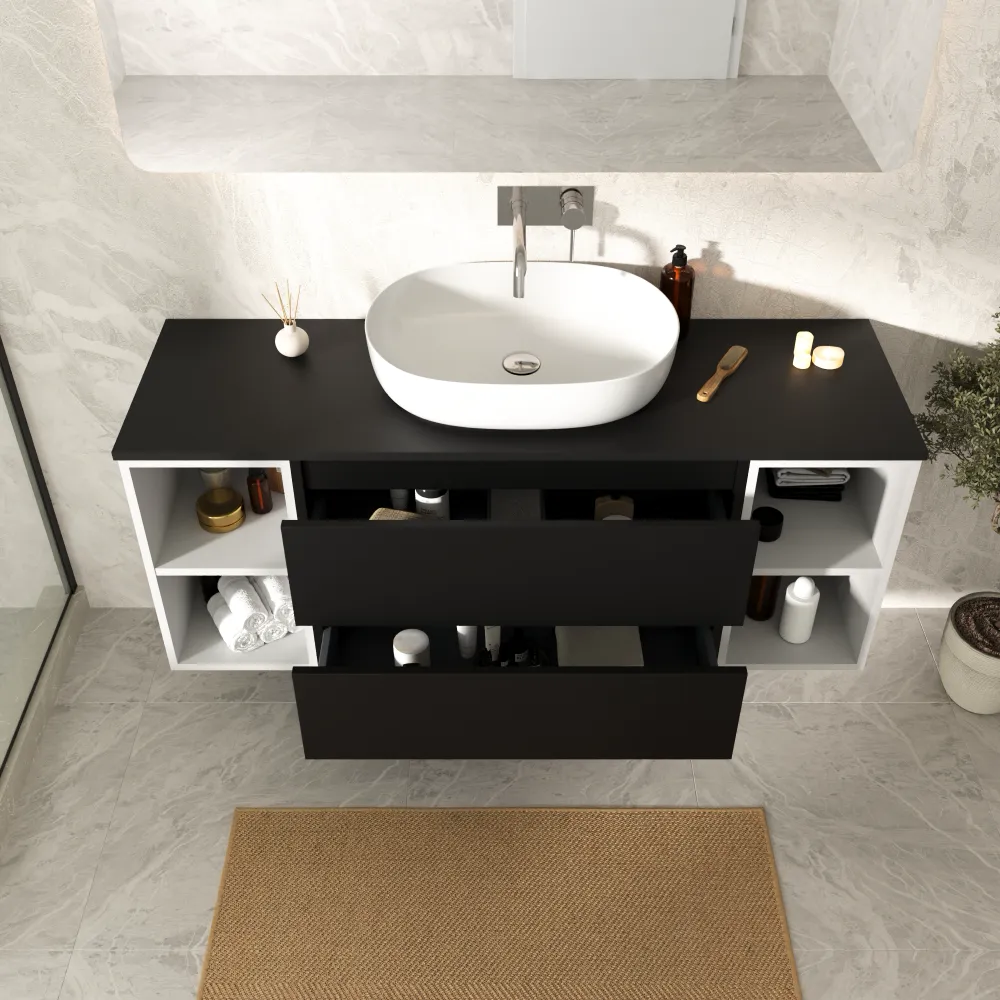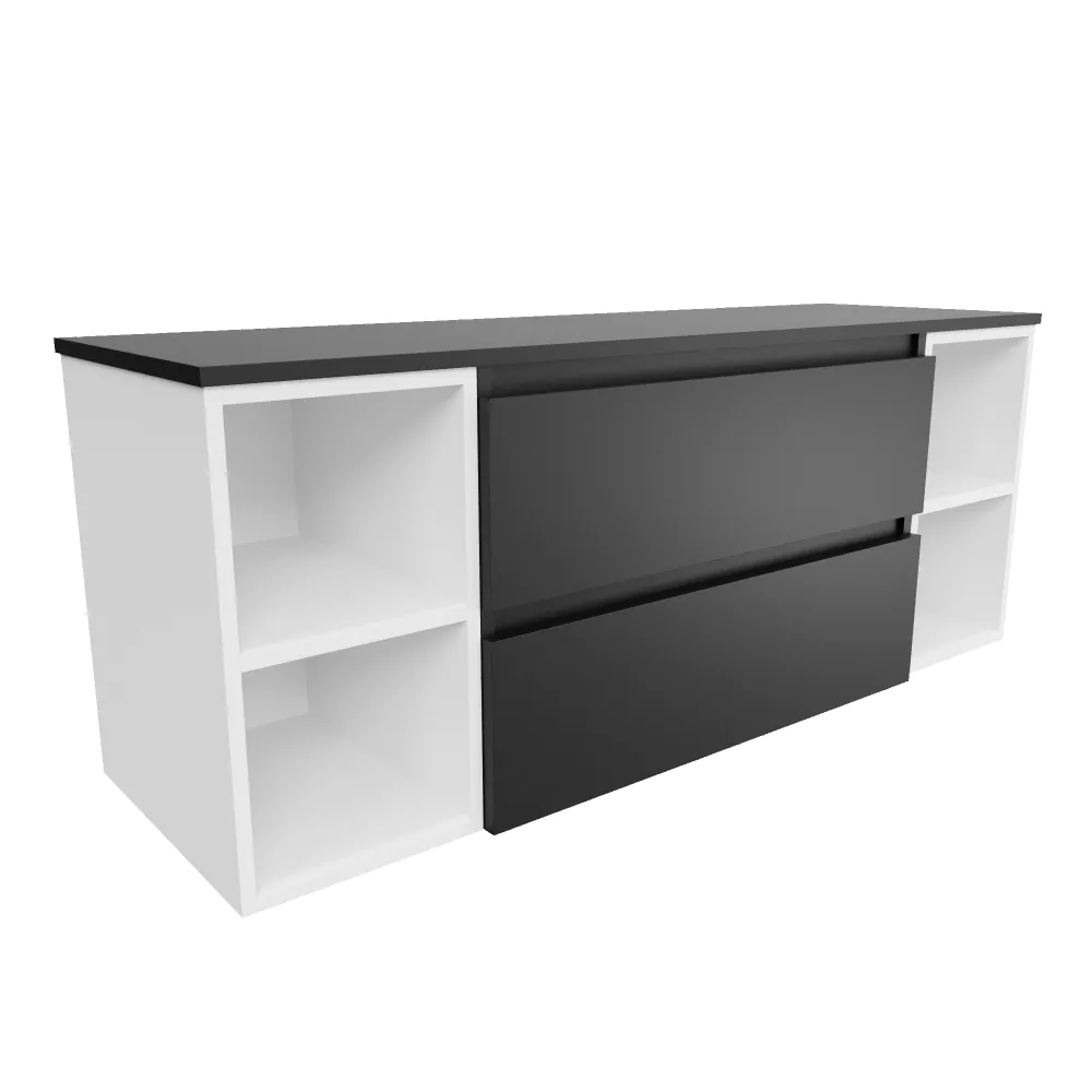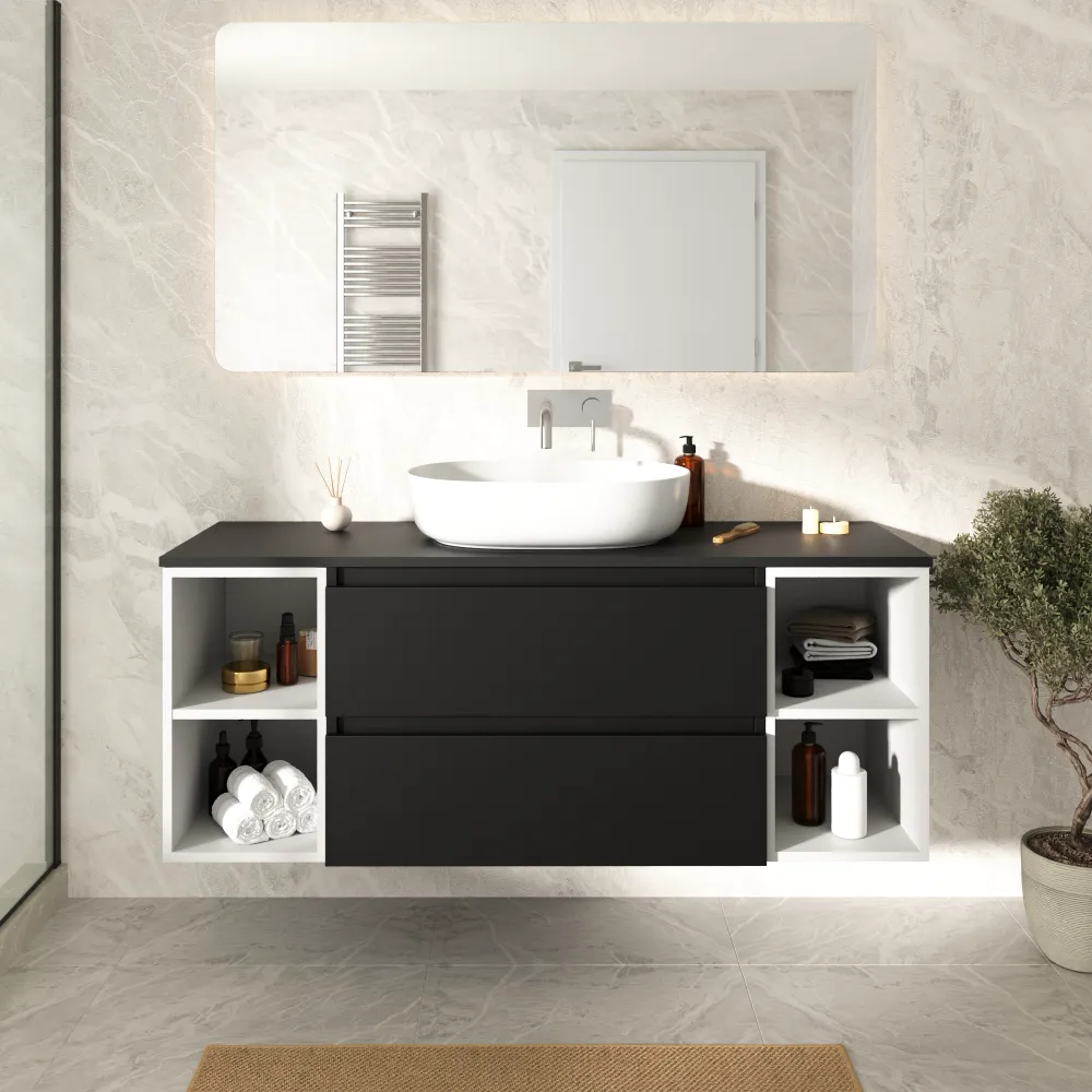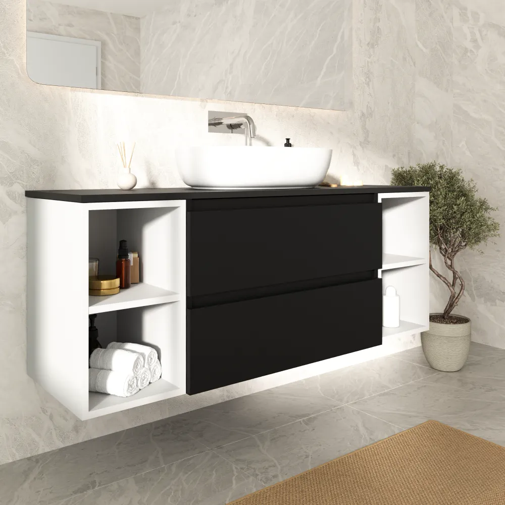 Mobile bagno sospeso 140cm due cassetti nero opaco e due vani a giorno bianco opaco con top | Hexa
