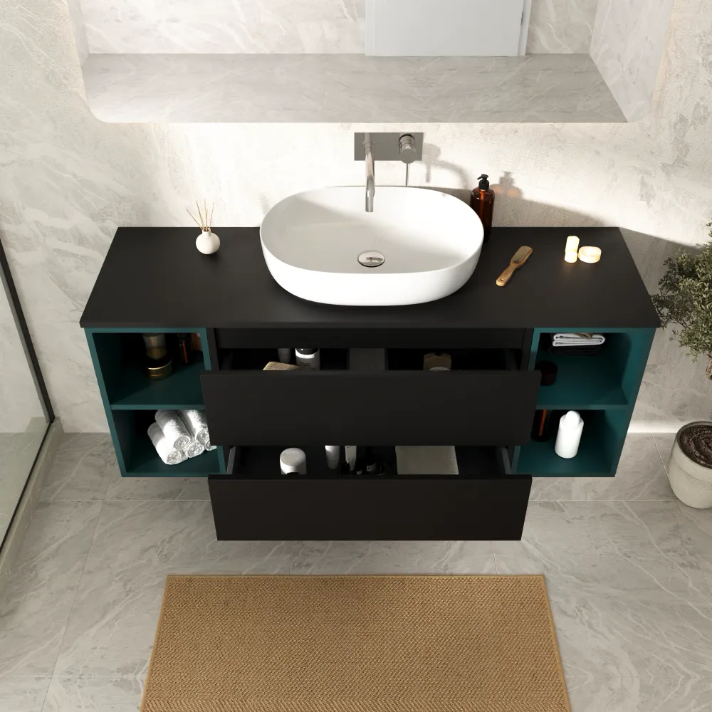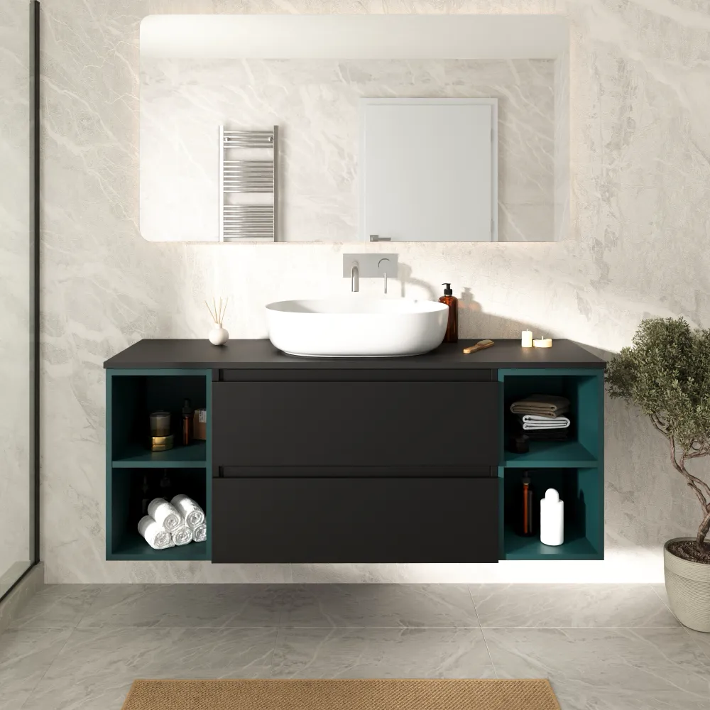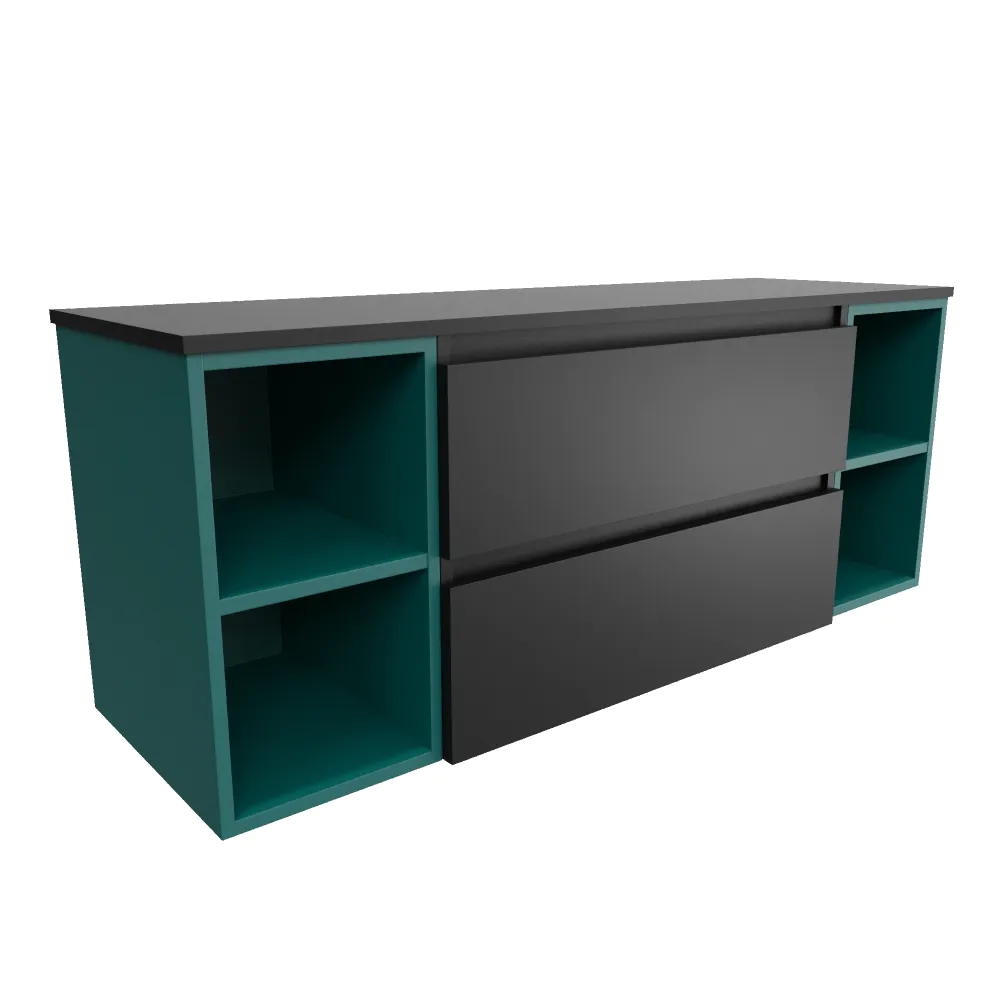 Mobile bagno sospeso 140cm due cassetti nero opaco e due vani a giorno petrol con top | Hexa